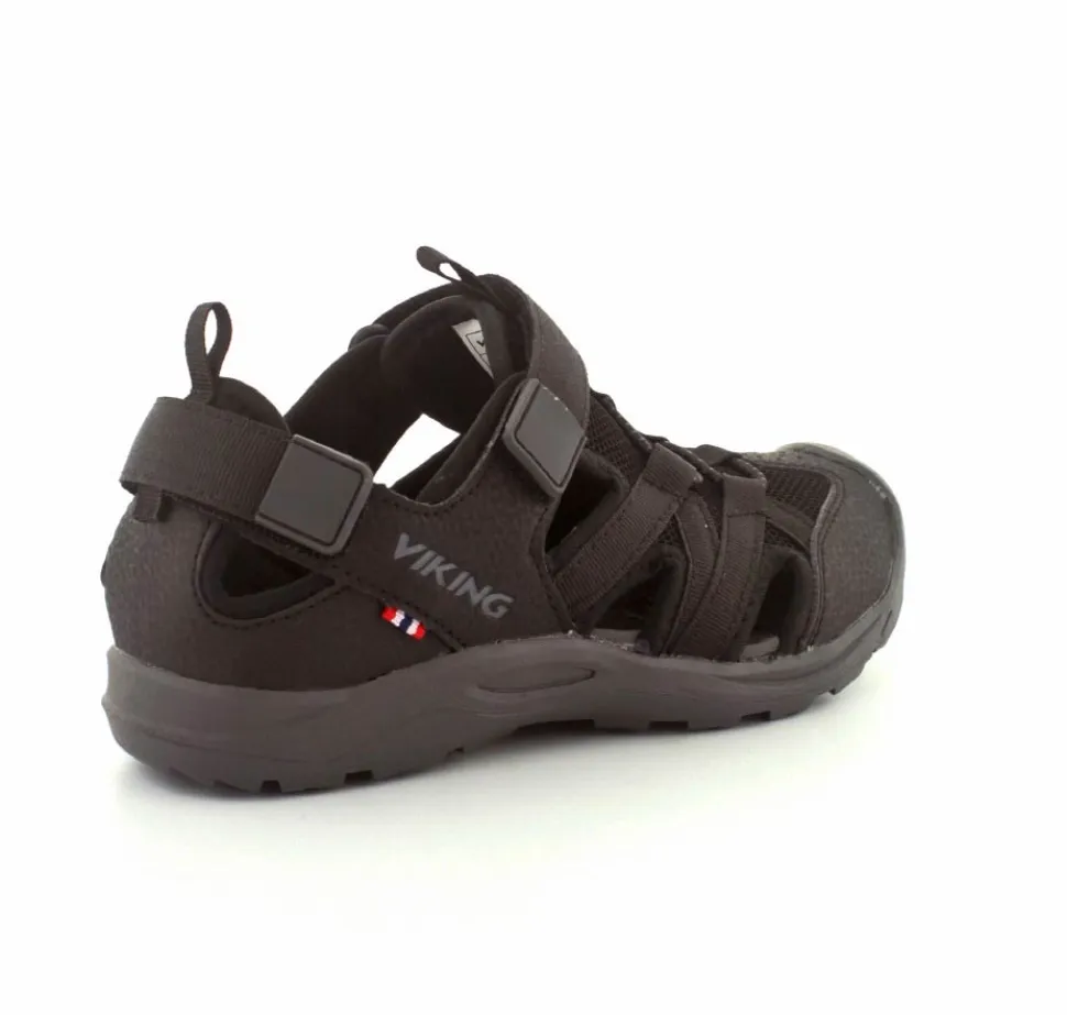 Super god sportssandal fra Viking model Adventure Jr. i sort. Sandalen er lidt som en sko med huller i. Der er gummi på snuden og to regulerbare velcroremme. God plads i bredden. Sandalskoen kan tåle vand og har bløde og fleksible såler under bunden. Super god til den dreng der ikke vil have en rigtig sandal.