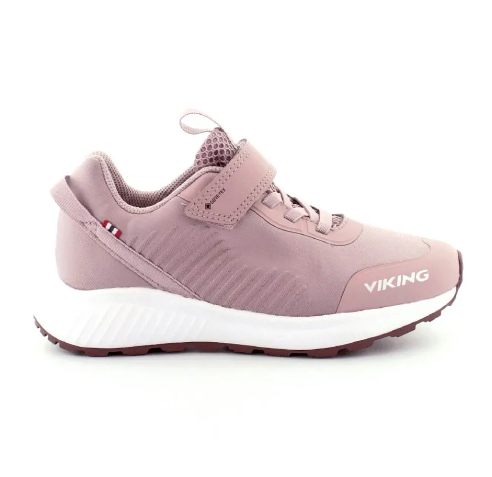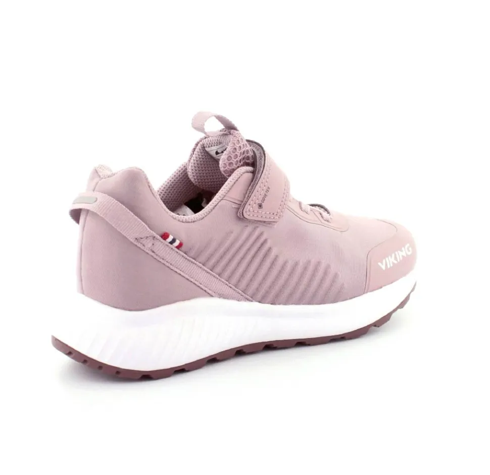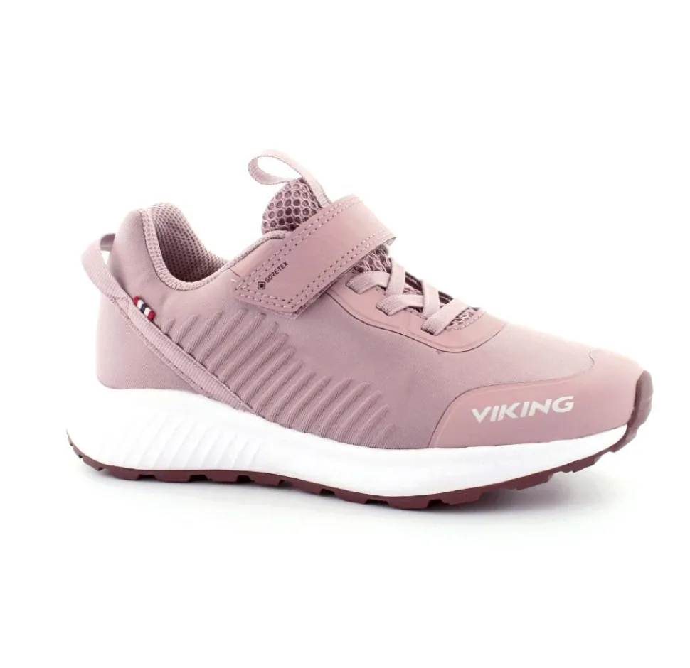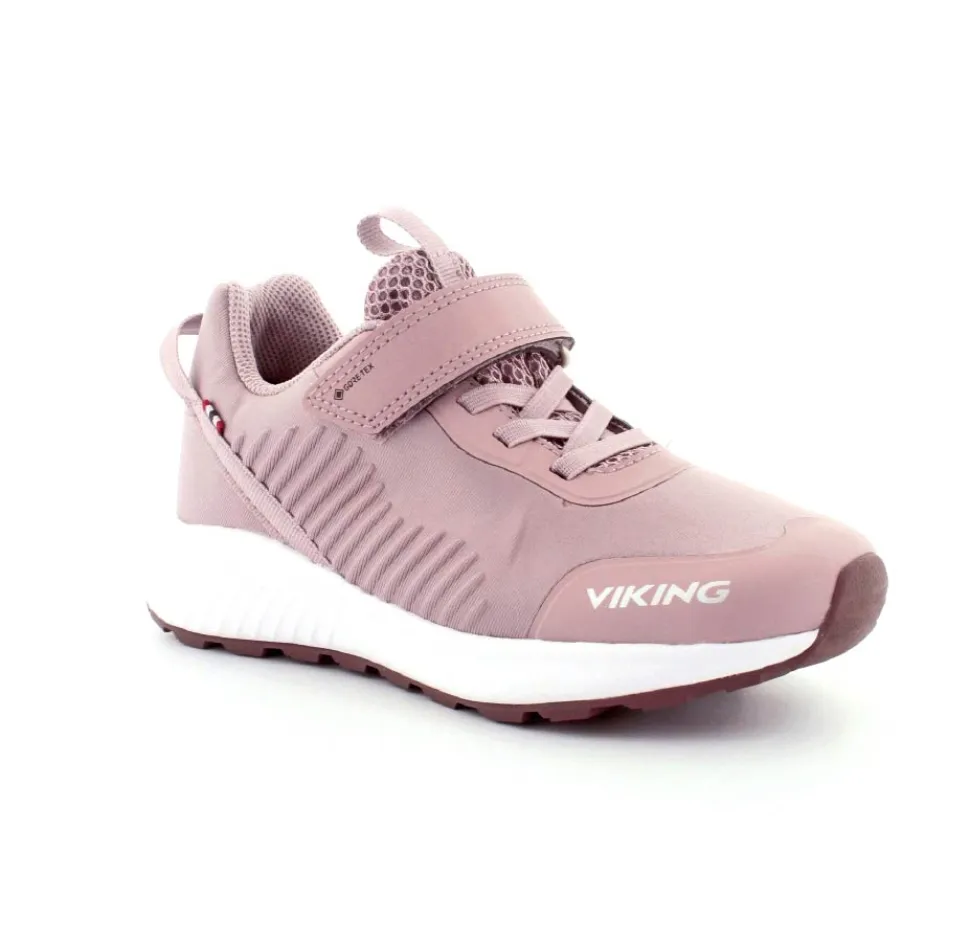 Super flot og god vandtæt sneakers fra Viking model Aery Tau Low GTX. Skoen er i en flot gl. rosa farve med både velcrorem og elastiksnøre. Nem at komme i og godt hold på foden. Aftagelige indlægssåler og gode gummisåler under bunden. Skoen kan vaskes på 30 grader skånevask.