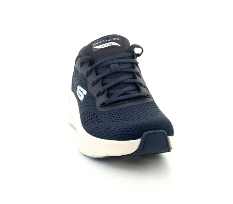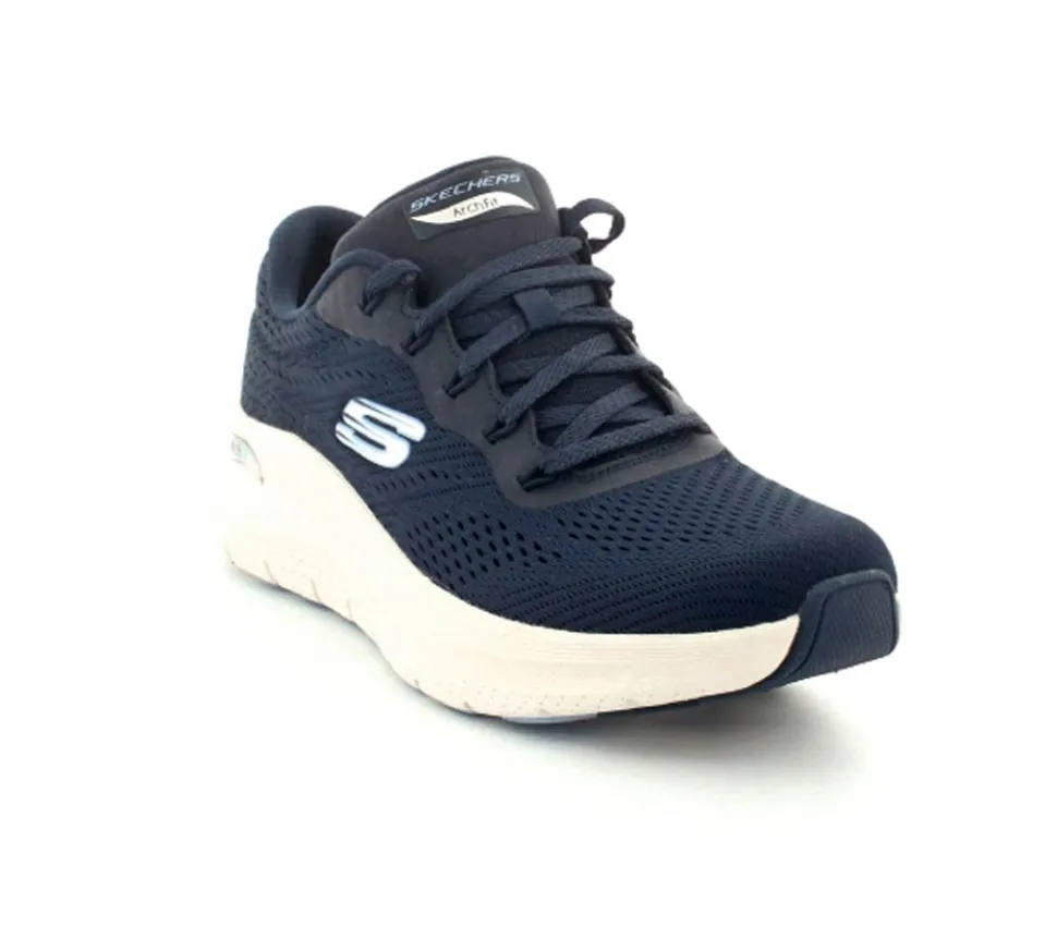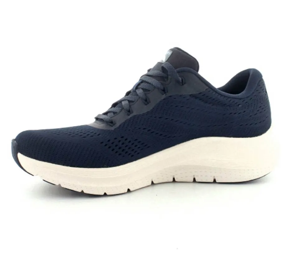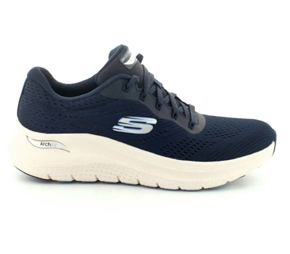 Skønne sneakers fra Skechers model Arch Fit Big i en flot mørkeblå. Skoen er med ekstra svangstøtte og aftagelige indlægssåler. Den har et super godt hold på foden og kan fint bruges til hverdag og til træning. Den er til den store side af størrelsen. Lette og stødabsoberende såler under hele bunden.