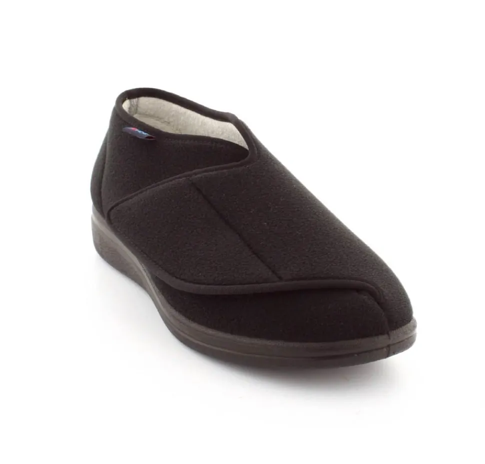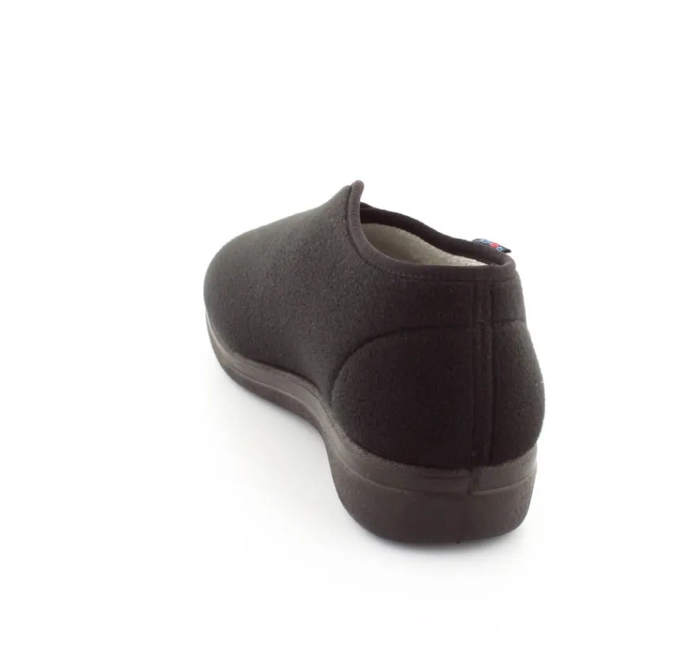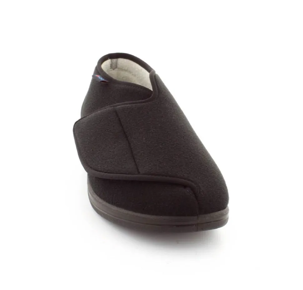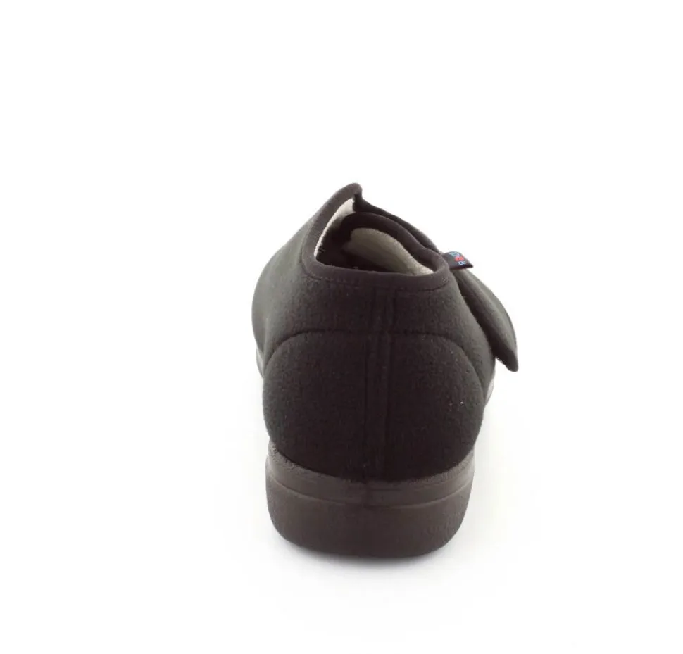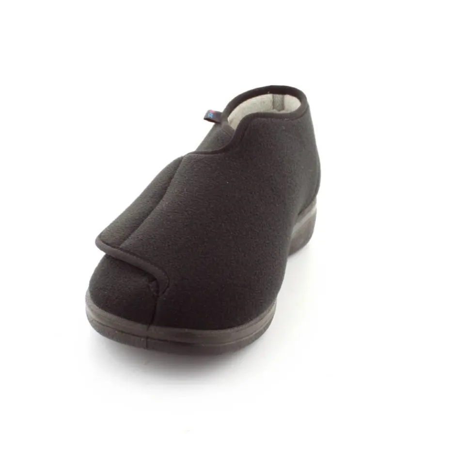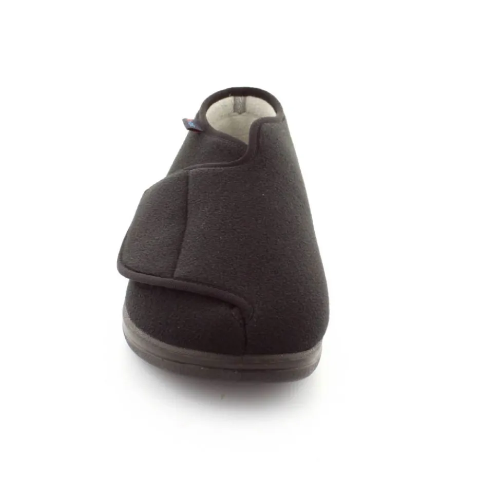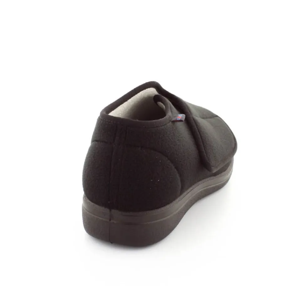 Rigtig god hjemmesko der kan passe alle fødder. Skoen er fra Rohde og lavet i et vaskbar materiale. Der er en stor velcrorem henover foden, så den kan passe alle brede og hævede fødder. Aftagelig indlægssål i uld.