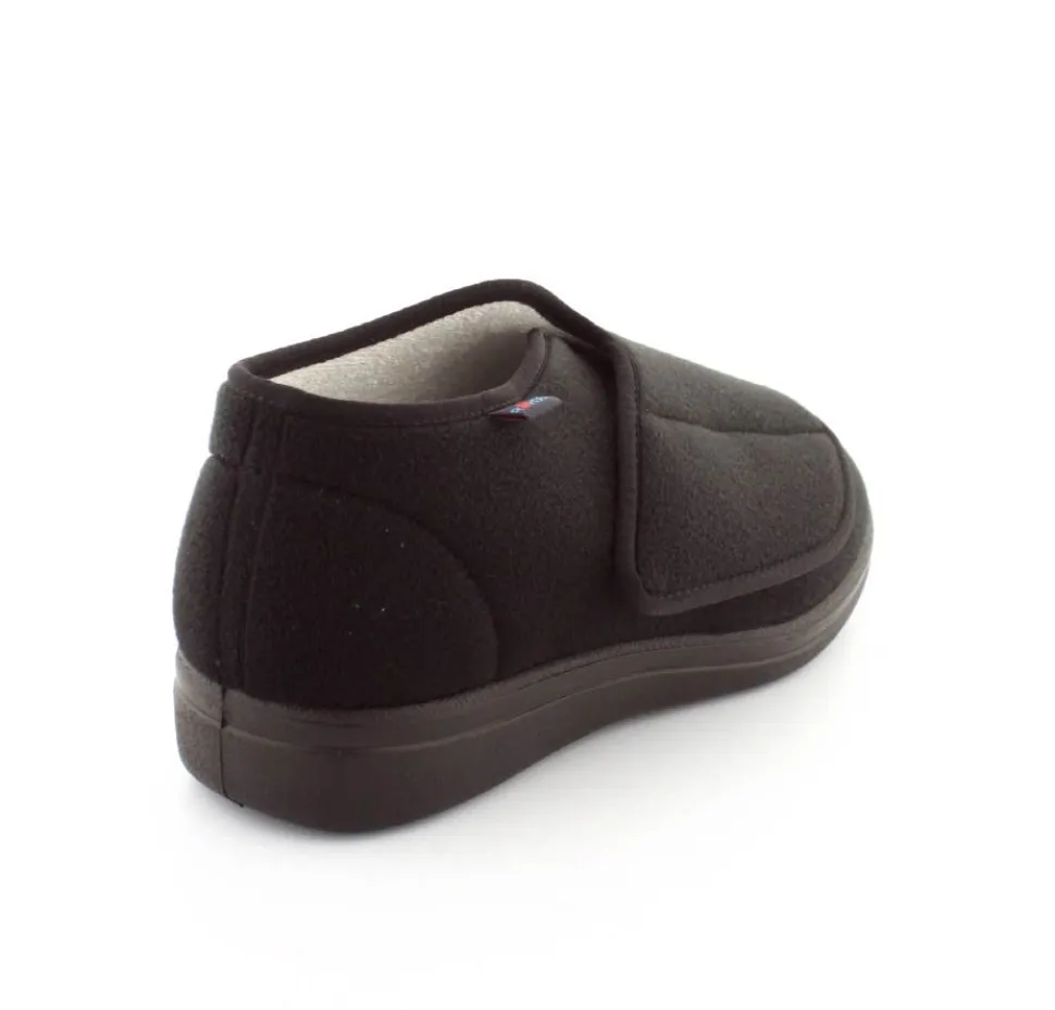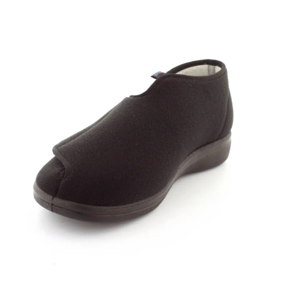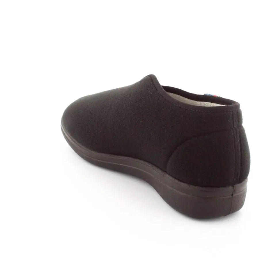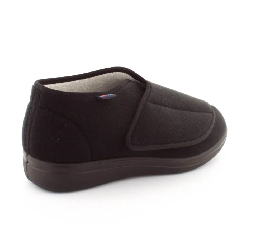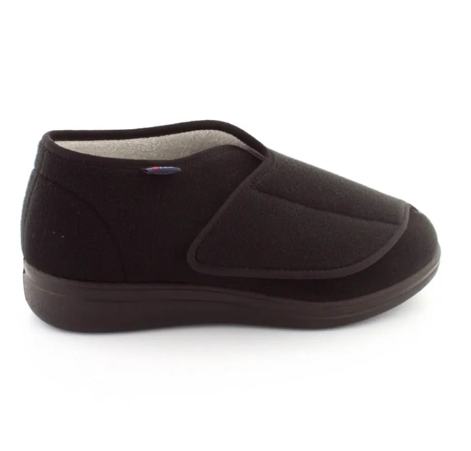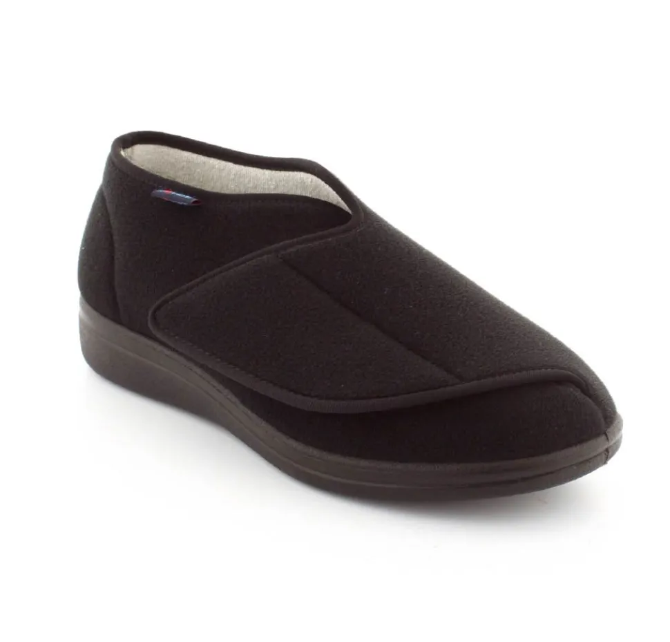 Rigtig god hjemmesko der kan passe alle fødder. Skoen er fra Rohde og lavet i et vaskbar materiale. Der er en stor velcrorem henover foden, så den kan passe alle brede og hævede fødder. Aftagelig indlægssål i uld.