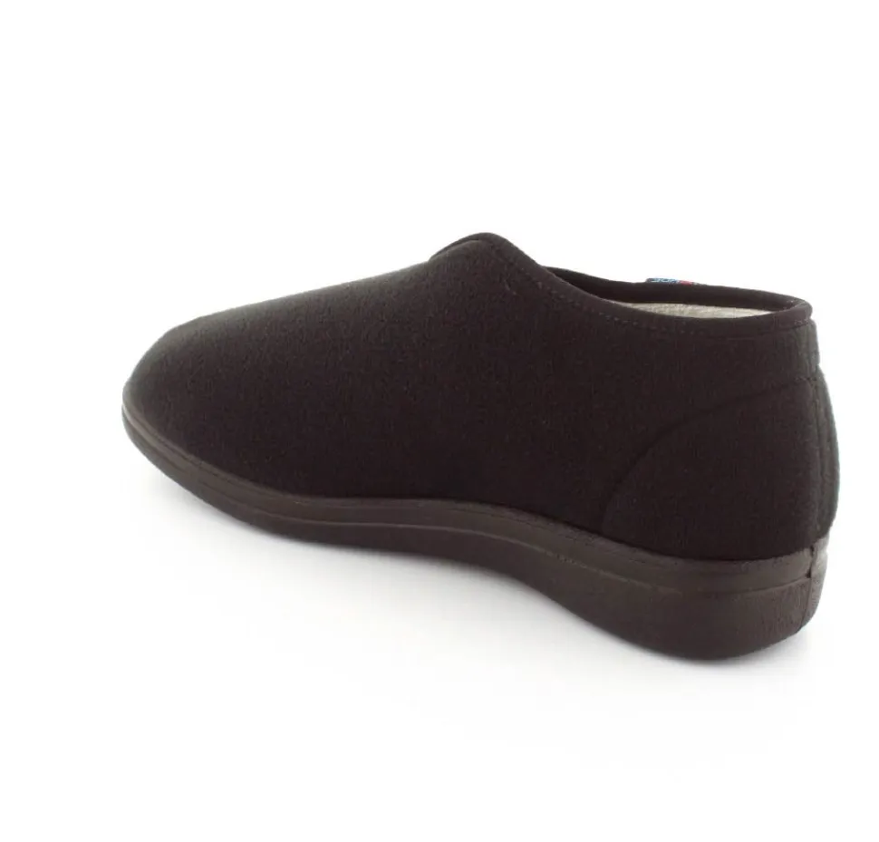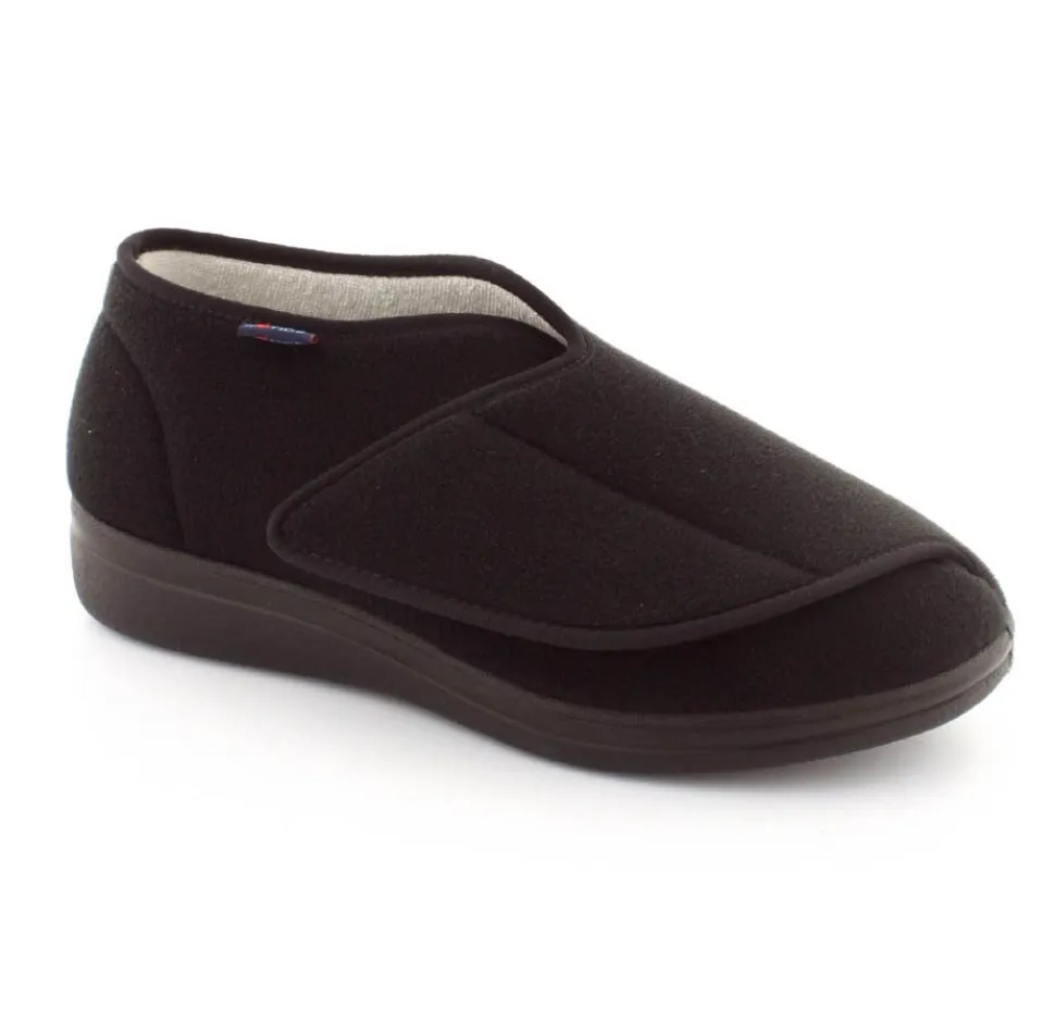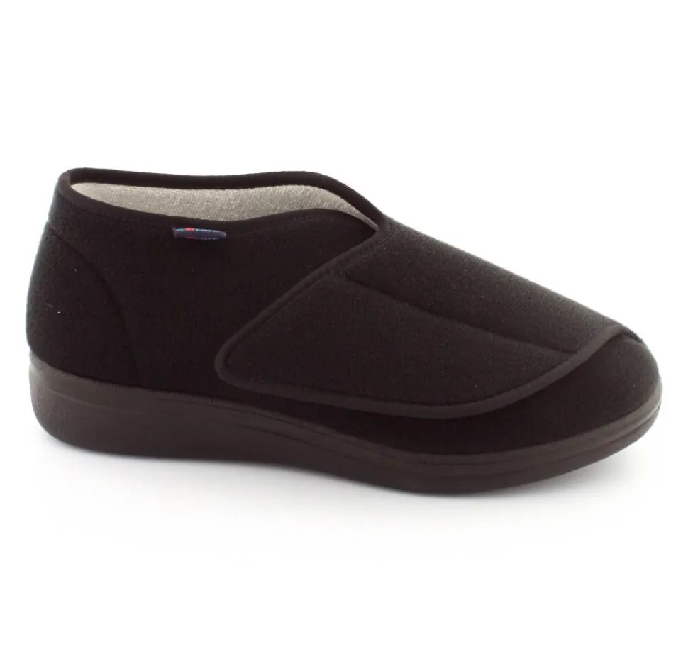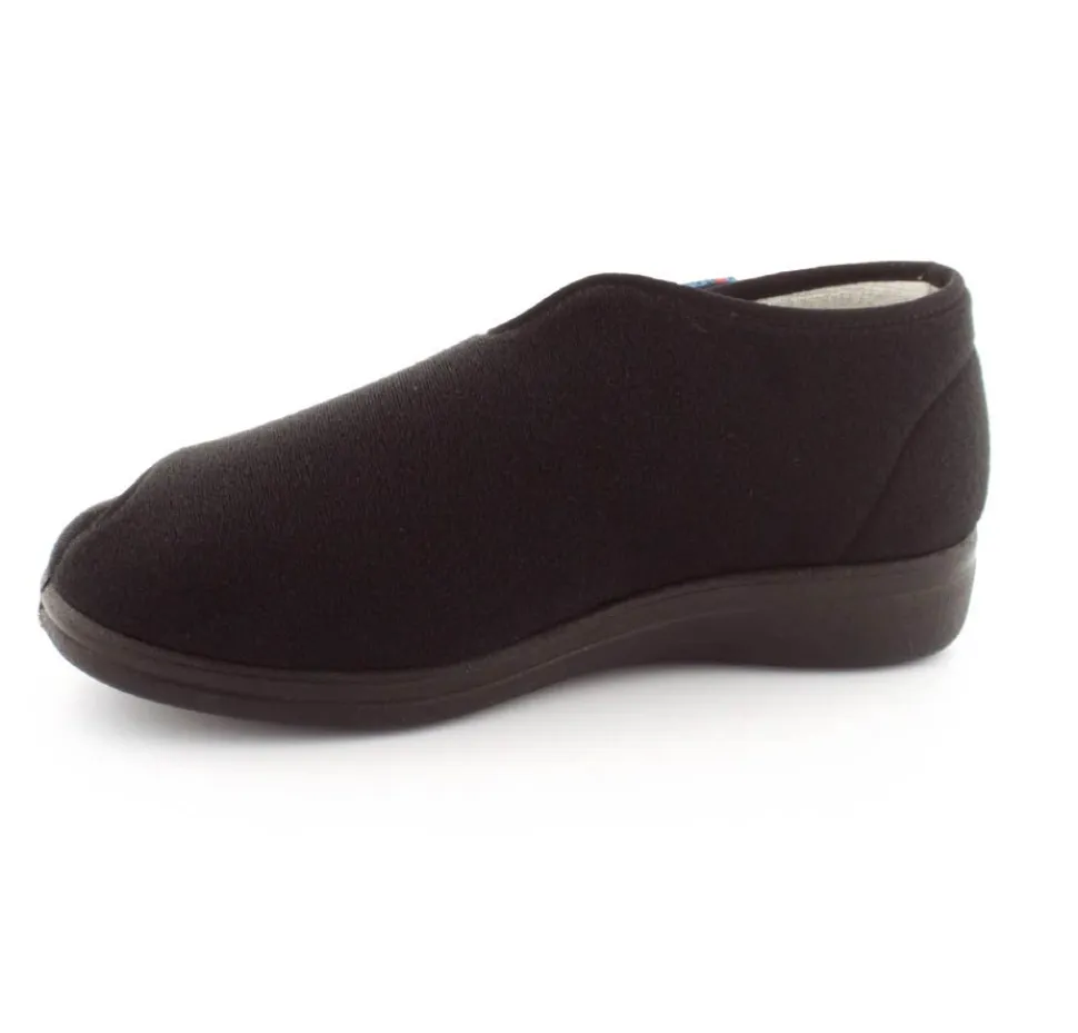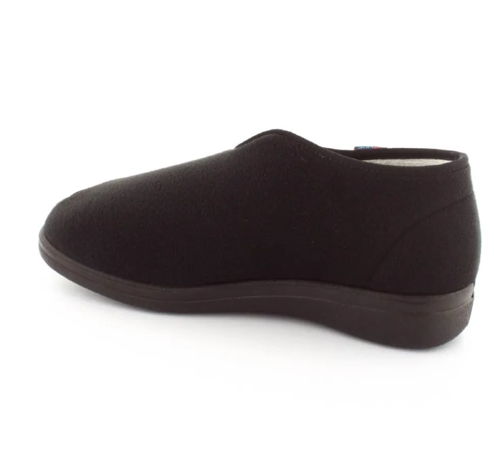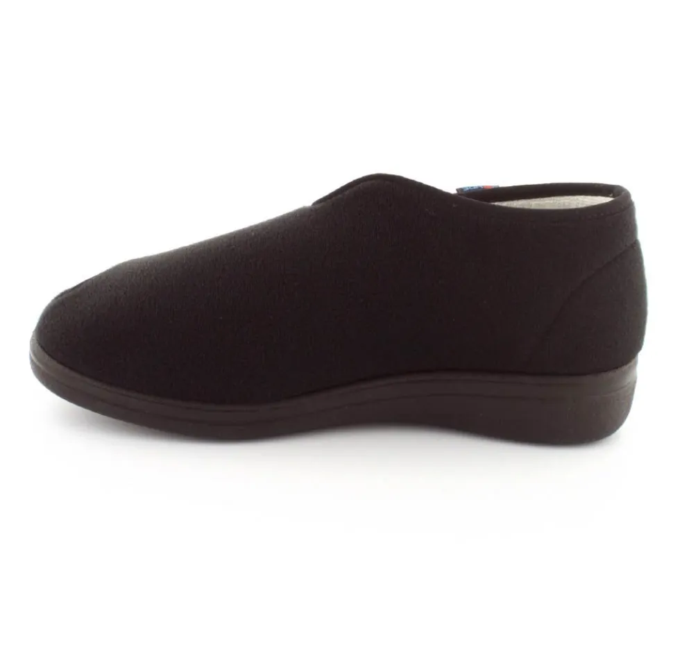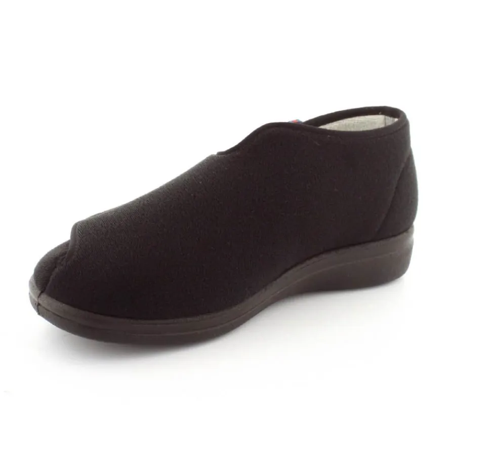 Rigtig god hjemmesko der kan passe alle fødder. Skoen er fra Rohde og lavet i et vaskbar materiale. Der er en stor velcrorem henover foden, så den kan passe alle brede og hævede fødder. Aftagelig indlægssål i uld.