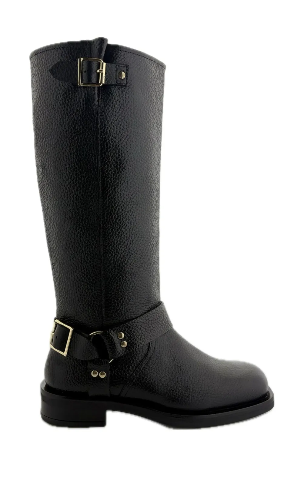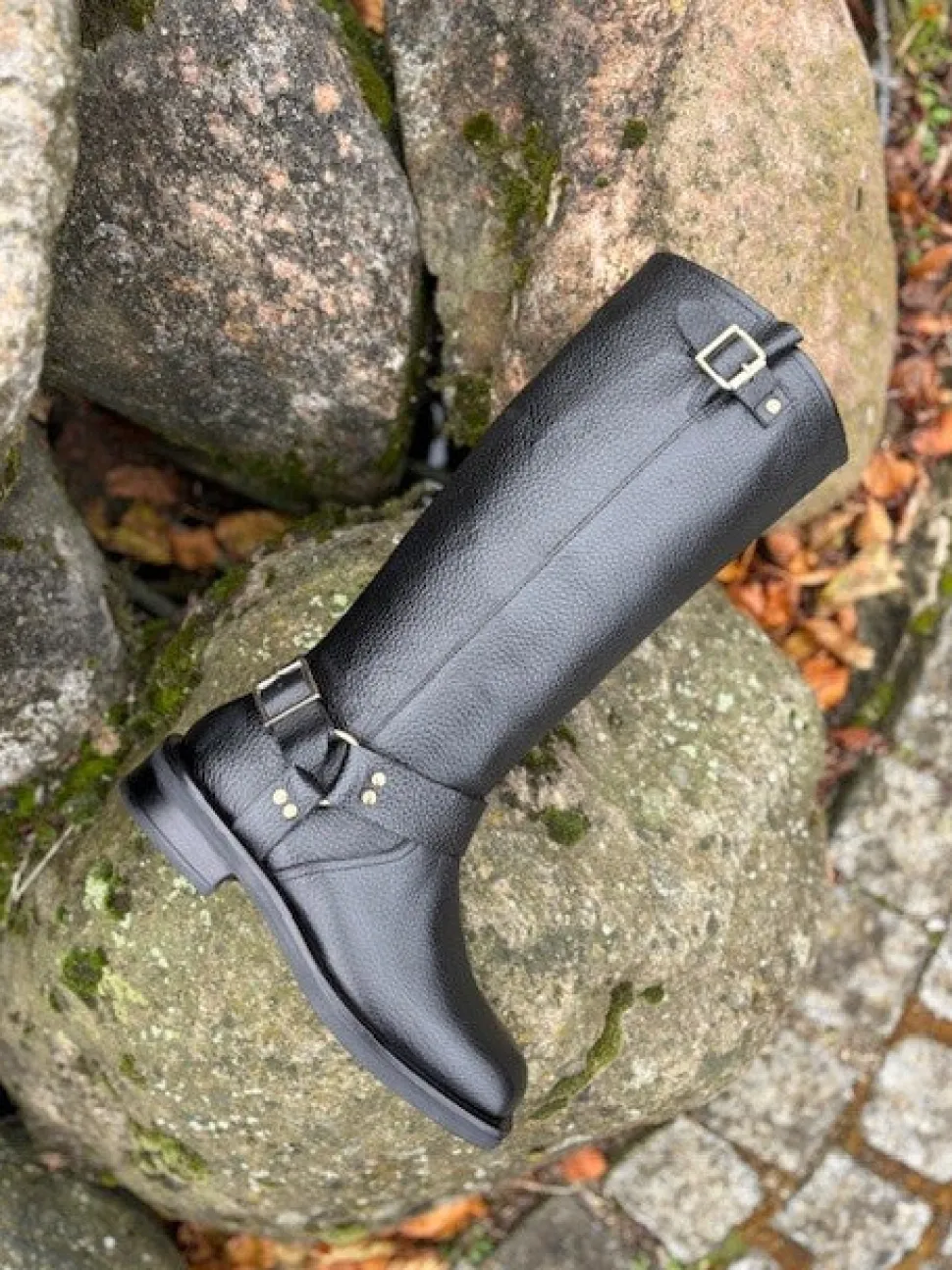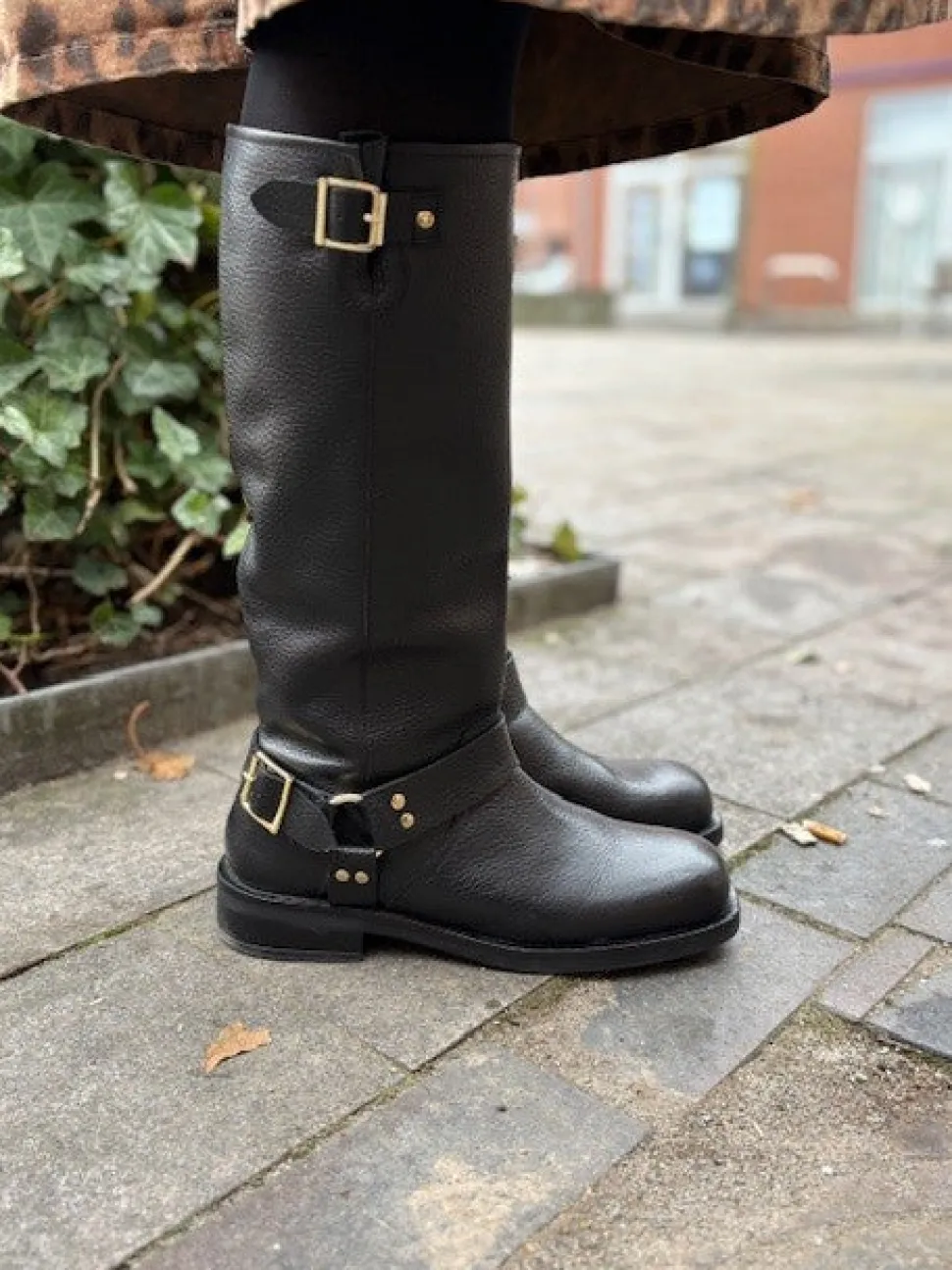 Langskaftet støvle i skind fra Copenhagen Shoes. Støvlen har et bikerlook, og er udstyrret med et elastik bånd i toppen af skaftet på bagsiden af støvlen. Støvlen er bred i skaftet, hvilket gør den nem at trække på.