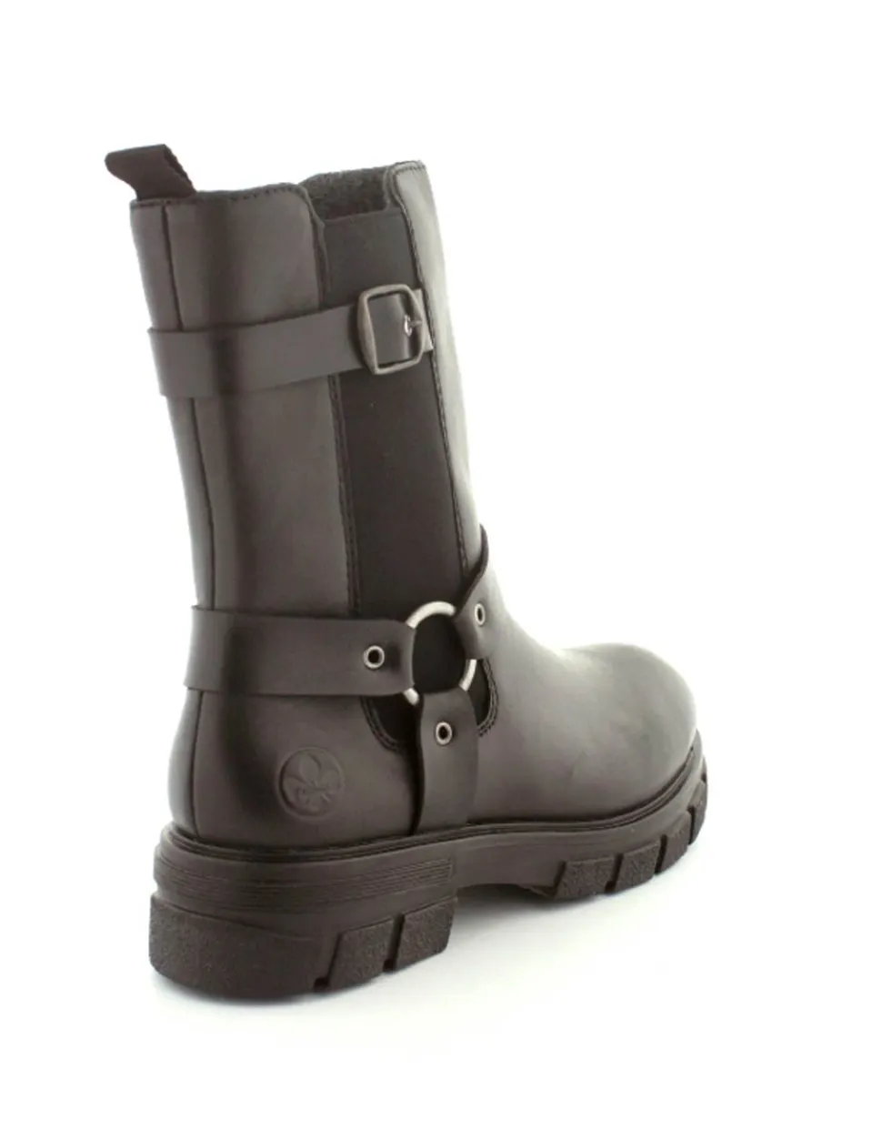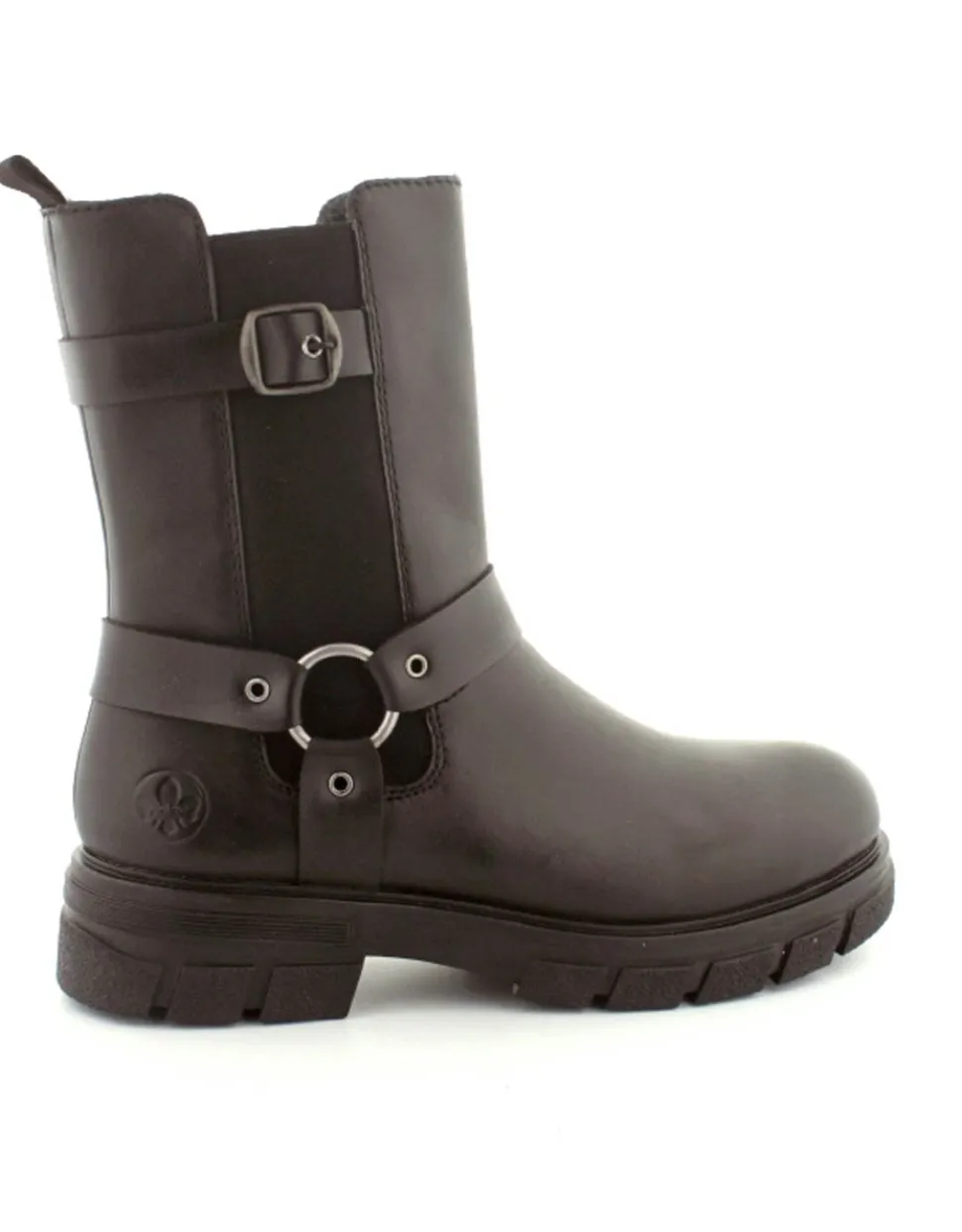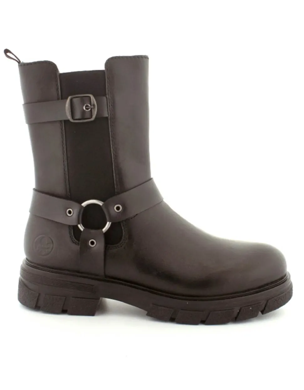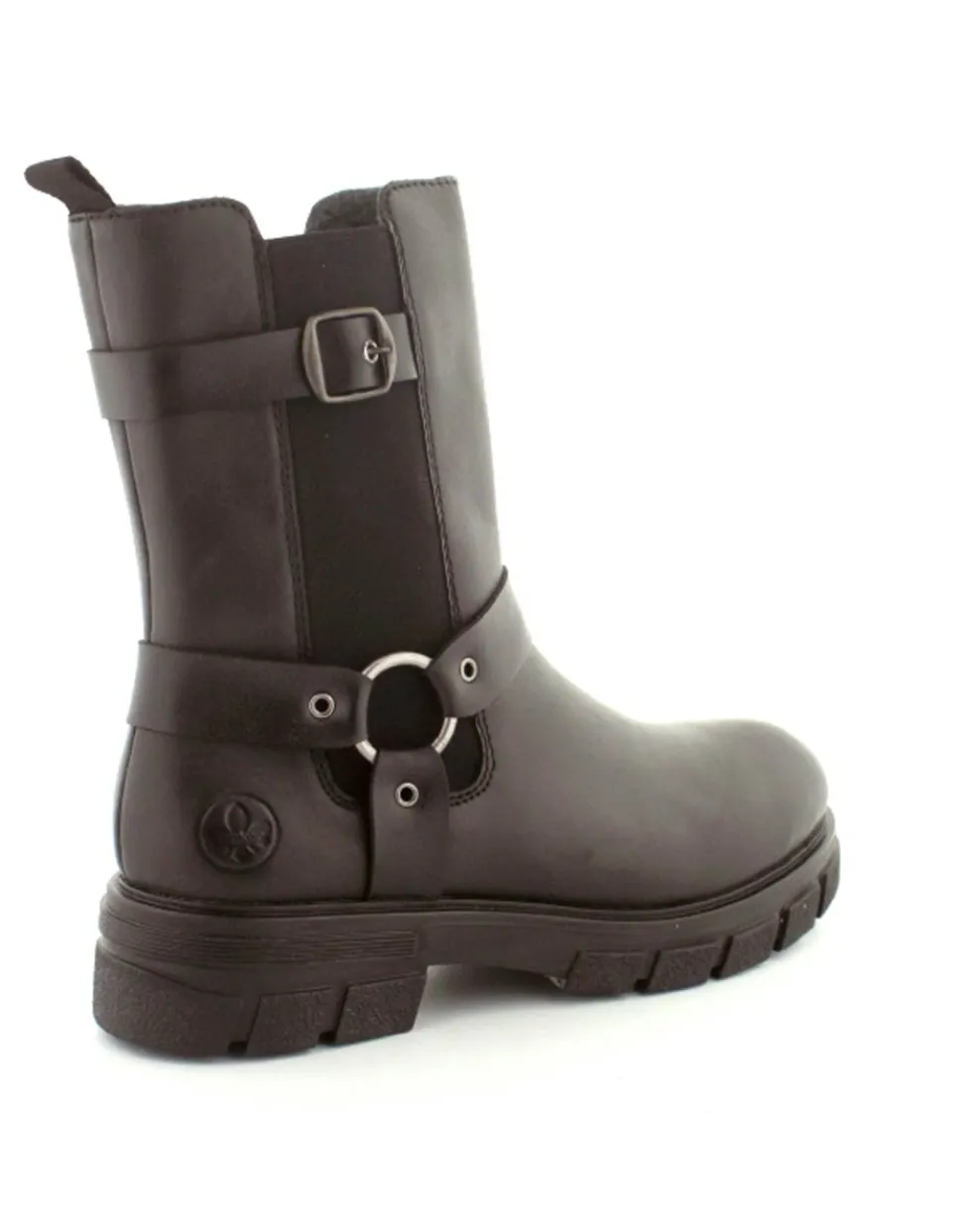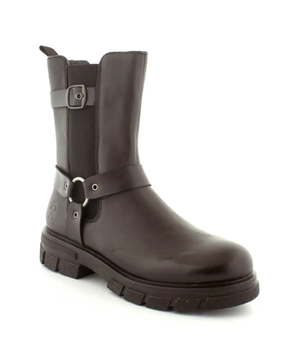Super smart bikerstøvle i skind fra Rieker. Støvlen er i sort med gode detaljer på siden. Der er elastik på ydersiden og lynlås på indersiden, så nem at få på. Gode solide gummisåler og dejlig lunt foer indeni.