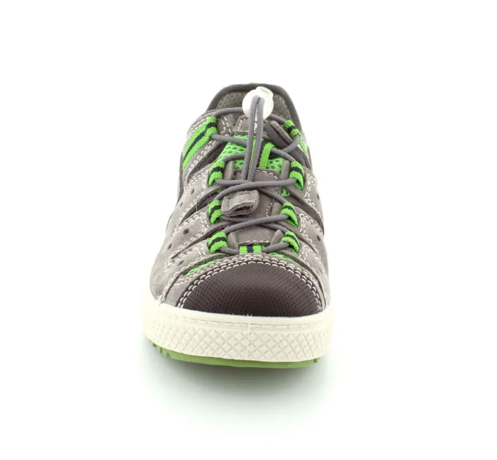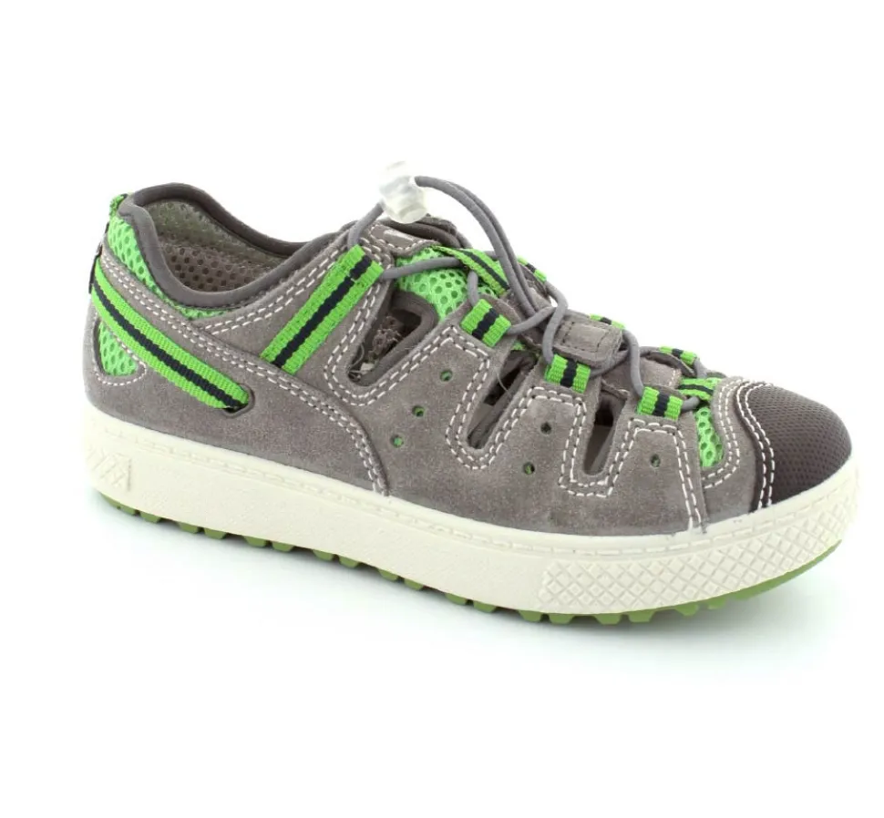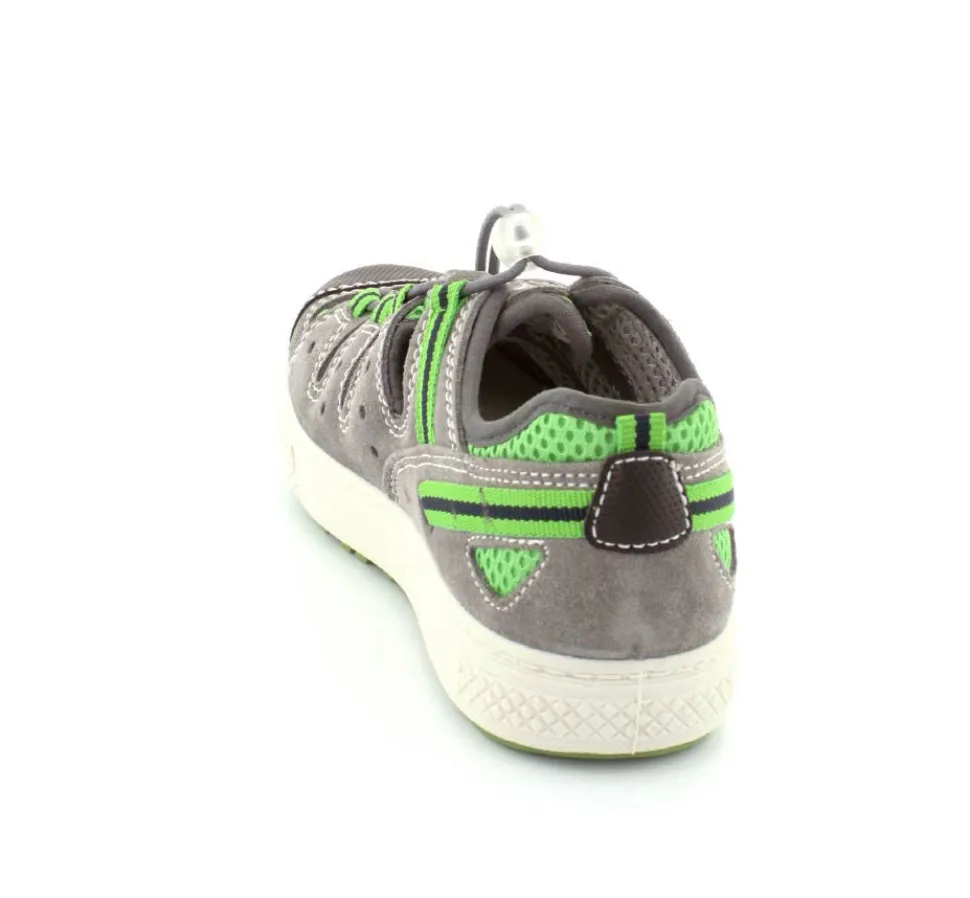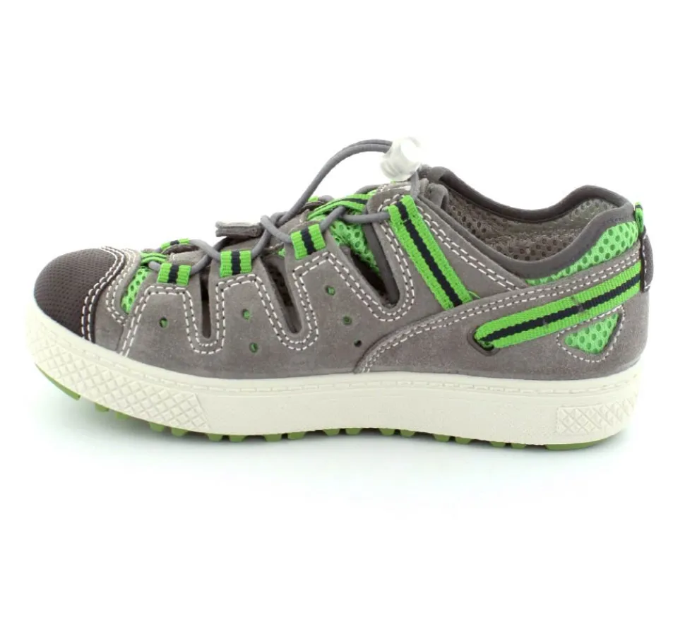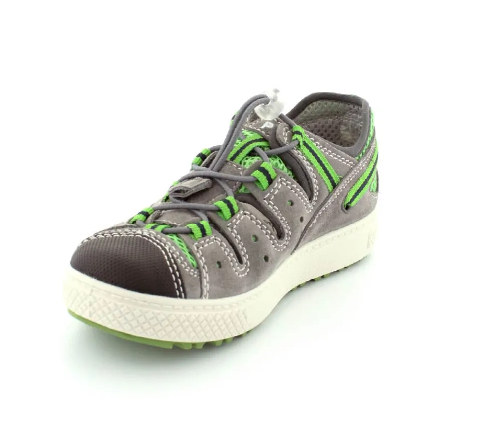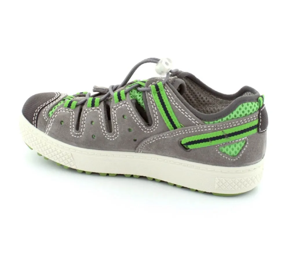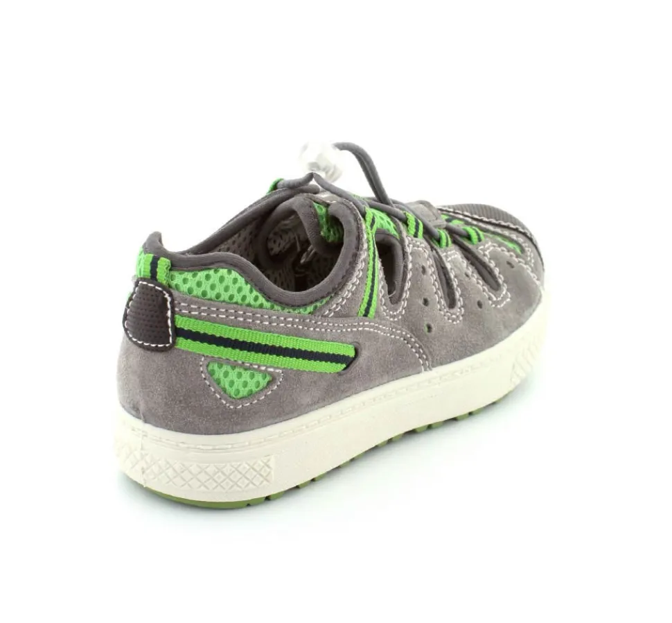 Smart sko til de drenge der ikke vil have sandaler. Skoen er fra Primigi model Dafydd og lavet i en kombination af gråt ruskind med grønne detaljer på. Skoen er med elastiklukning, så den er nem at tage på. Lufthuller til foden og aftagelige skinddæksåler indeni. Skoen fra Primigi er meget let og har bløde fleksible og stødabsoberende såler under bunden.