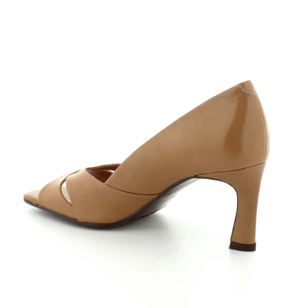 Super flotte og elegante pumps fra Billi Bi i skind med lak. Farven har en lækker brun nuanche der passer til det hele. Der er fast hælkappe og åben tå. Forstykket dækker foden flot ind og rummer fint. Den er lidt til den store side. Skindfoer indeni.