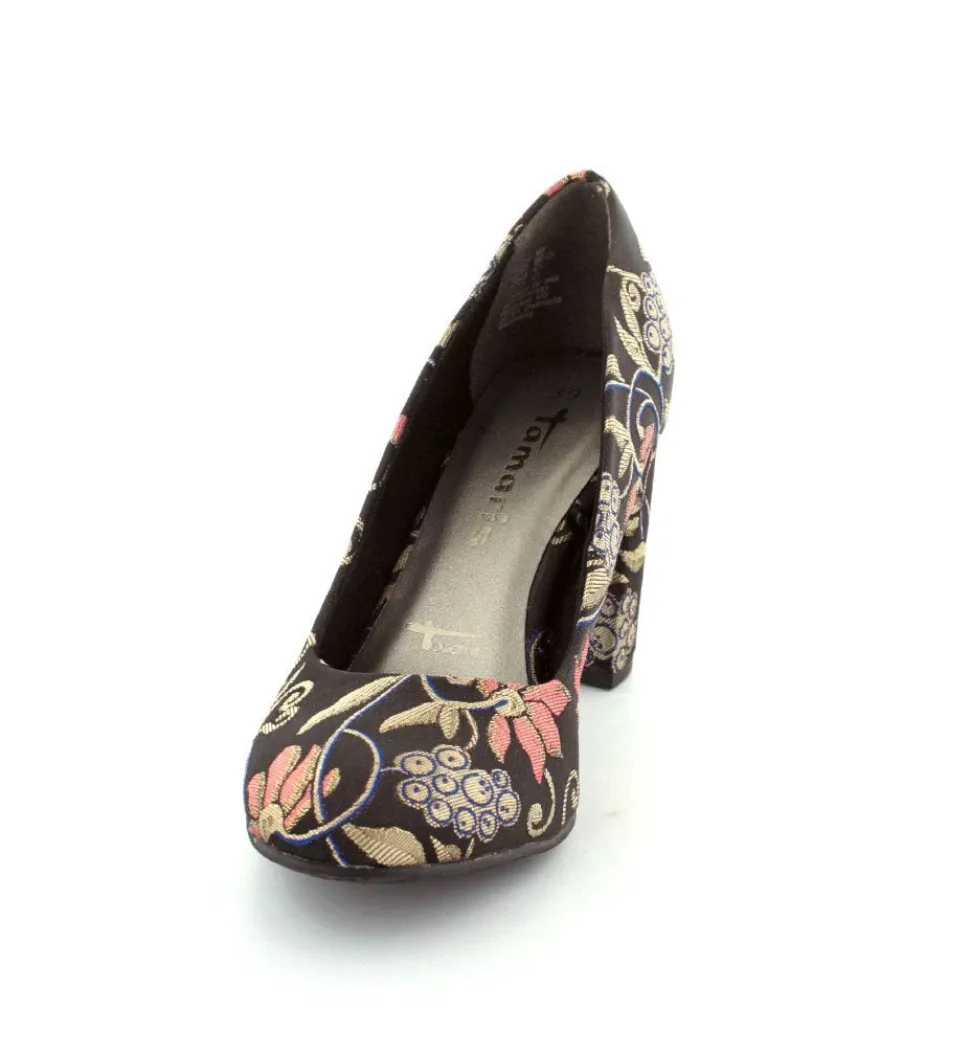 Super flot pump fra Tamaris i sort tekstil med blomstermotiv på. Skoen passer til rigtig meget af det blomstrede tøj der er, men er også flot til helt ensfarvet tøj. Skoen fra Tamaris er med en god bred hæl, der er nem at gå på. Den indvendige sål er med “Touch It” effekt, der er en blød tyk sål, der former sig efter foden.
