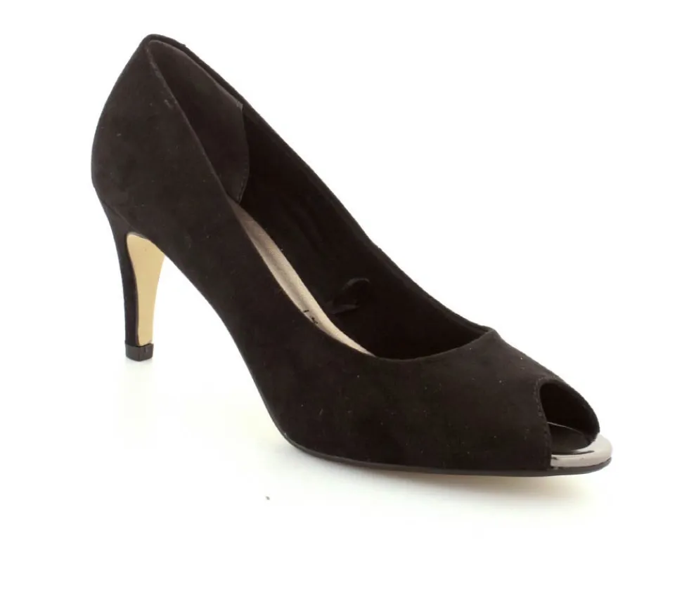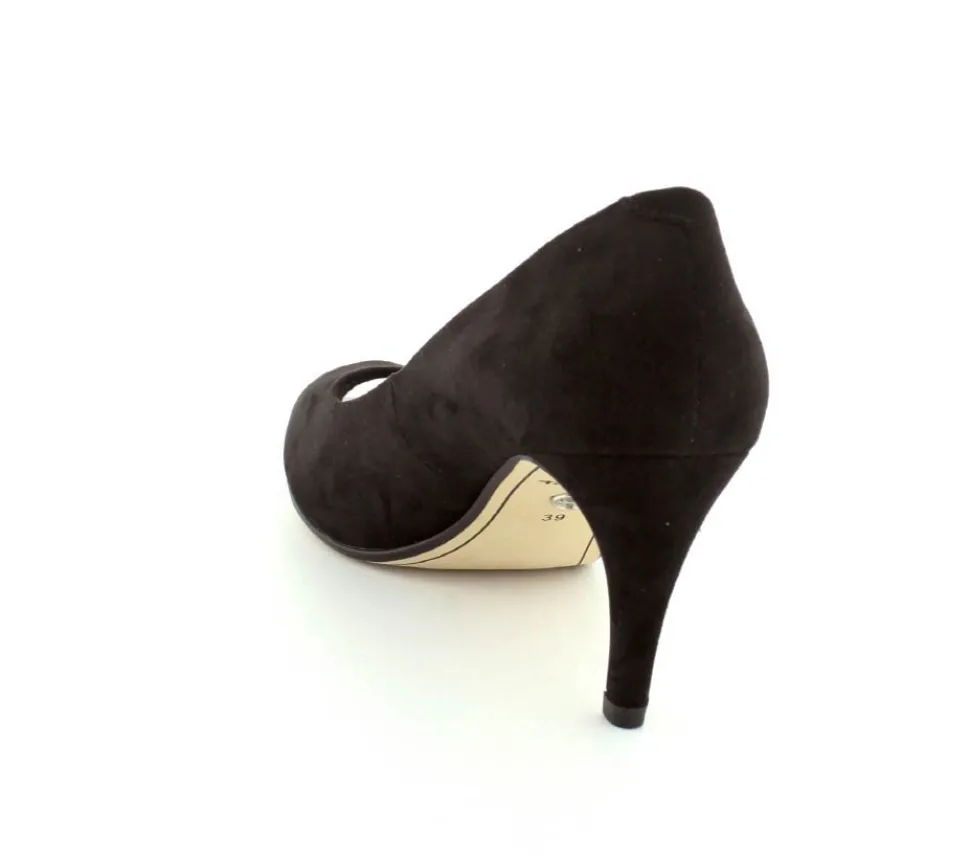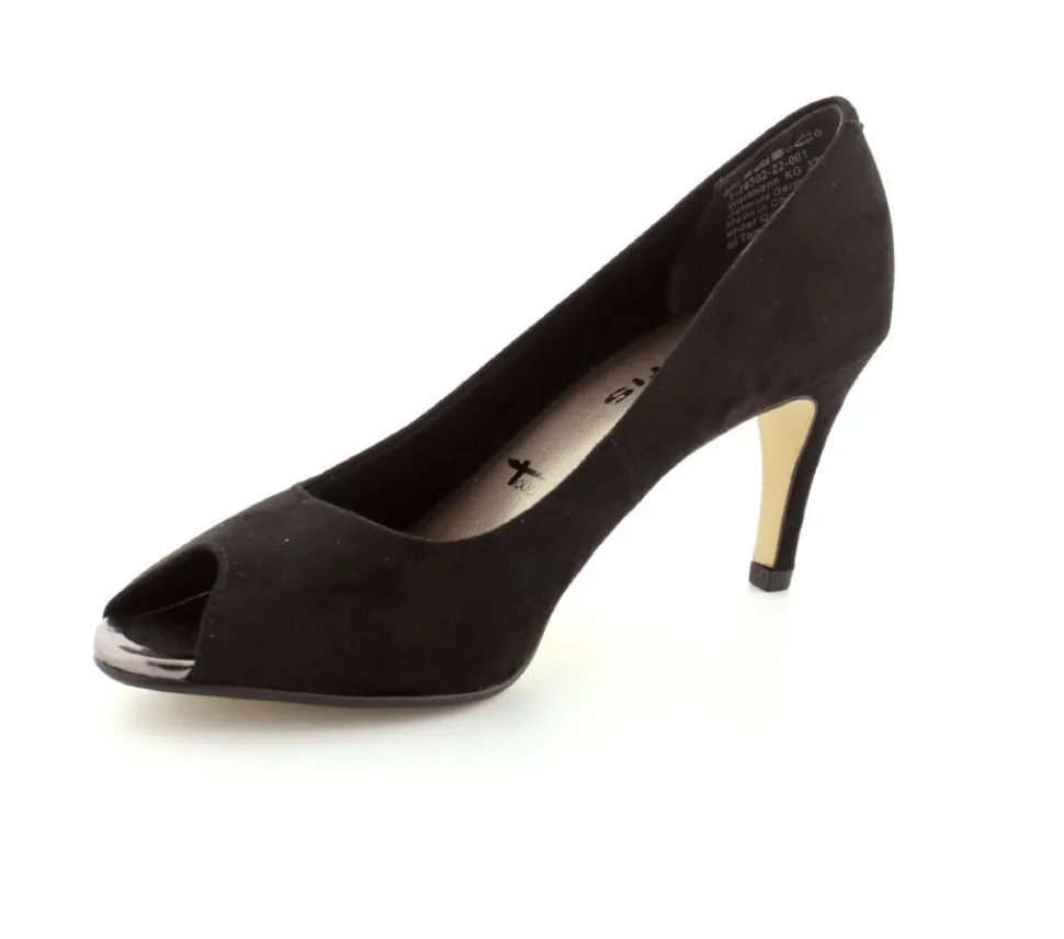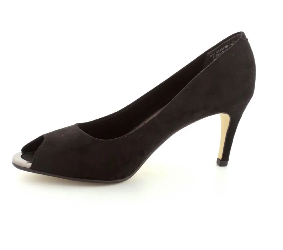 Flotte og elegante pumps fra Tamaris med peeptoe. Skoen er lavet i sort imiteret ruskind med god fast hælkappe og åben tå. Der er et godt hold på foden og bløde indersåler med “Touch It”, som former sig efter foden. Skoen fra Tamaris er med stilethæl og fleksible såler under forfoden.