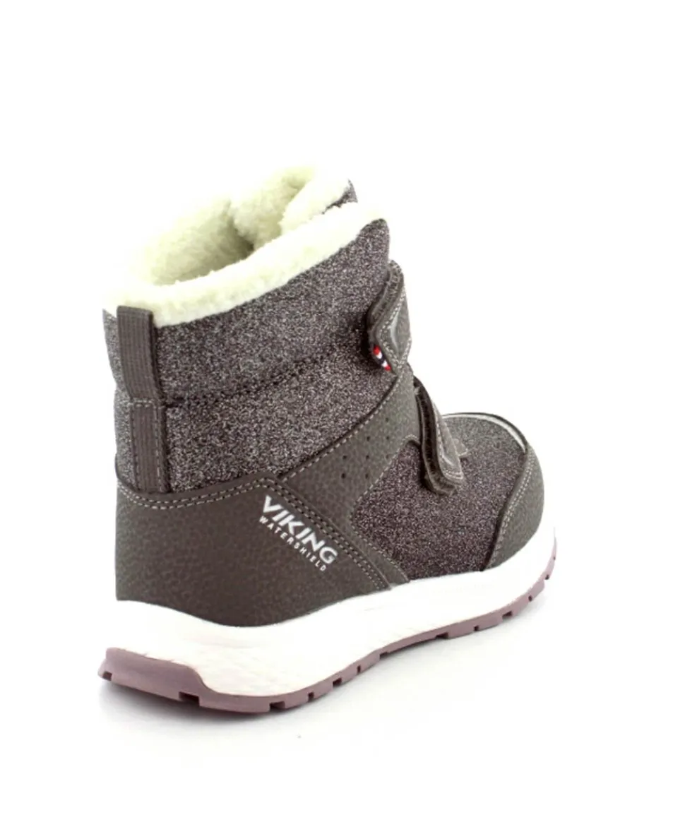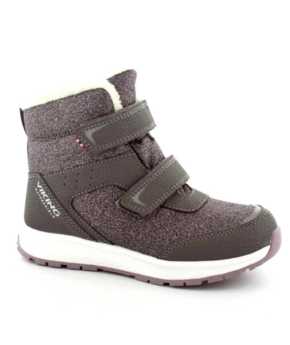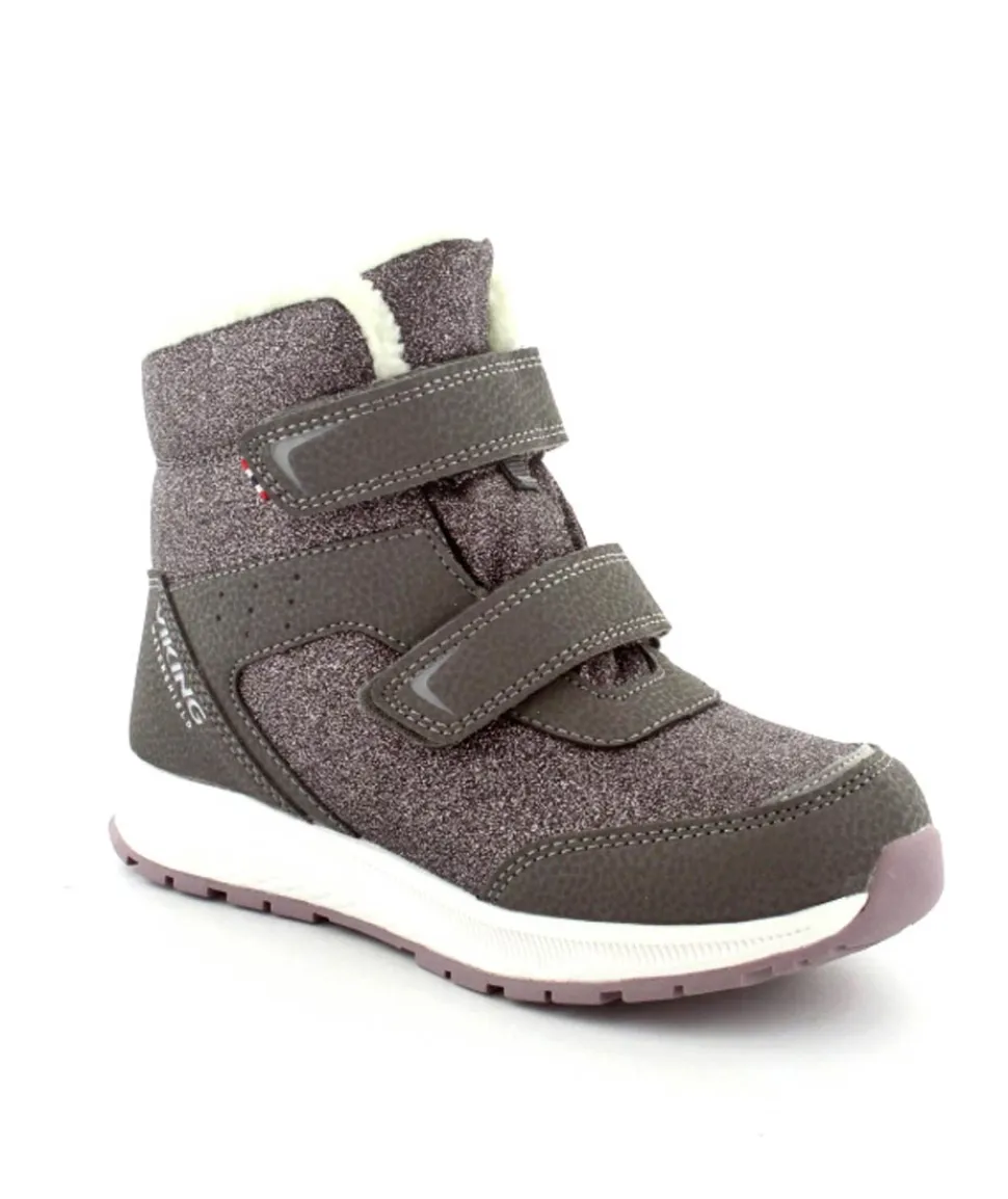 Super smarte vinterstøvler fra Viking model Equip Warm i metallic farve fyldt med glitter på. Støvlen er varmt foeret og med tex membran, så den kan klare sne og kulde. Der er to regulerbare velcropremme og gode fleksible gummisåler under hele bunden.