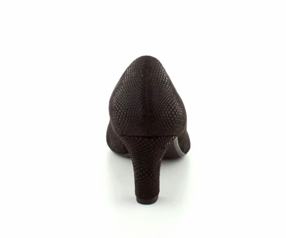 Flotte og elegante pumps fra Tamaris i sort tekstil med lidt sort skinnende print på. Skoen er en kendt model med den lidt brede stilethæl, der er nem at gå på. Bløde Touh It såler indeni.
