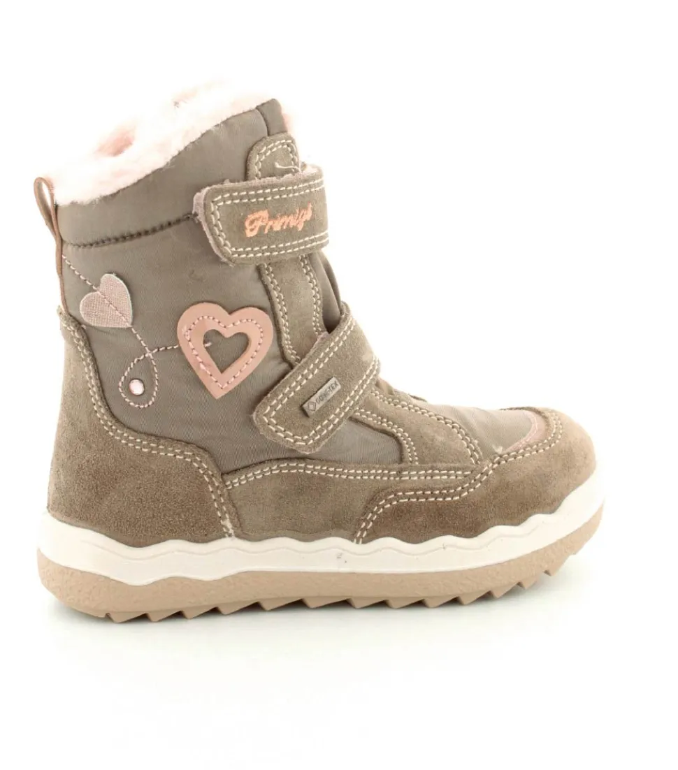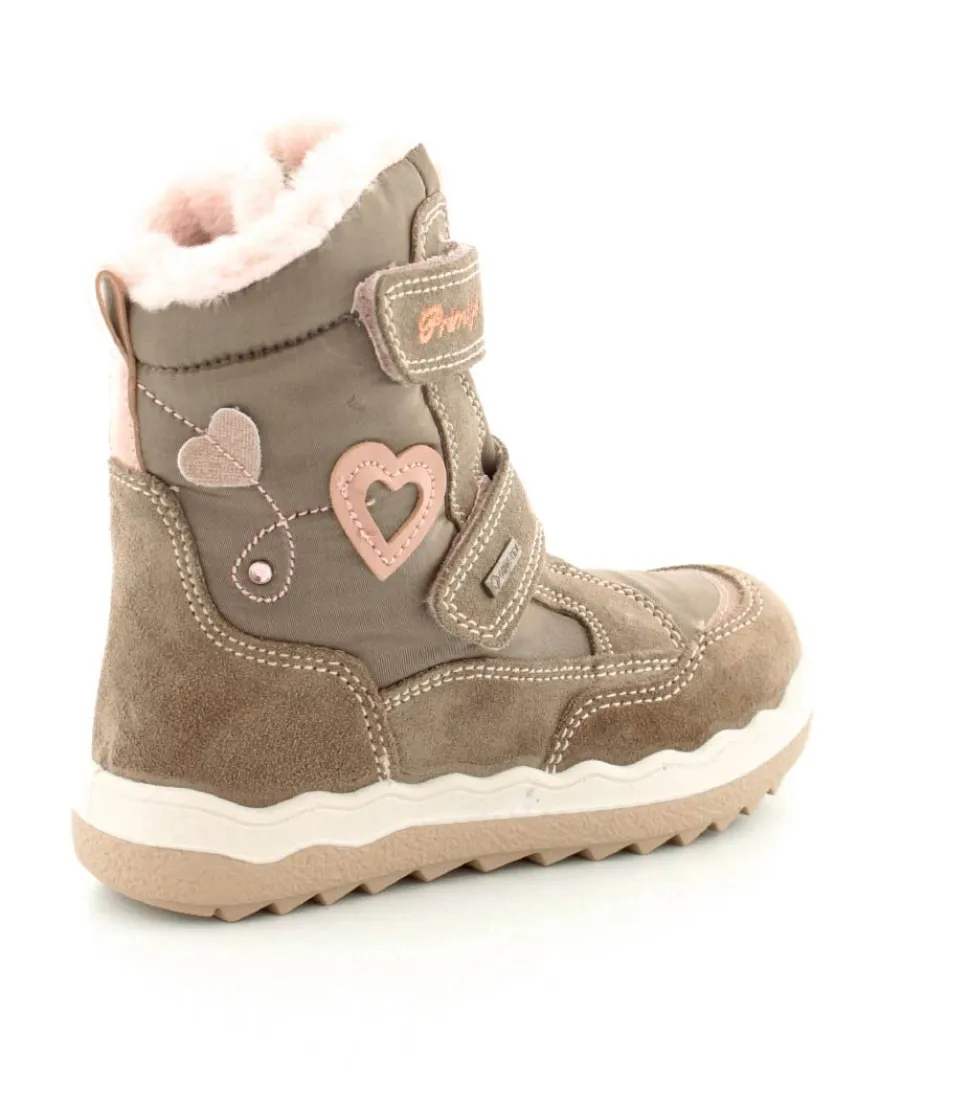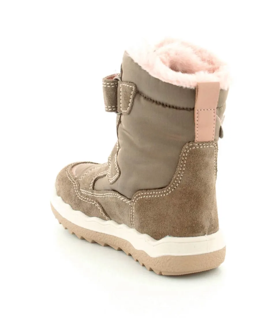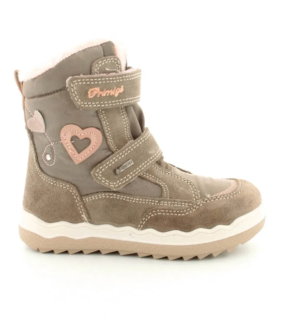 Super god vinterstøvle fra Primigi model Frozen GTX. Støvlen er en rigtig vinterstøvle med varmt foer og Gore-Tex membran, så den er 100% vandtæt. Det er en let og stødabsoberende støvle, der er nem at komme i med to regulerbare velcroremme. Flot lysbrun farve med rosa detaljer på.
