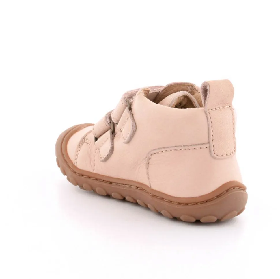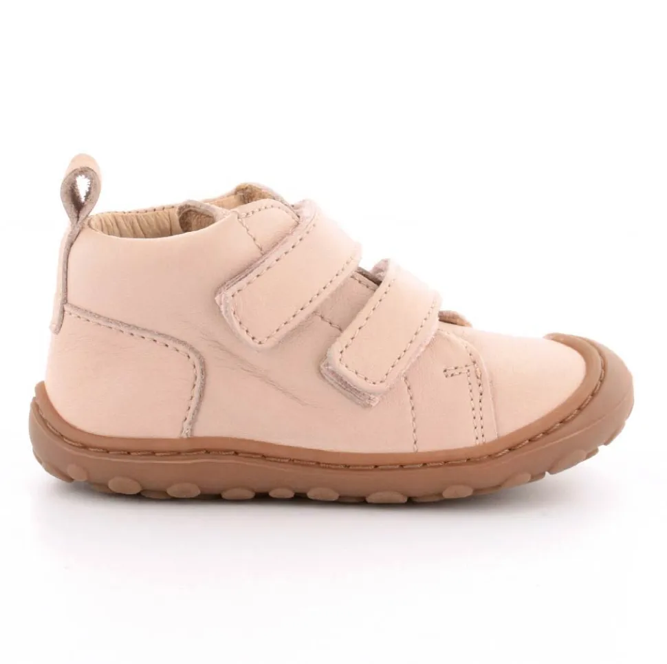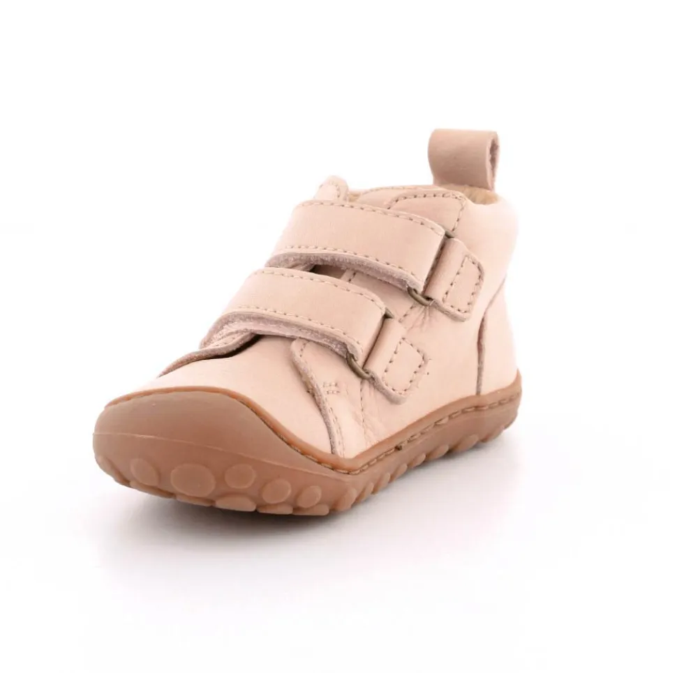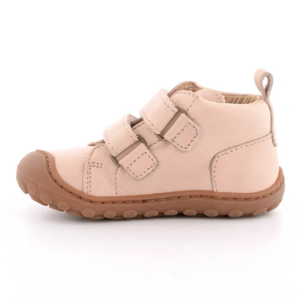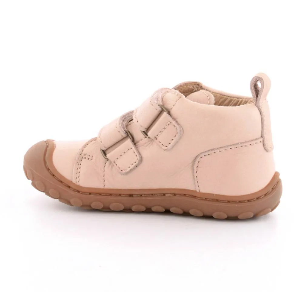 Super fin begyndersko fra Bisgaard model Gerle i rosafarvet skind. Skoen går godt op om anklen og støtter barnets fod rigtig godt. Der er to regulerbare velcroremme og lækkert skindfoer i hele skoen. Aftagelige skinddækssåler og gummisåler under hele bunden, der er blød og fleksibel. Sålen går op om snuden, så den både beskytter skoen og foden.
