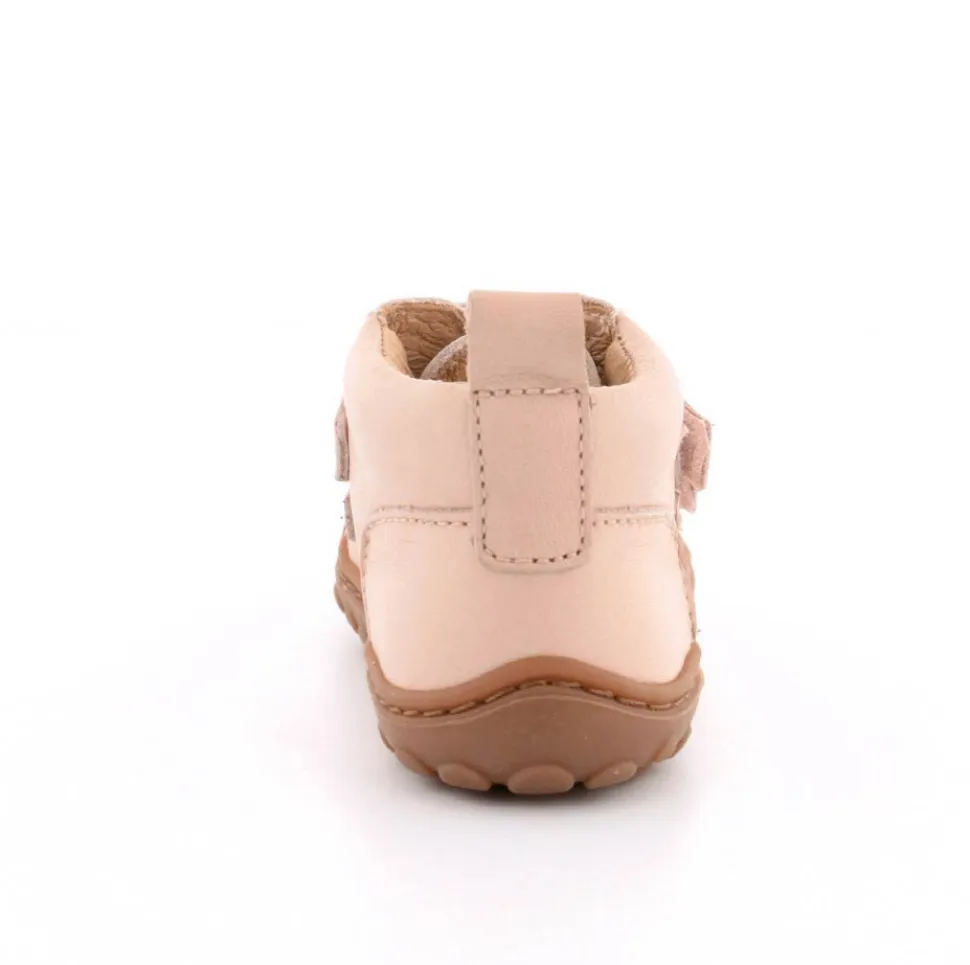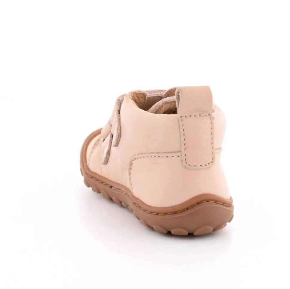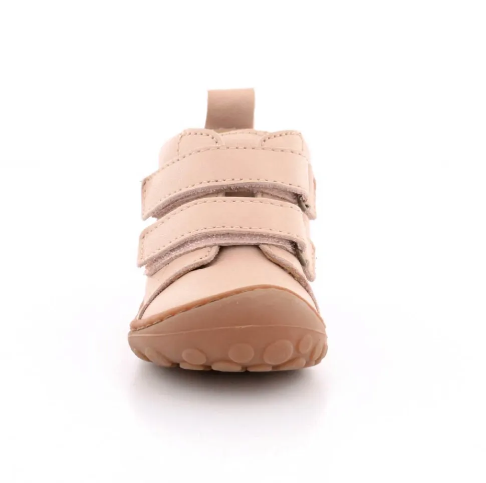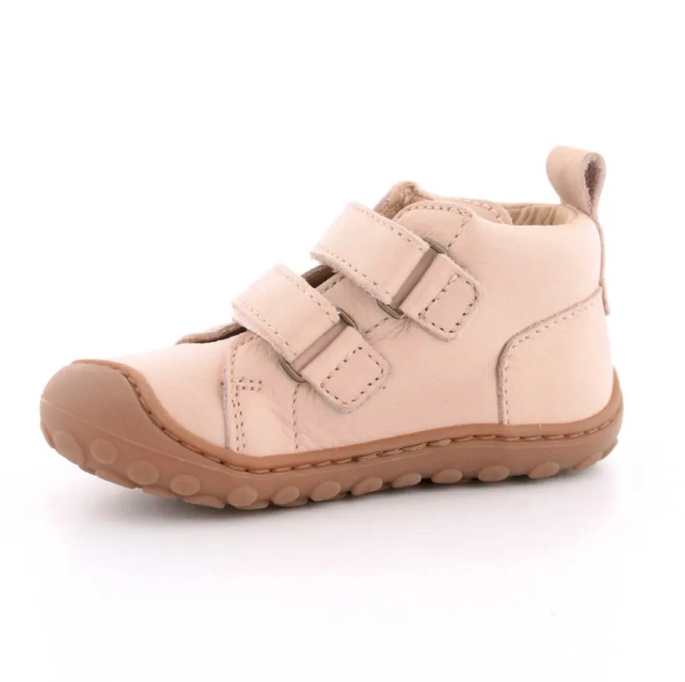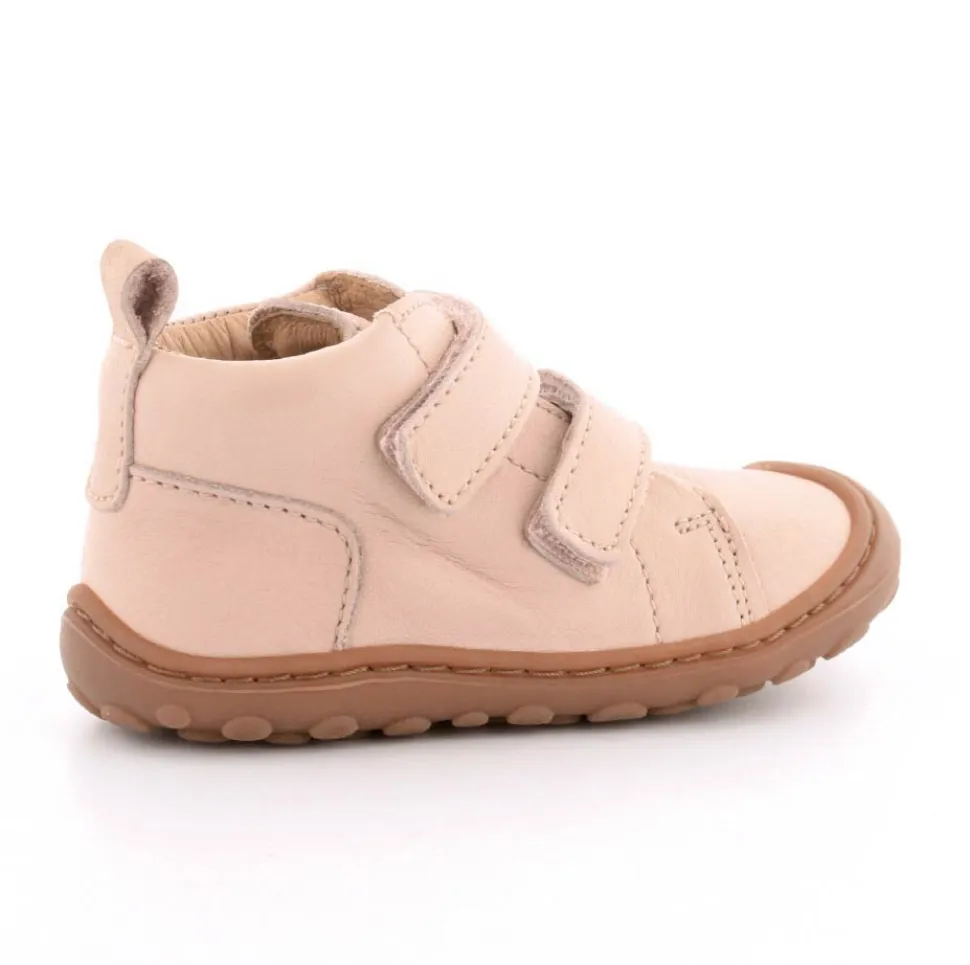 Super fin begyndersko fra Bisgaard model Gerle i rosafarvet skind. Skoen går godt op om anklen og støtter barnets fod rigtig godt. Der er to regulerbare velcroremme og lækkert skindfoer i hele skoen. Aftagelige skinddækssåler og gummisåler under hele bunden, der er blød og fleksibel. Sålen går op om snuden, så den både beskytter skoen og foden.
