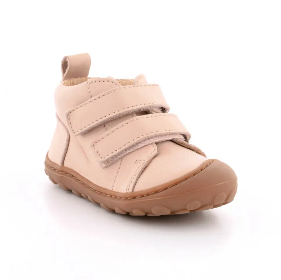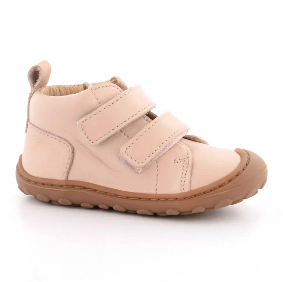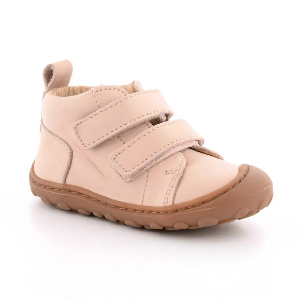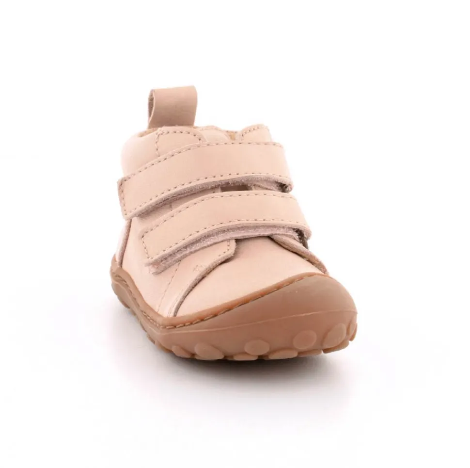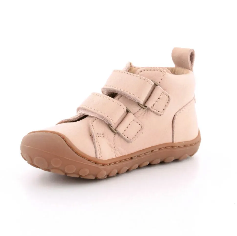Super fin begyndersko fra Bisgaard model Gerle i rosafarvet skind. Skoen går godt op om anklen og støtter barnets fod rigtig godt. Der er to regulerbare velcroremme og lækkert skindfoer i hele skoen. Aftagelige skinddækssåler og gummisåler under hele bunden, der er blød og fleksibel. Sålen går op om snuden, så den både beskytter skoen og foden.
