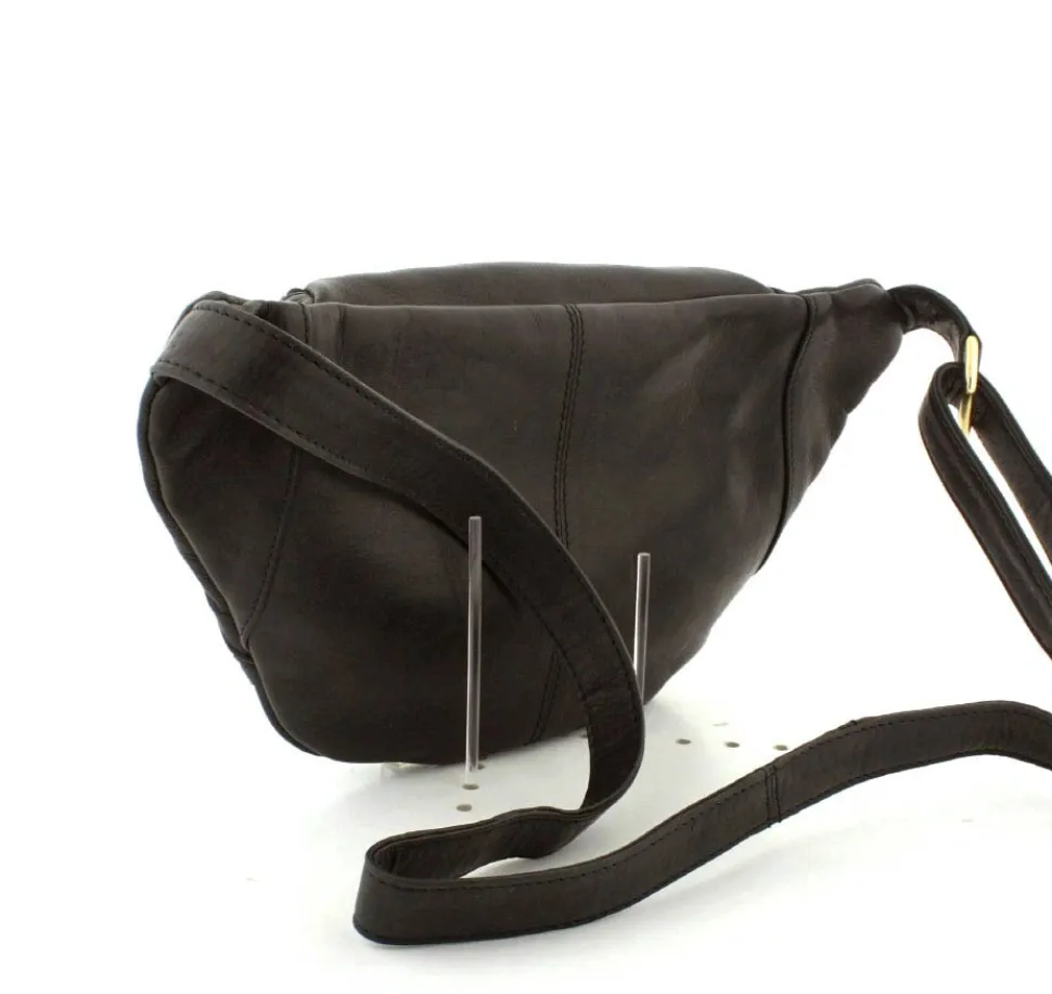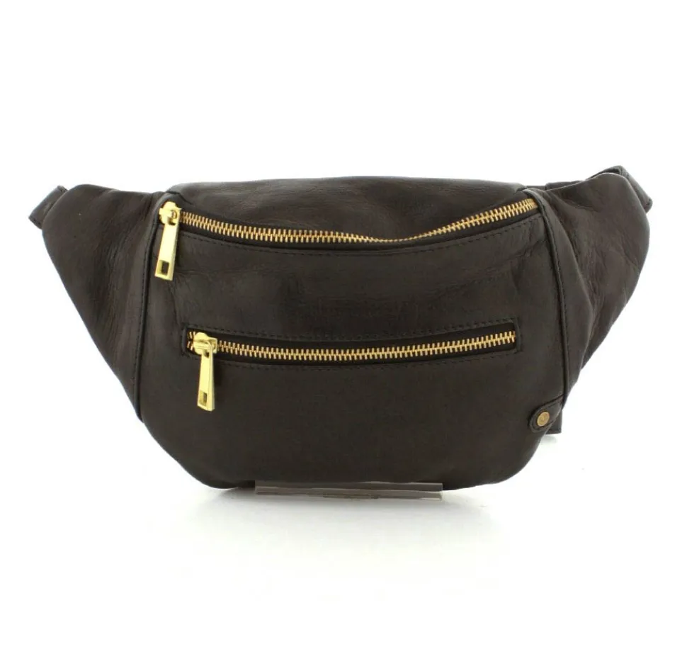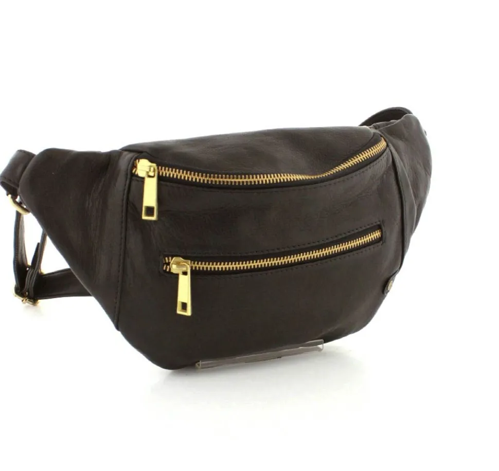 Rigtig flot Bumbag fra Depeche i lækkert sort skind fra serien Golden Chic. Tasken er med guldlynlåse og hægter, så den får et eksklusivt look. Tasken har en lynlåslomme foran og åbnes i toppen med lynlås. Indeni er der et stort rum, med lynlåslomme og små lommer. Tasken fra Depeche har en lang regulerbar rem, så tasken både kan bruges som skuldertaske, crossover og bæltetaske.