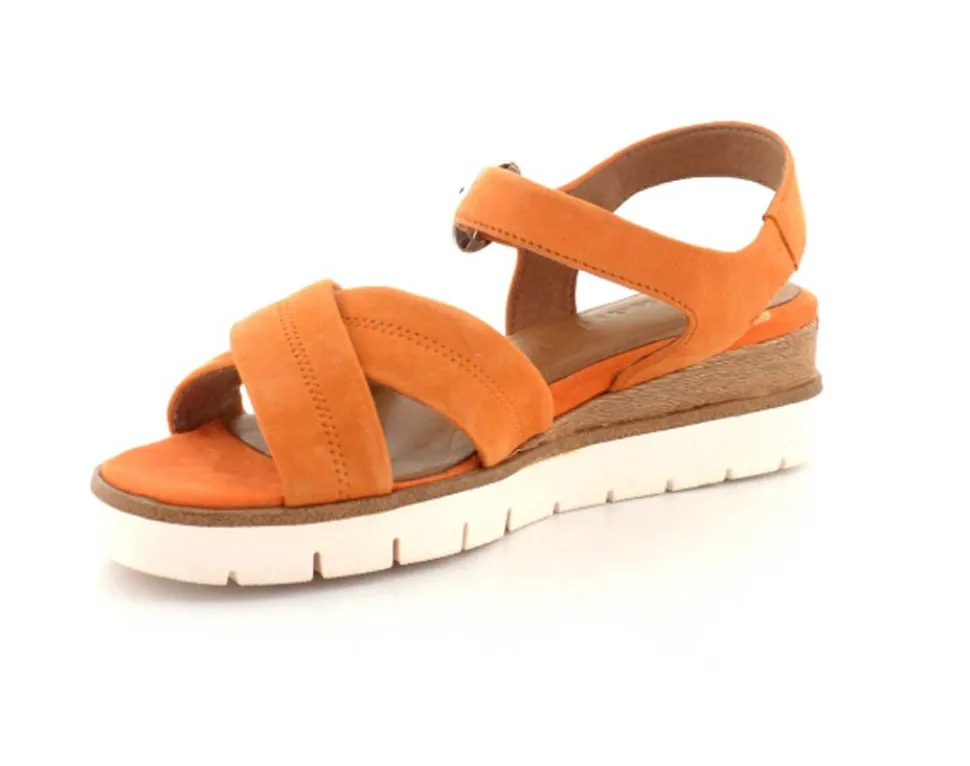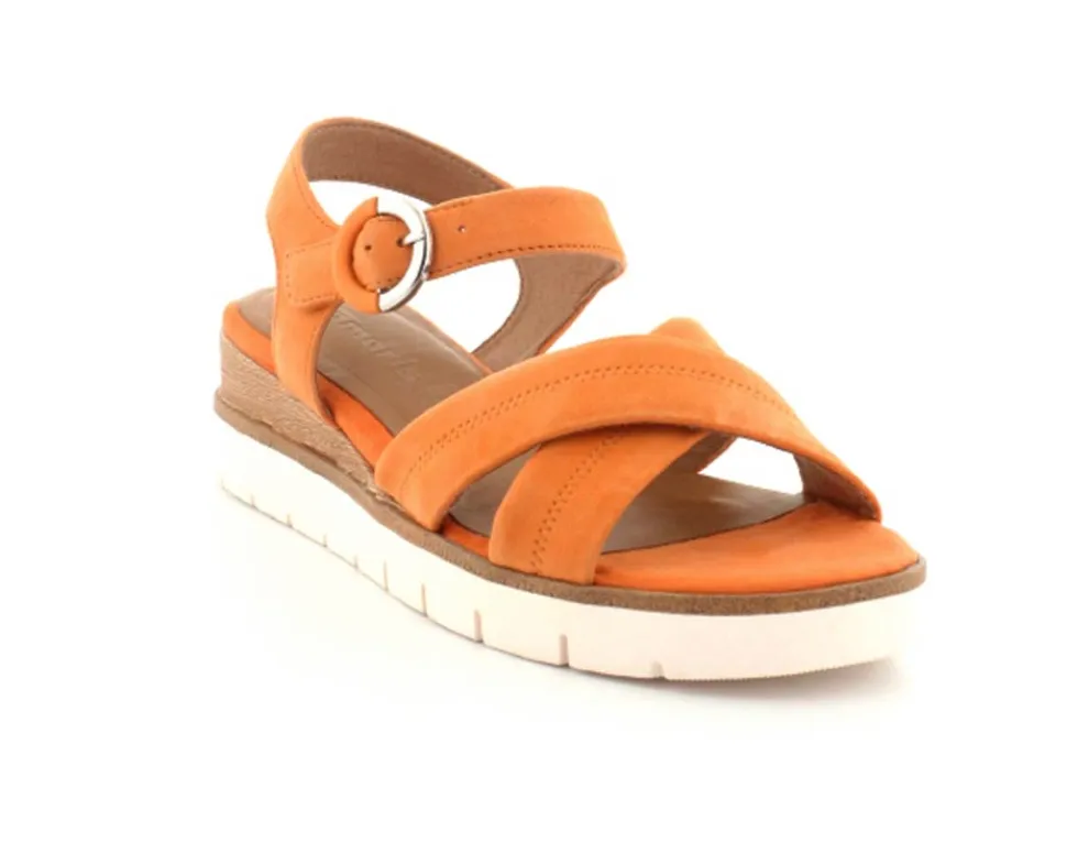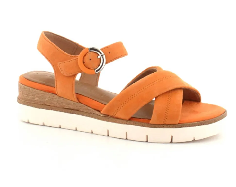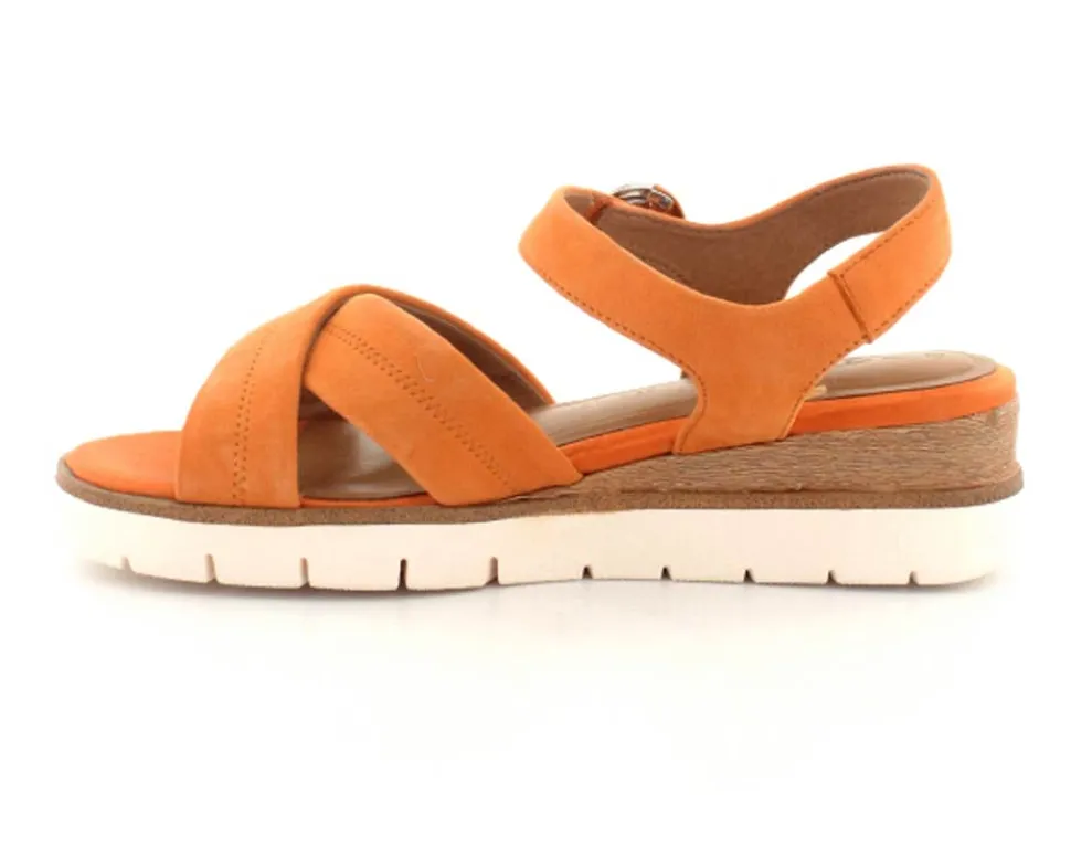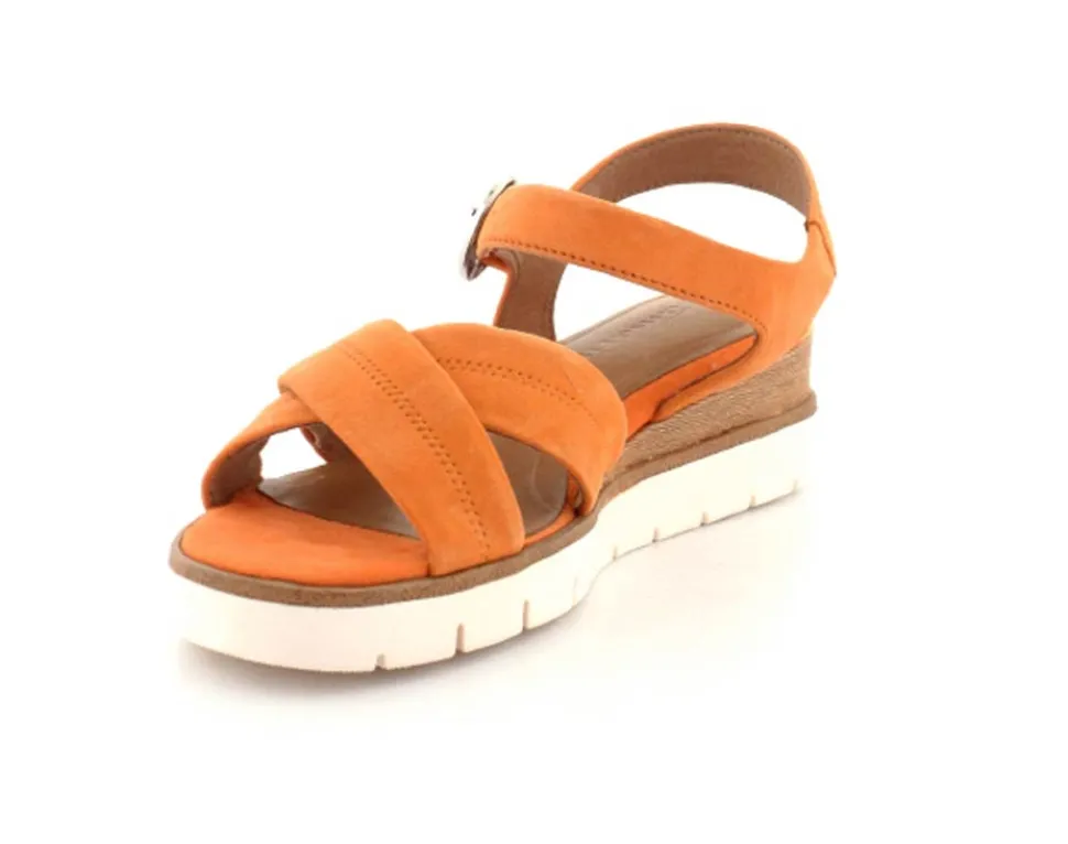 Super flot og lækker blød ruskinds sandal fra Tamaris. Sandalen er i en flot orange farve med ankelrem og krydsremme ved forfoden. Der er god plads i bredden og dejlige bløde såler indeni. Nem lille kilehæl at gå på.