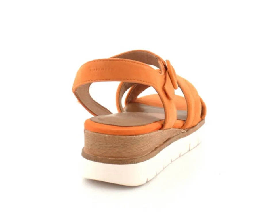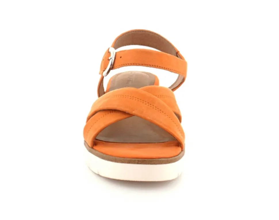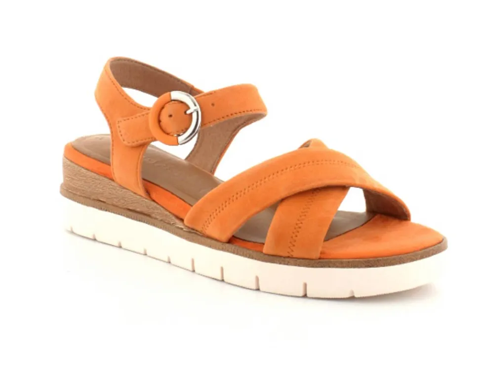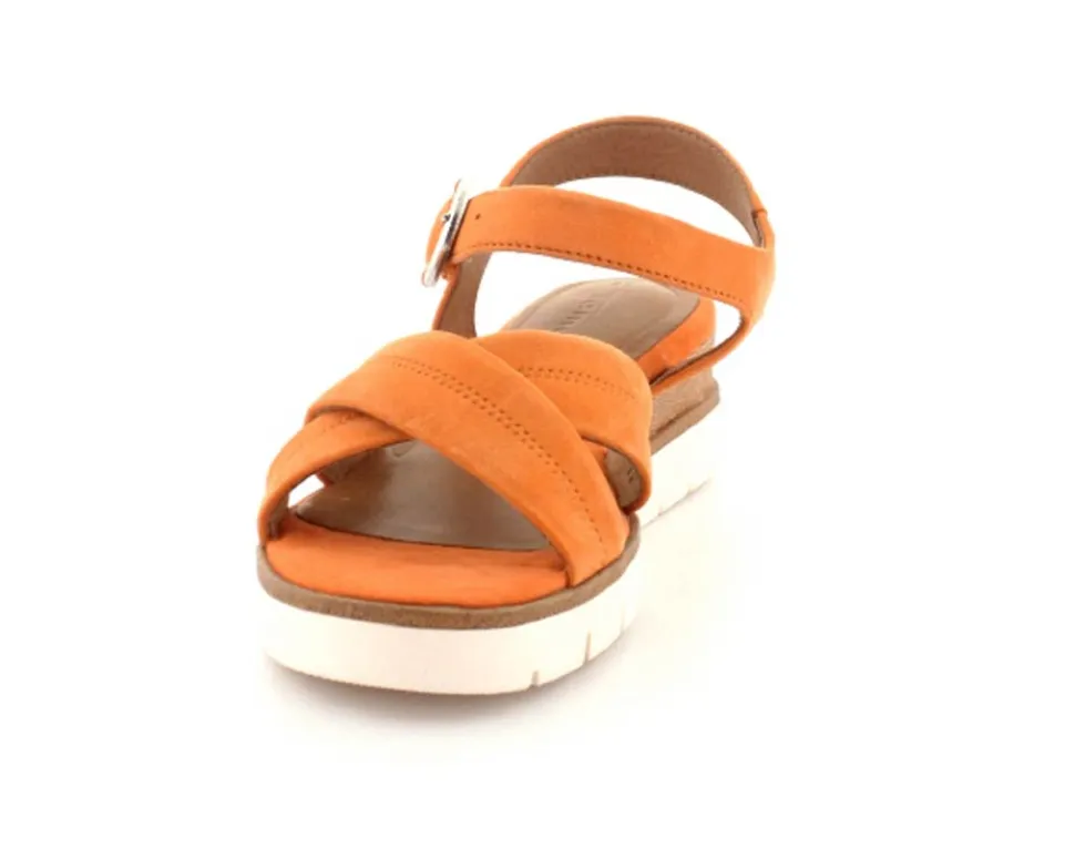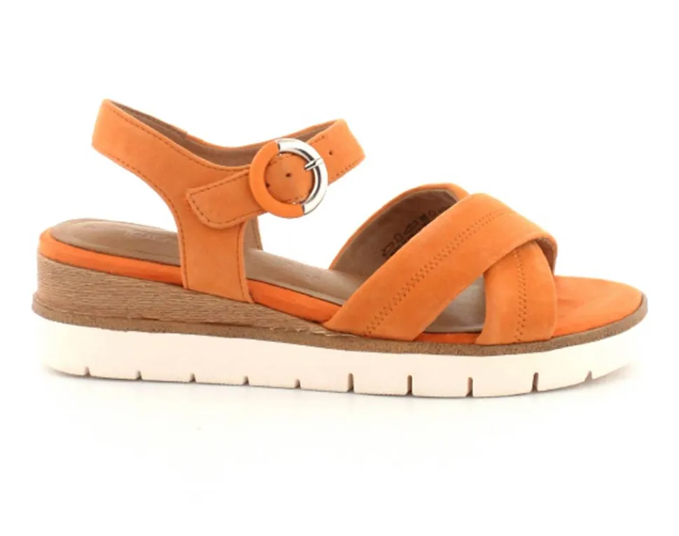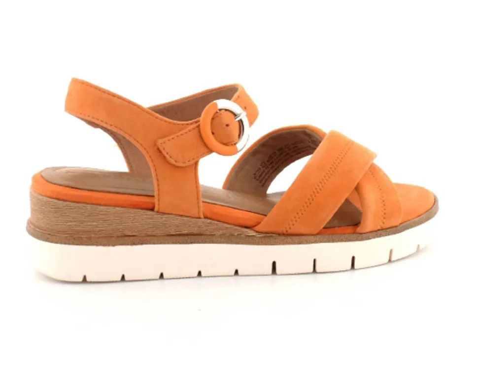 Super flot og lækker blød ruskinds sandal fra Tamaris. Sandalen er i en flot orange farve med ankelrem og krydsremme ved forfoden. Der er god plads i bredden og dejlige bløde såler indeni. Nem lille kilehæl at gå på.