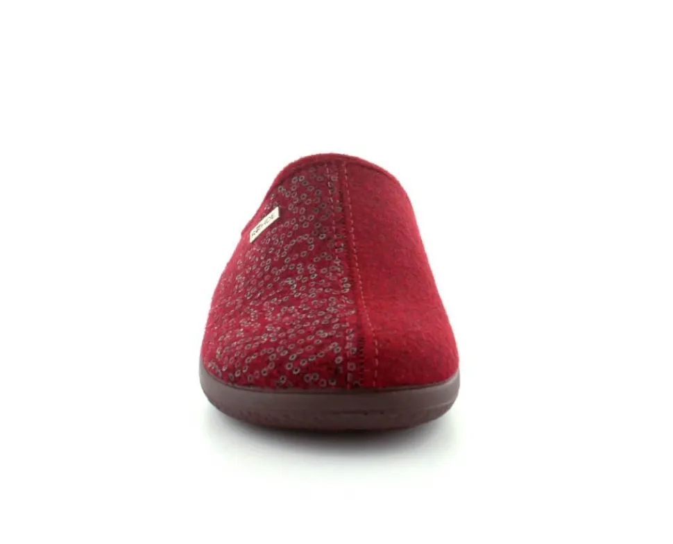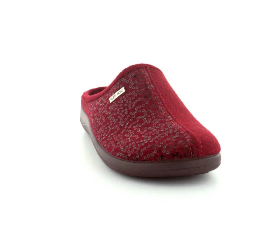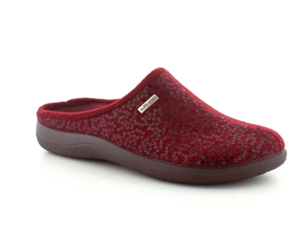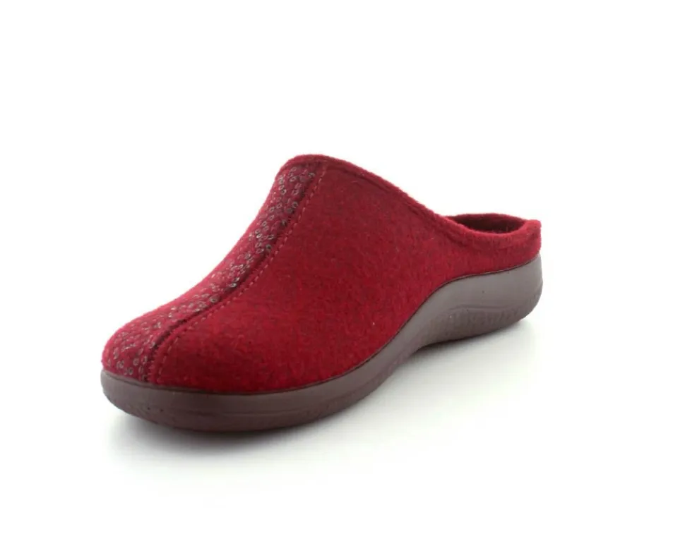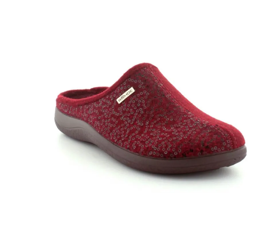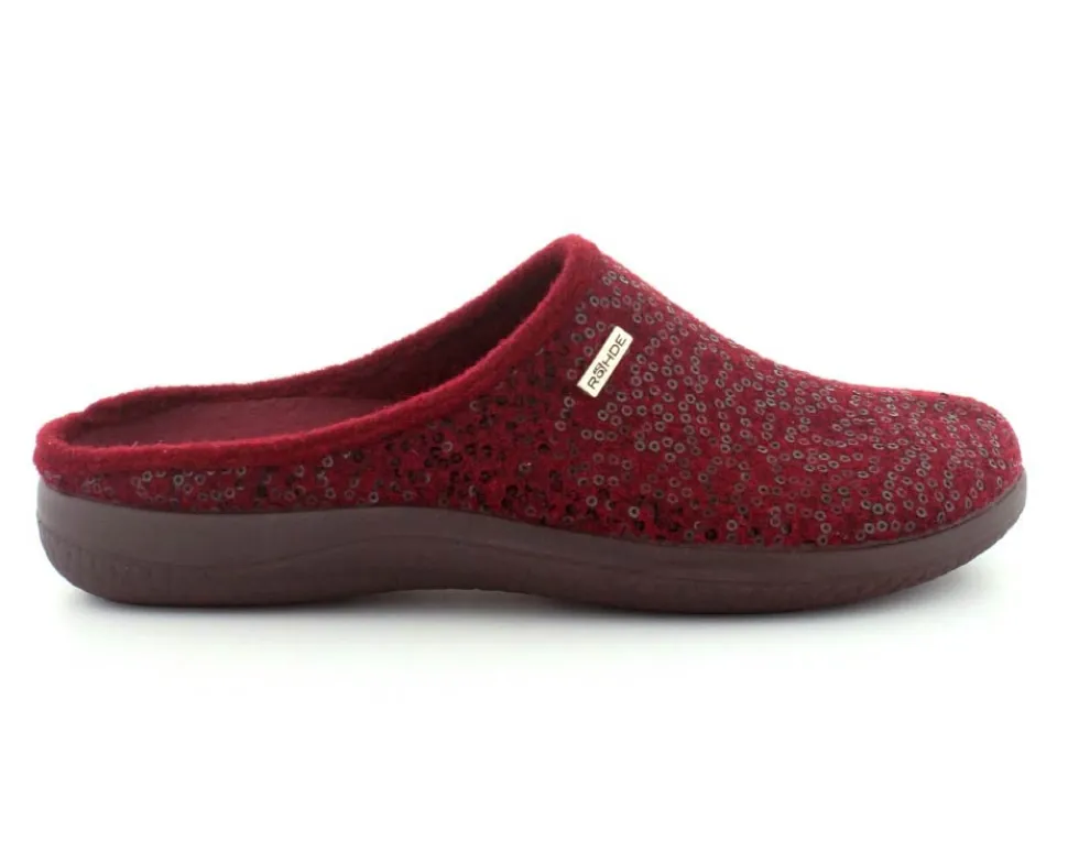 Klassiske hjemmesko fra Rohde i uldfilt i en flot bordeaux farve. Skoen er lige til at stikke i og rummer godt i bredden. Der er aftagelige indlægssåler med ekstra pude under hæl og ved forfodsknoglen. Den kan også skiftes ud med egne specialsåler. Hjemmeskoen fra Rohde er meget let og har bløde fleksible såler under hele bunden.