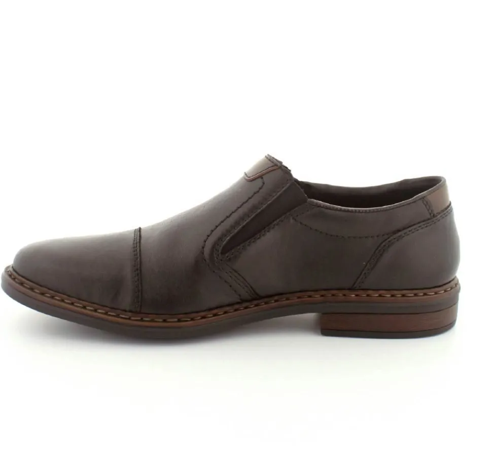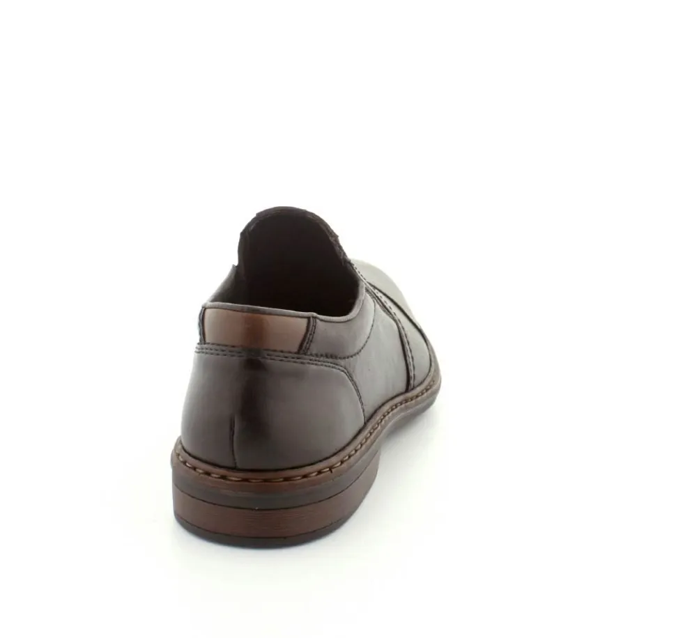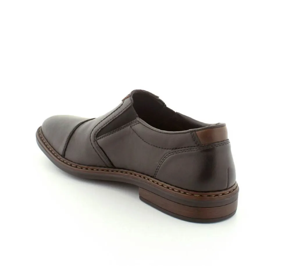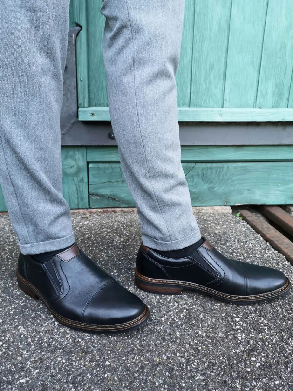Flot og klassisk moccasin sko fra Rieker i sort glat skind med brune detaljer på. Skoen er lige til at smutte i med elasik på begge sider af vristen. Skoen fra Rieker har lette, bløde og fleksible såler under hele bunden. Bløde skinddækssåler indeni.