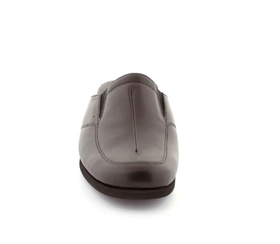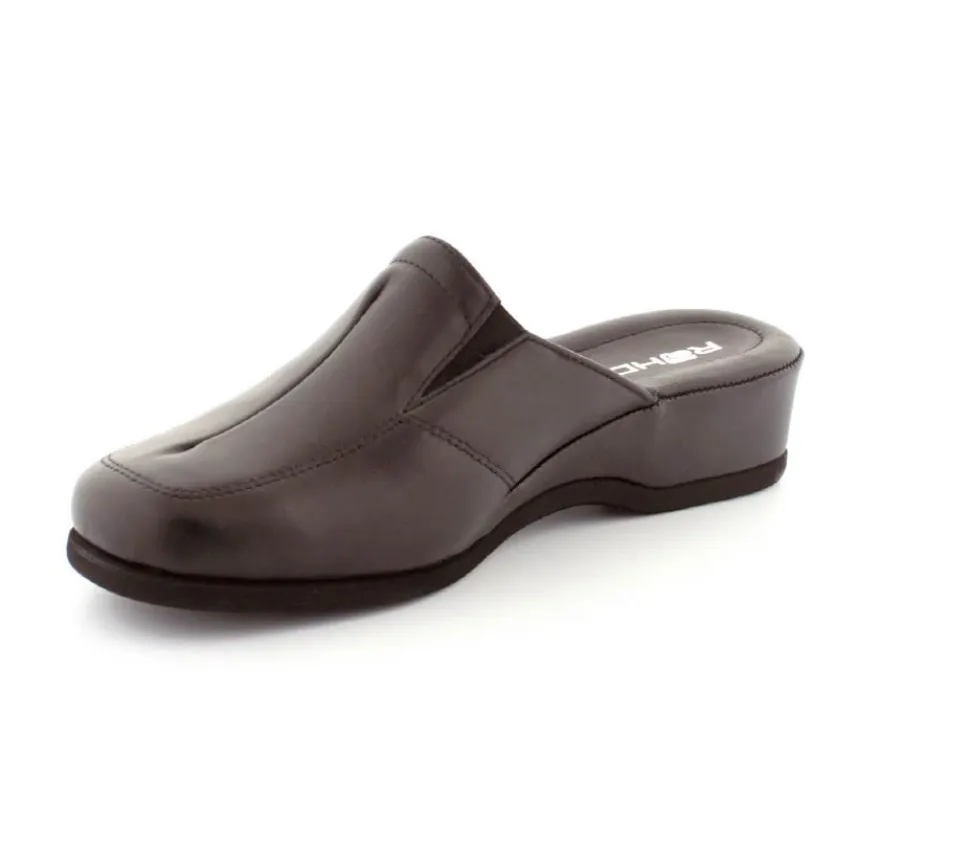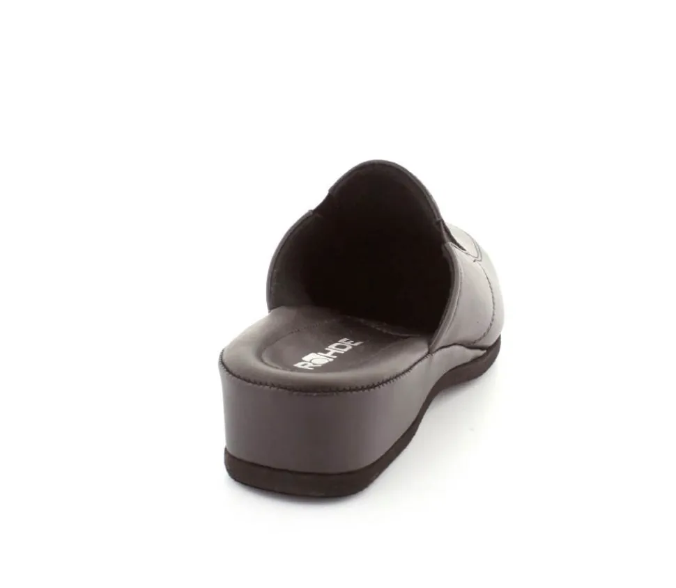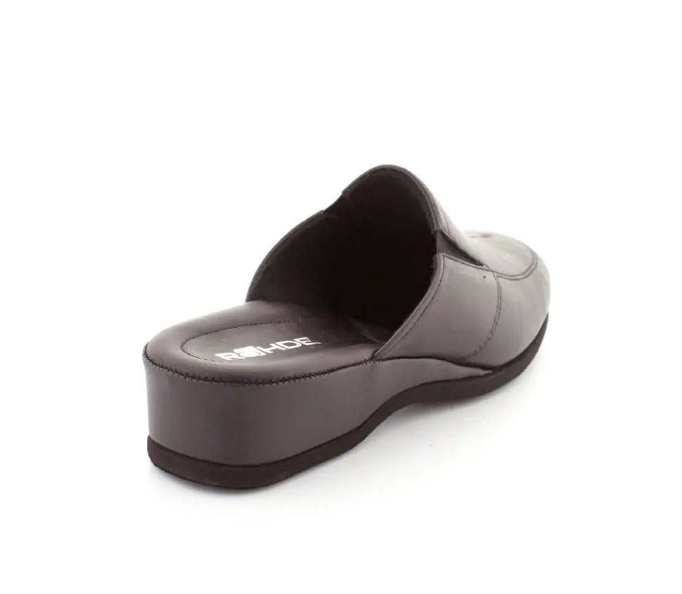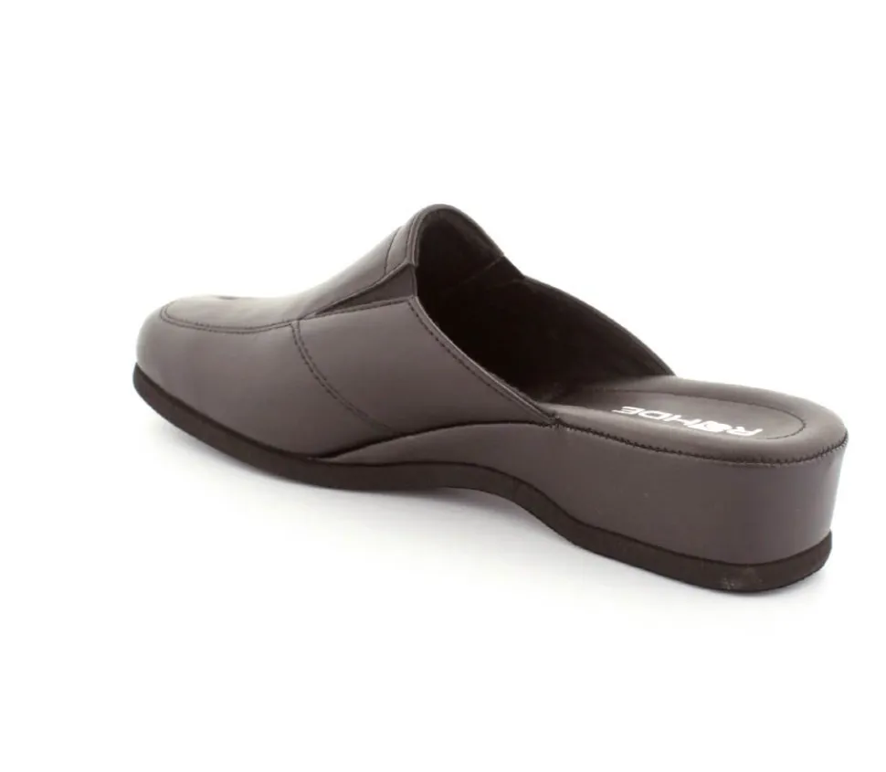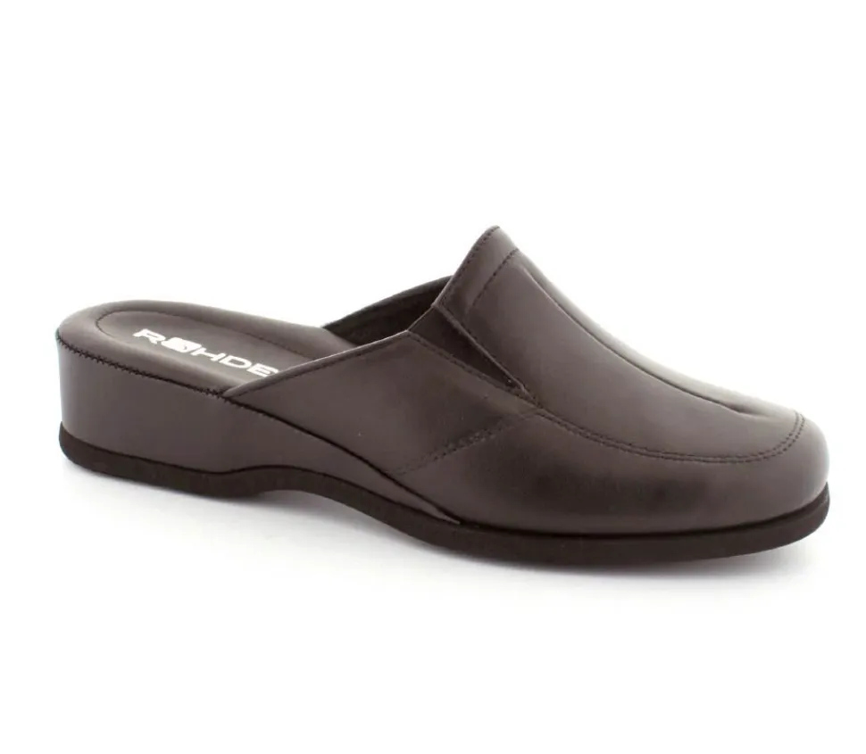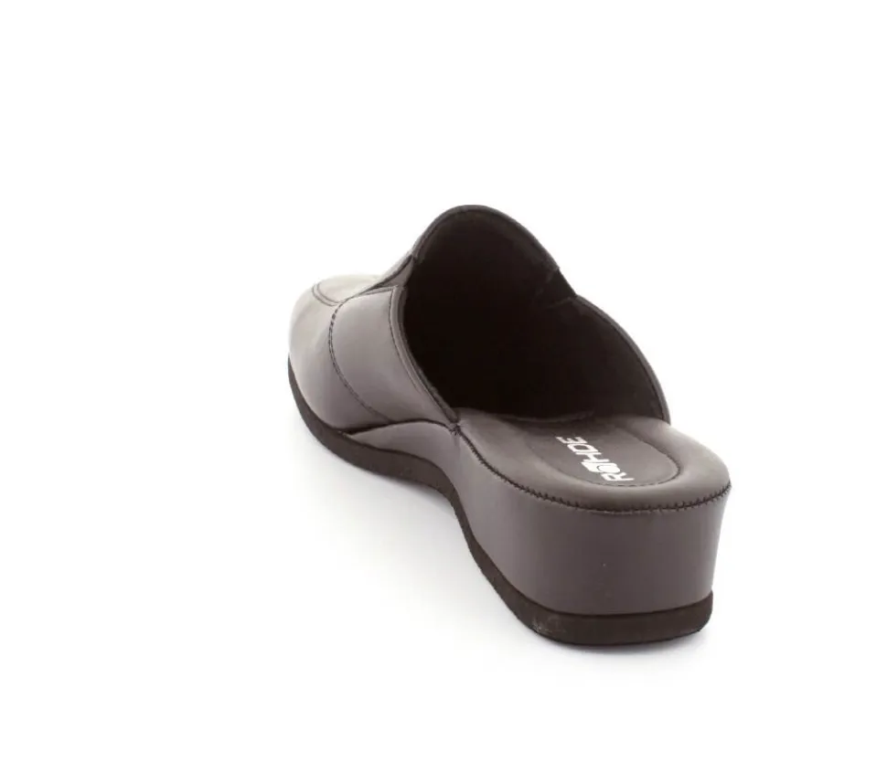 Klassisk hjemmesko fra Rohde i sort glat skind. Hjemmeskoen er en slippers model så den er lige til at smutte i. Den rummer godt i bredden og kan give sig yderligere over vristen, da der er elastik i begge sider. Let foering indeni, og bløde og lette fleksible såler under bunden, med en kilehæl på 4 cm under hælen.
