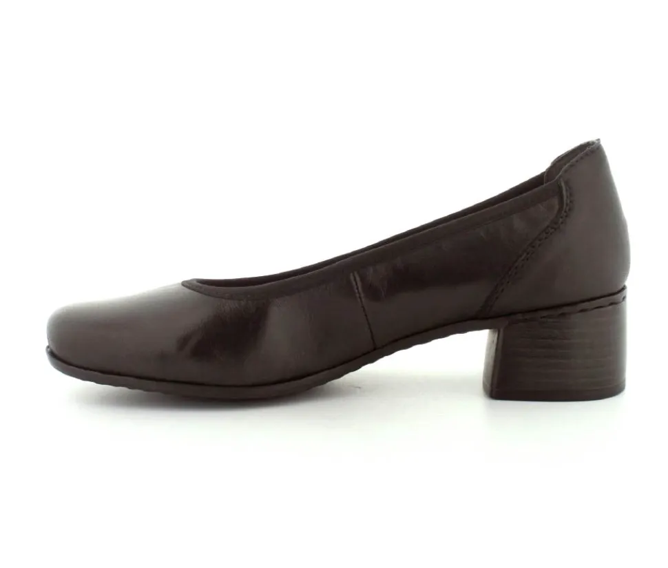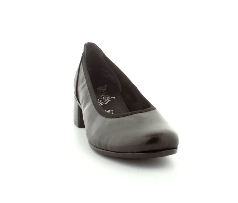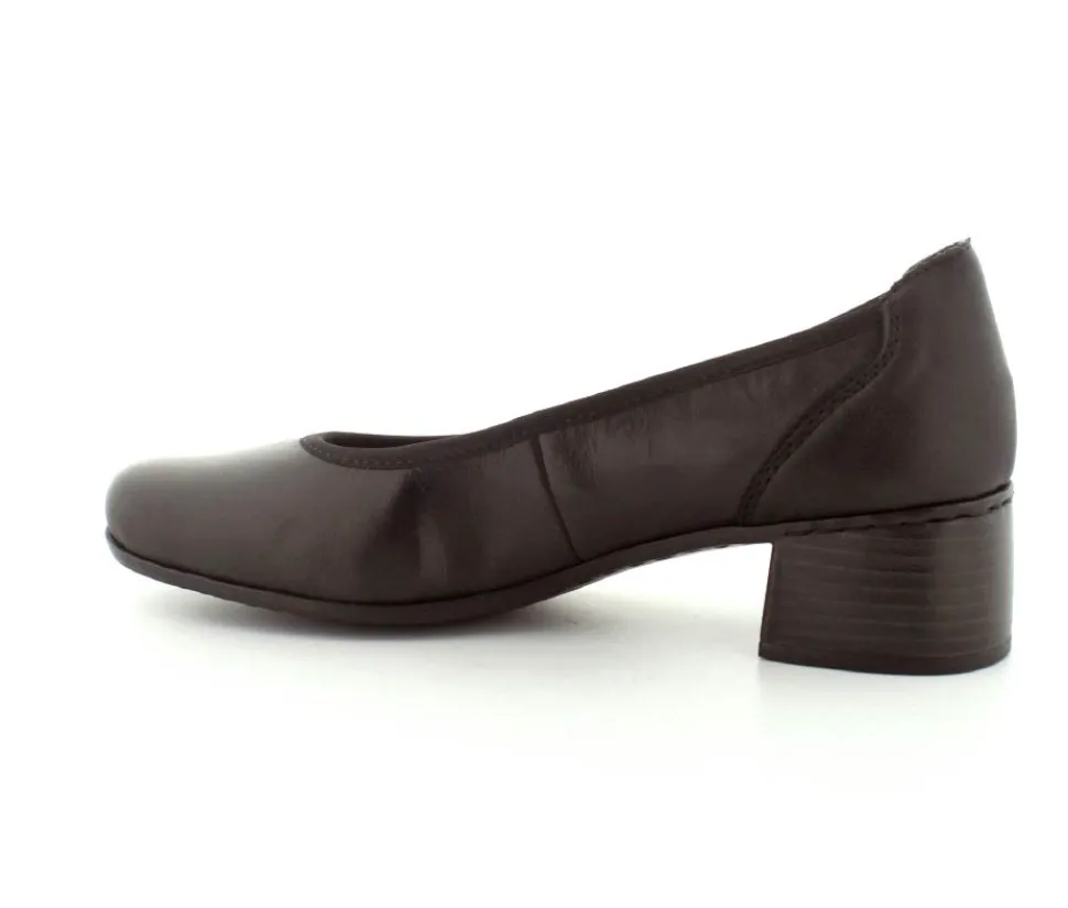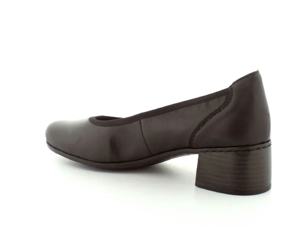 Flotte og klassiske pumps fra Rieker i sort glat skind. Skoen rummer godt i bredden og har bløde skindsåler indeni. Nem blokhæl at gå på.