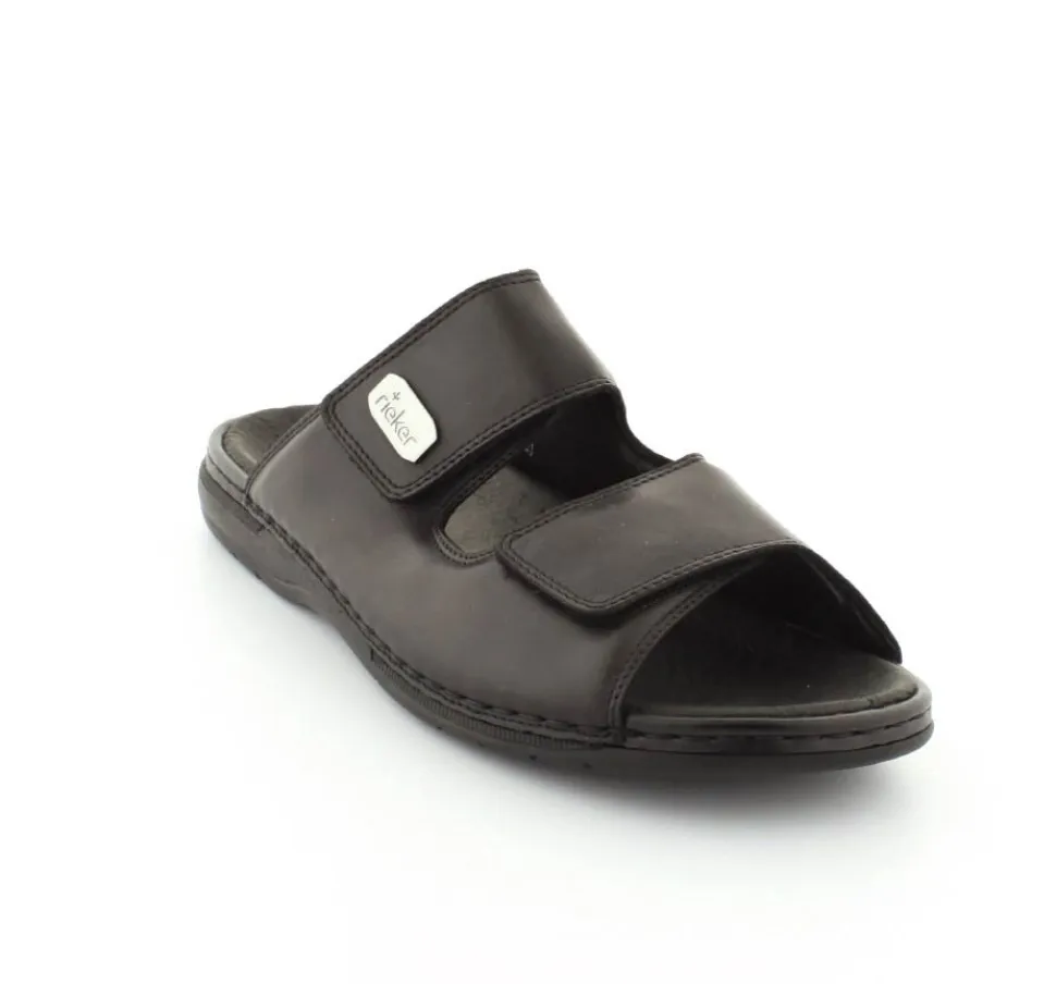 Rigtig lækker herresandal fra Rieker i sort blødt skind. Sandalen er med to justerbare velcroremme, så de kan passe foden både med strømper på og i bare fødder. Skindet er meget blødt og sålen indeni giver efter og er meget blød. Sandalen fra Rieker har god støtte på begge sider, da den lukker til på siderne af foden. Stødabsoberende og fleksible såler. Sandalen fra Rieker egner sig også rigtig godt som hjemmesko.