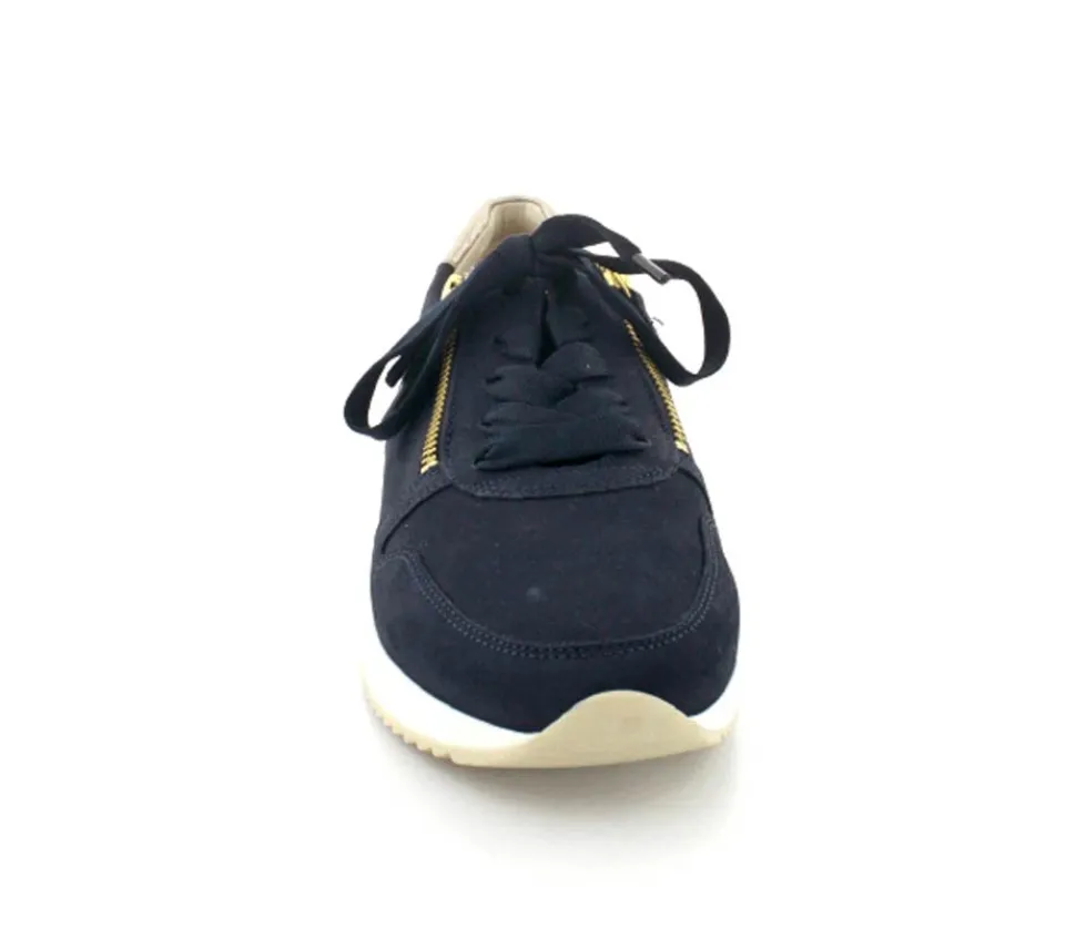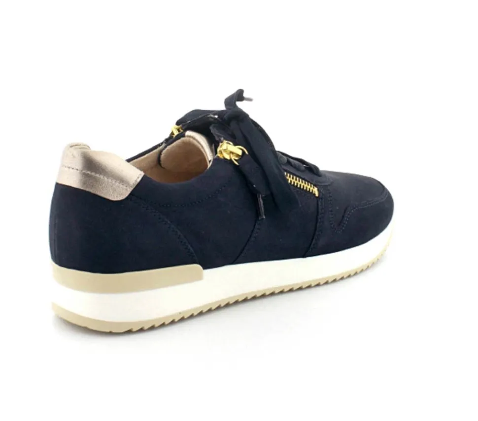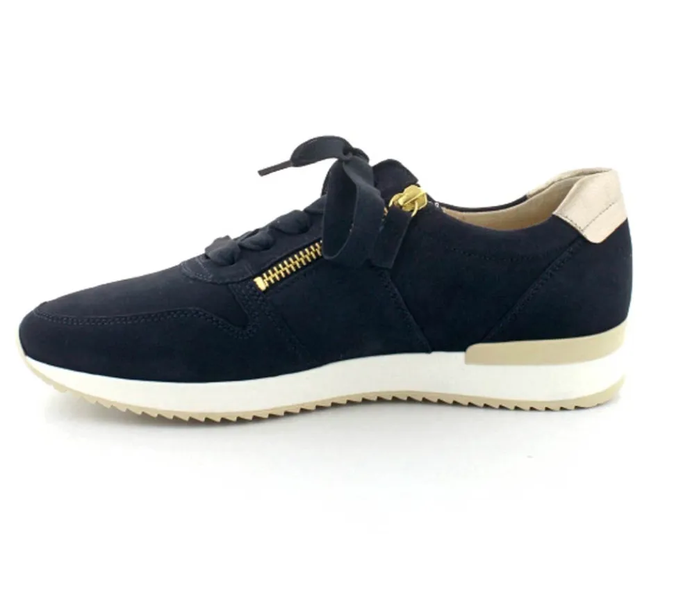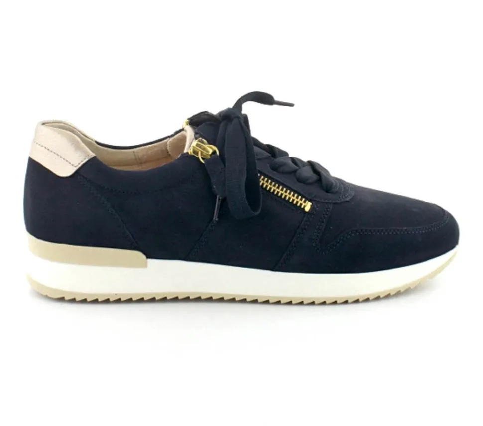 Flot og klassisk ruskindssko fra Gabor i mørkeblå med guld detaljer på. Skoen er både med snørebånd og to lynlåse, så den er nem at komme i. Aftagelige skindsåler og gummisåler under hele bunden.
