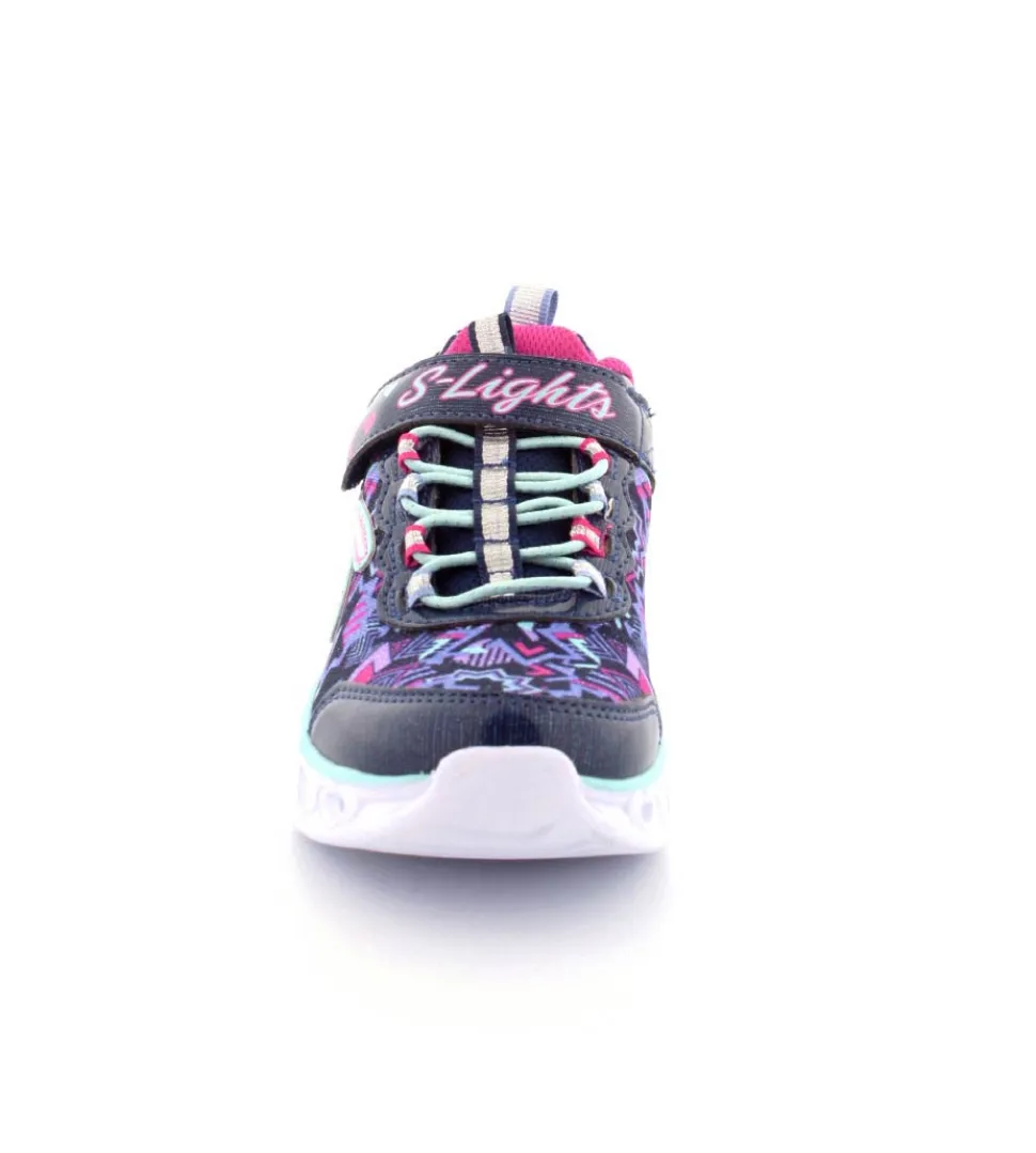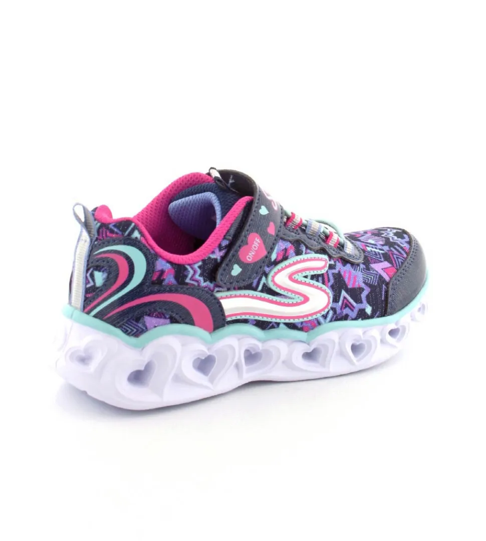 Super smarte blinkesko fra Skechers model Love Lights, der blinker i hjerter når man går. Skoen er nem at komme i med elastiksnøre og regulerbar velcrorem. Den rummer godt og er stor i størrelsen. Skoen fra Skechers er i mørkeblå tekstil med masser af farver på. Der er godt hold på foden med fast hælkappe.