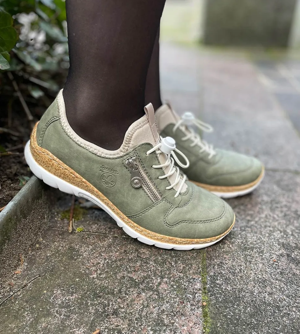 Smart sko fra Rieker i en flot grøn farve. Skoen er lige til at trække på, med elastiksnøre og blødt neopren indvendig. Dejlig bløde “memosoft” såler indeni.