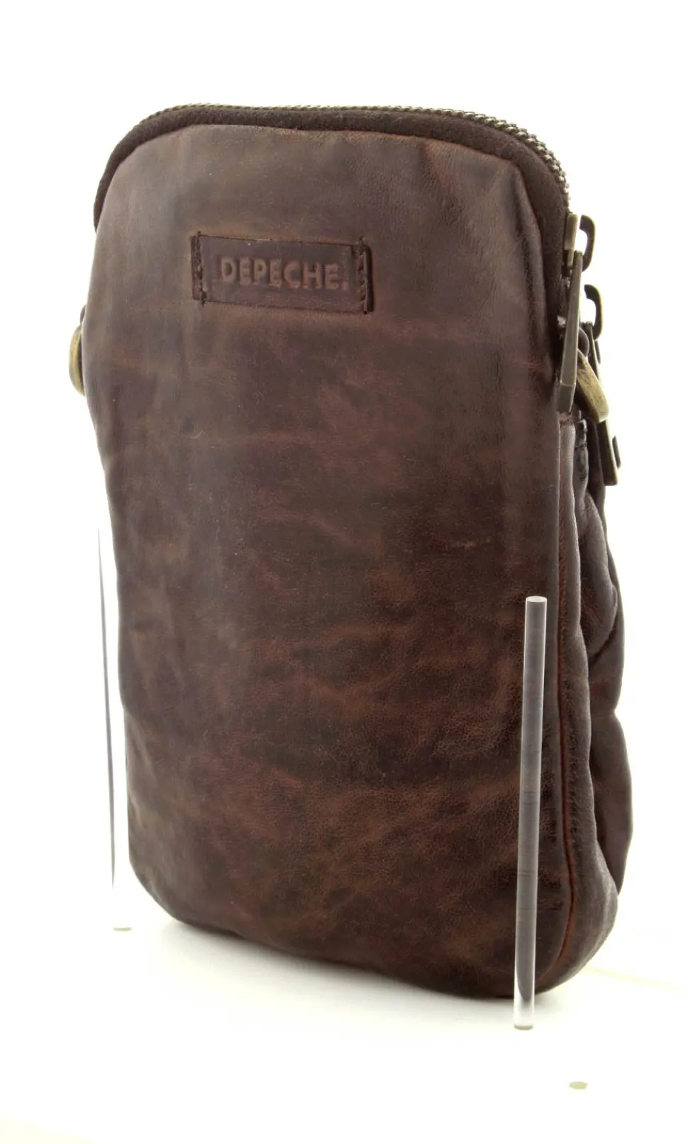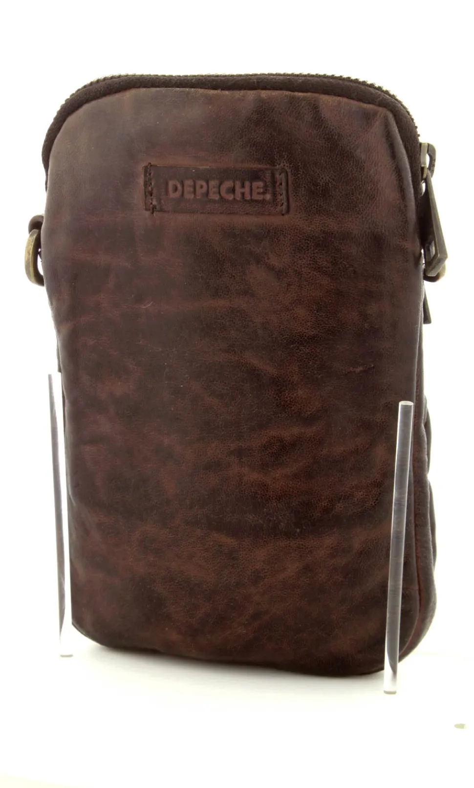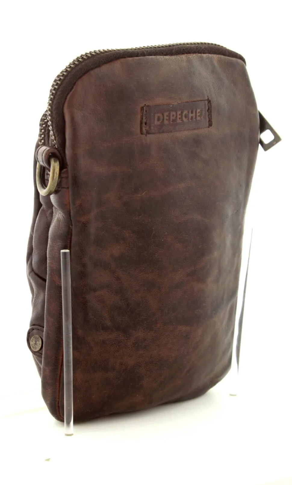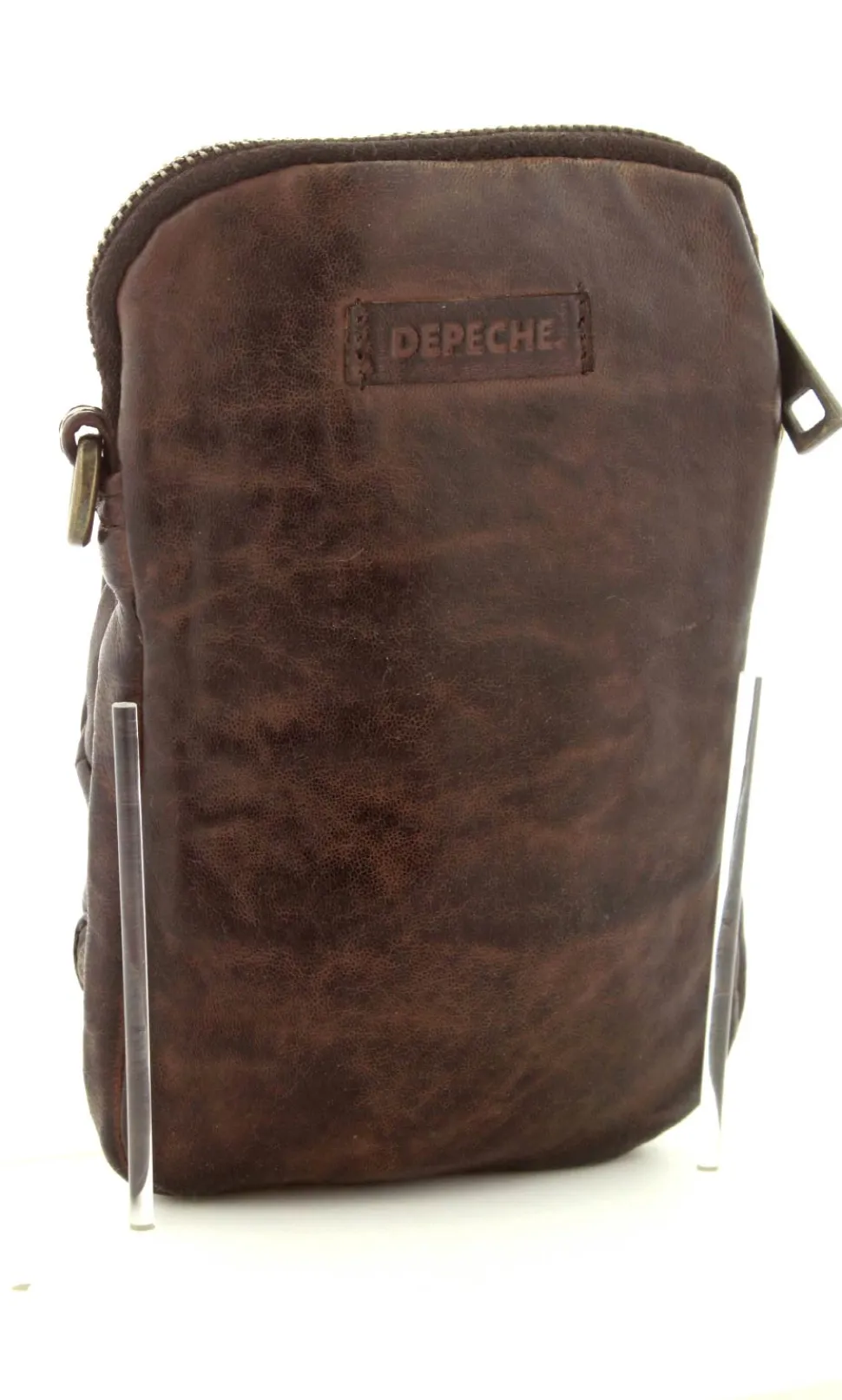 Smart lille mobiltaske fra Depeche i mørkebrunt vasket bøffelskind. Tasken er aflang i modellen, så der er plads til en stor smartphone. Der er to lynlåsrum og i det store rum er der også 4 små rum til kreditkort. Tasken fra Depeche har en lang regulerbar skulderrem.
