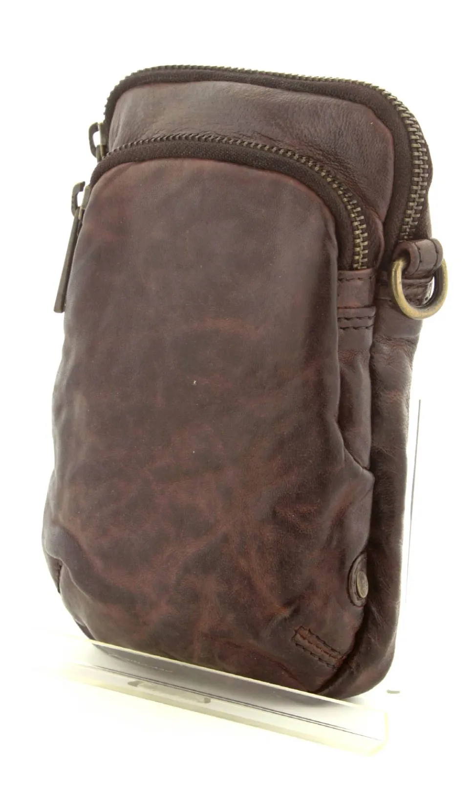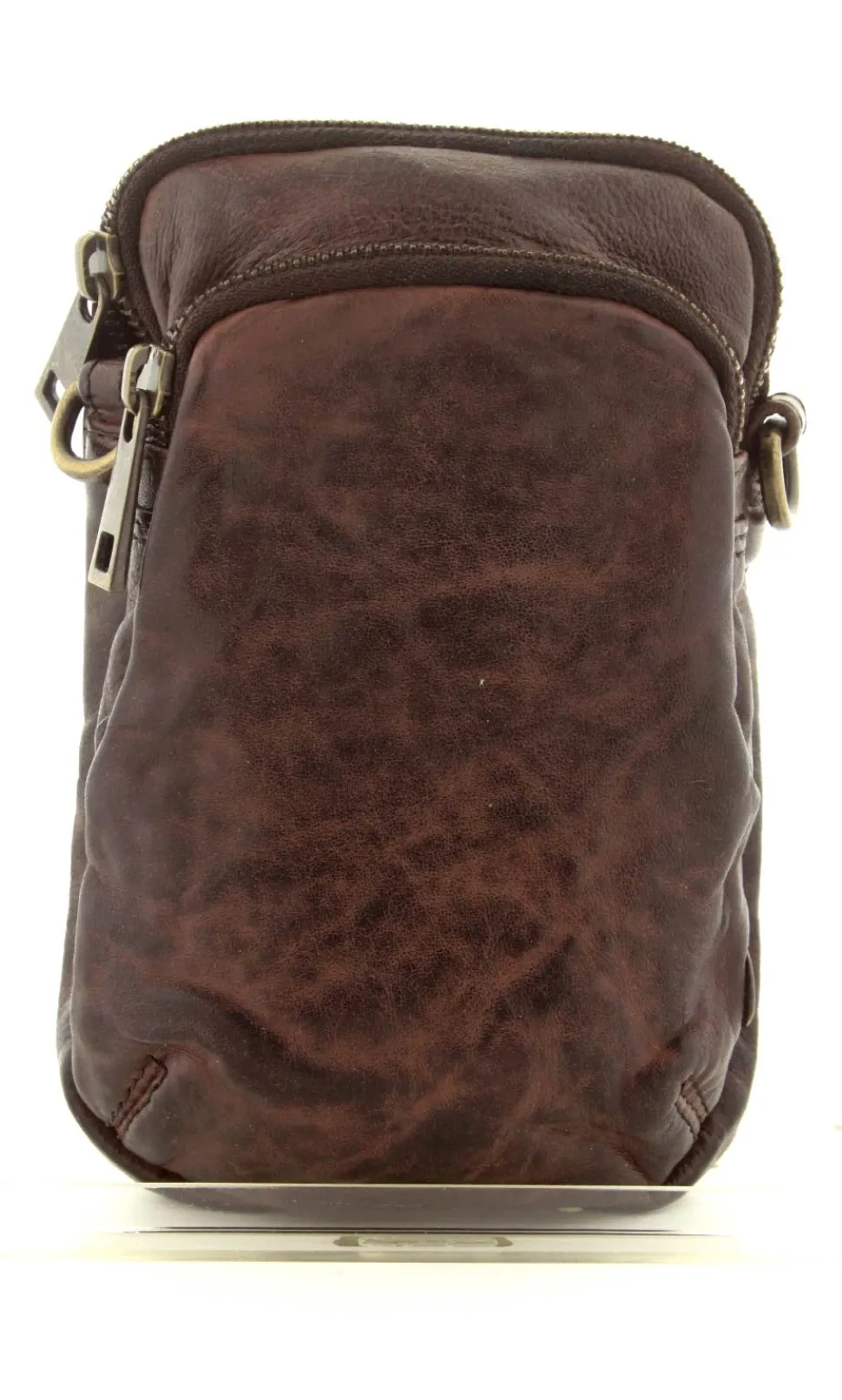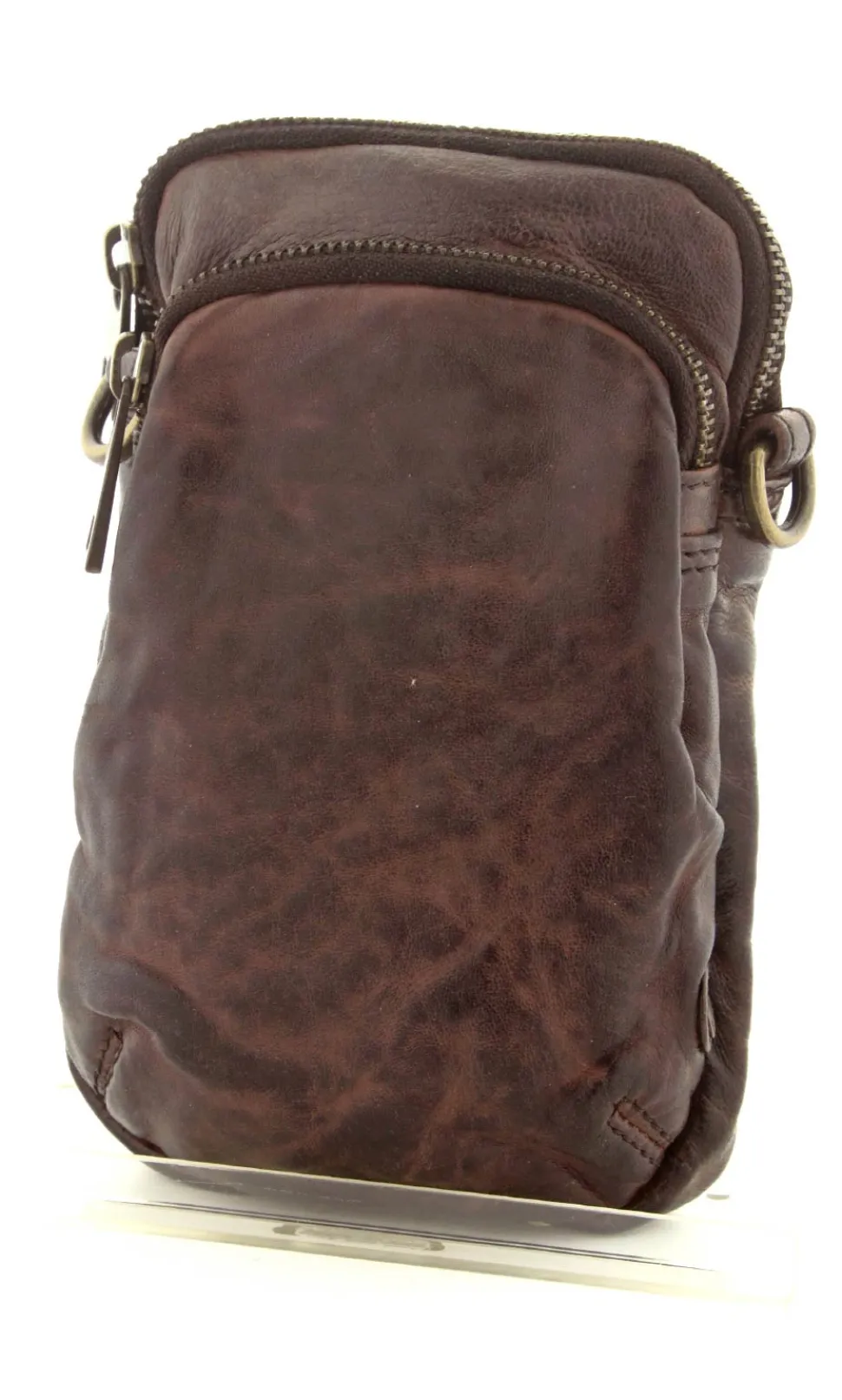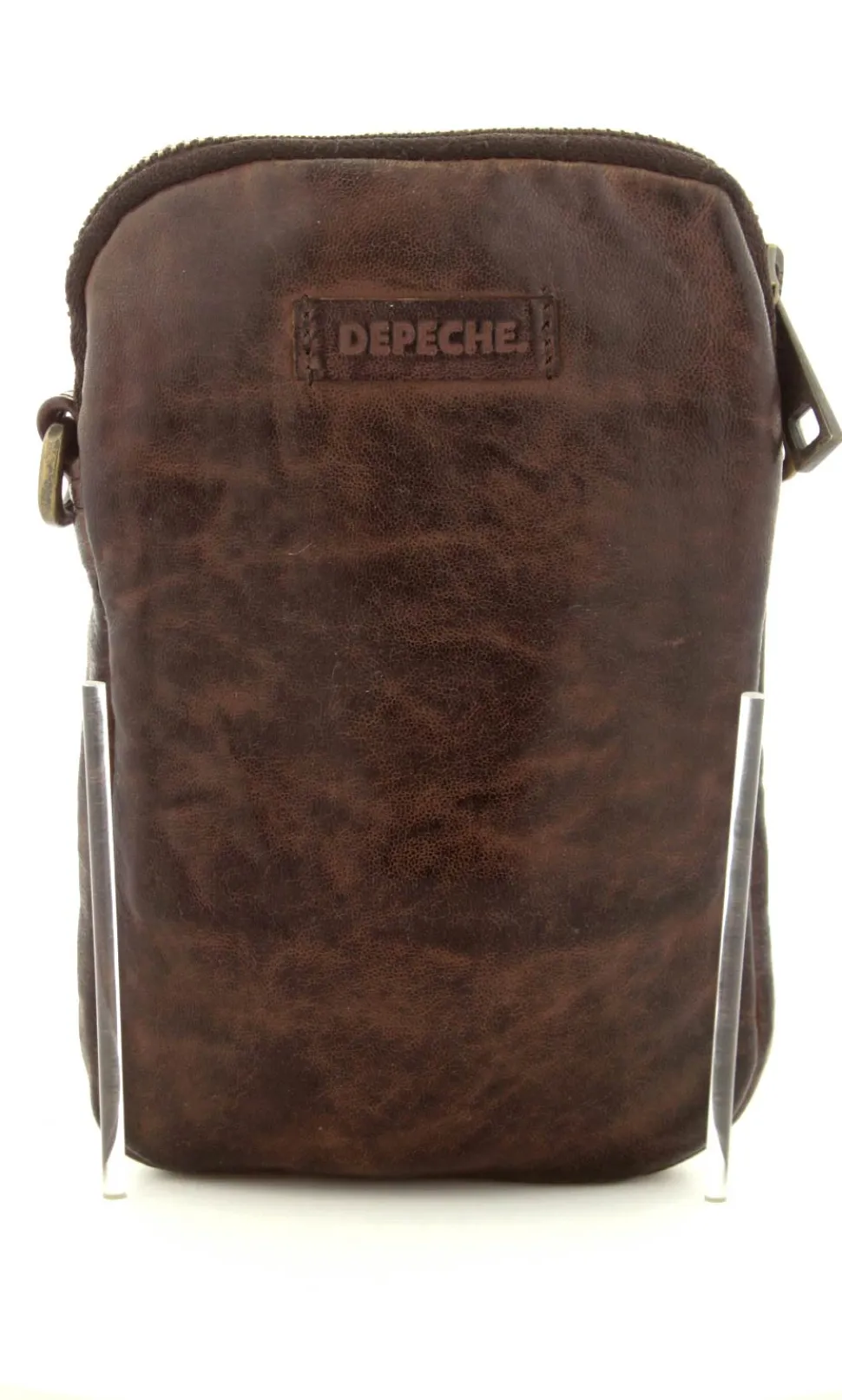 Smart lille mobiltaske fra Depeche i mørkebrunt vasket bøffelskind. Tasken er aflang i modellen, så der er plads til en stor smartphone. Der er to lynlåsrum og i det store rum er der også 4 små rum til kreditkort. Tasken fra Depeche har en lang regulerbar skulderrem.