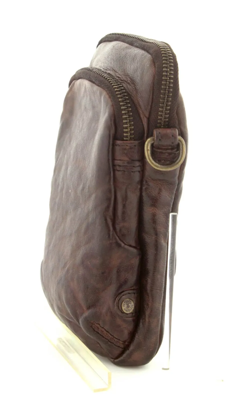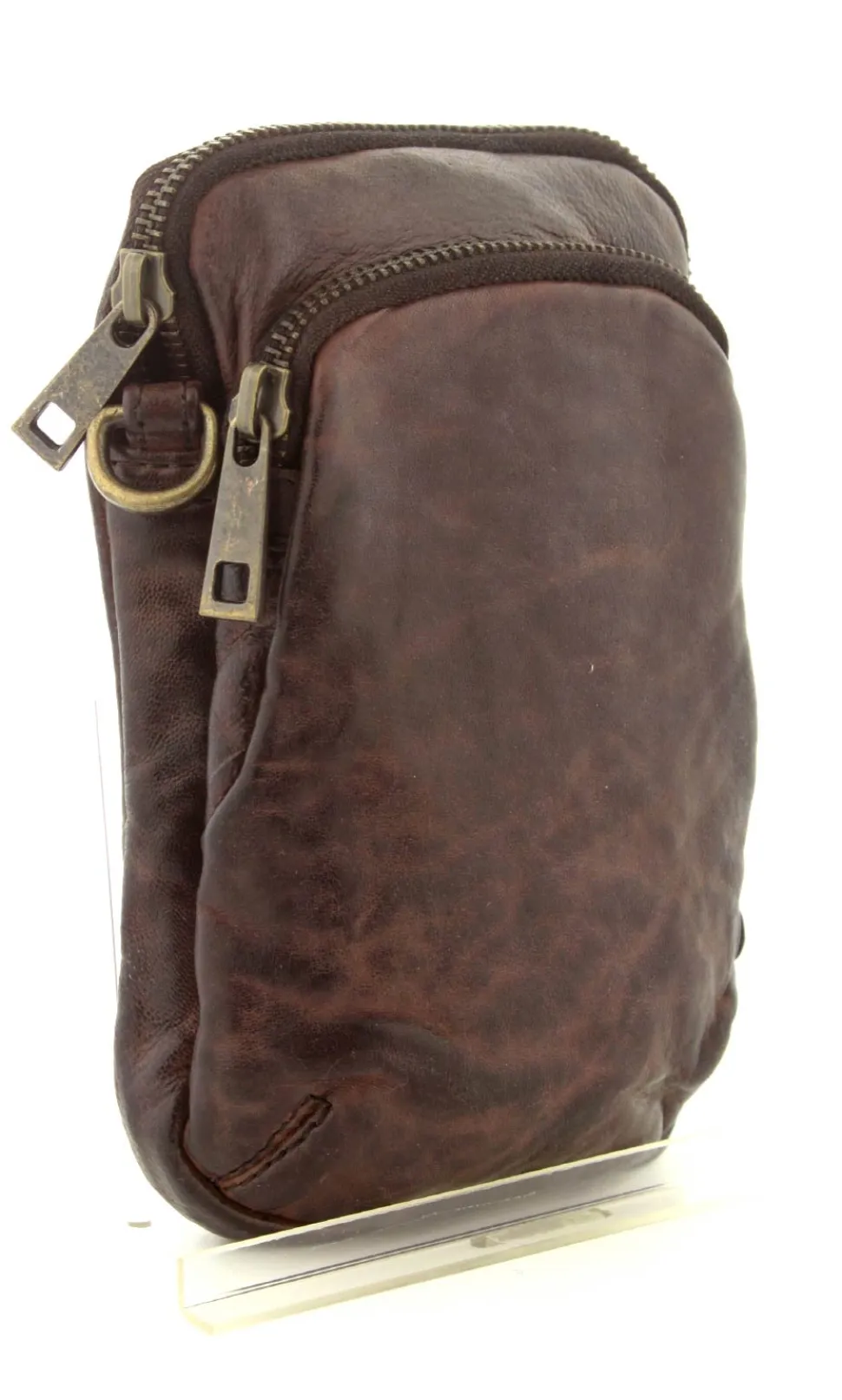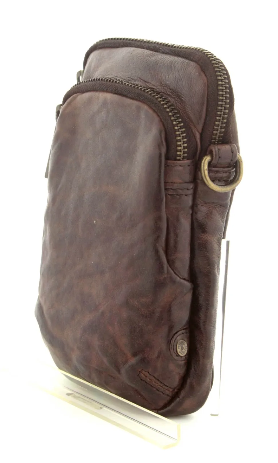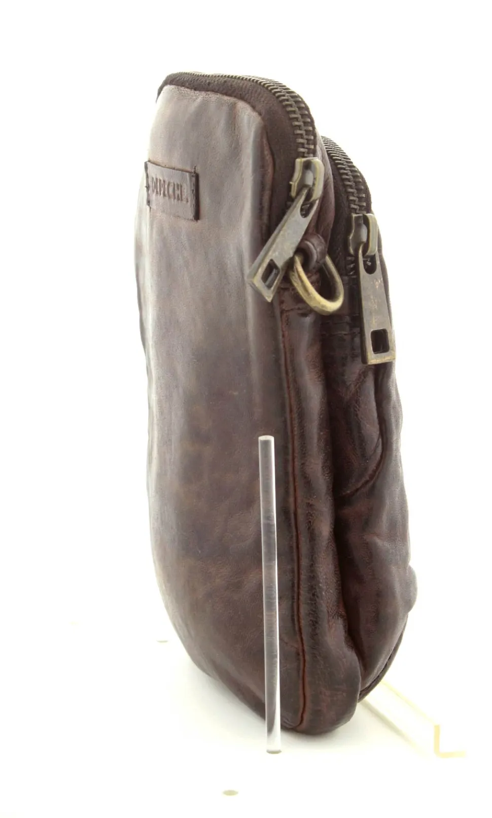 Smart lille mobiltaske fra Depeche i mørkebrunt vasket bøffelskind. Tasken er aflang i modellen, så der er plads til en stor smartphone. Der er to lynlåsrum og i det store rum er der også 4 små rum til kreditkort. Tasken fra Depeche har en lang regulerbar skulderrem.