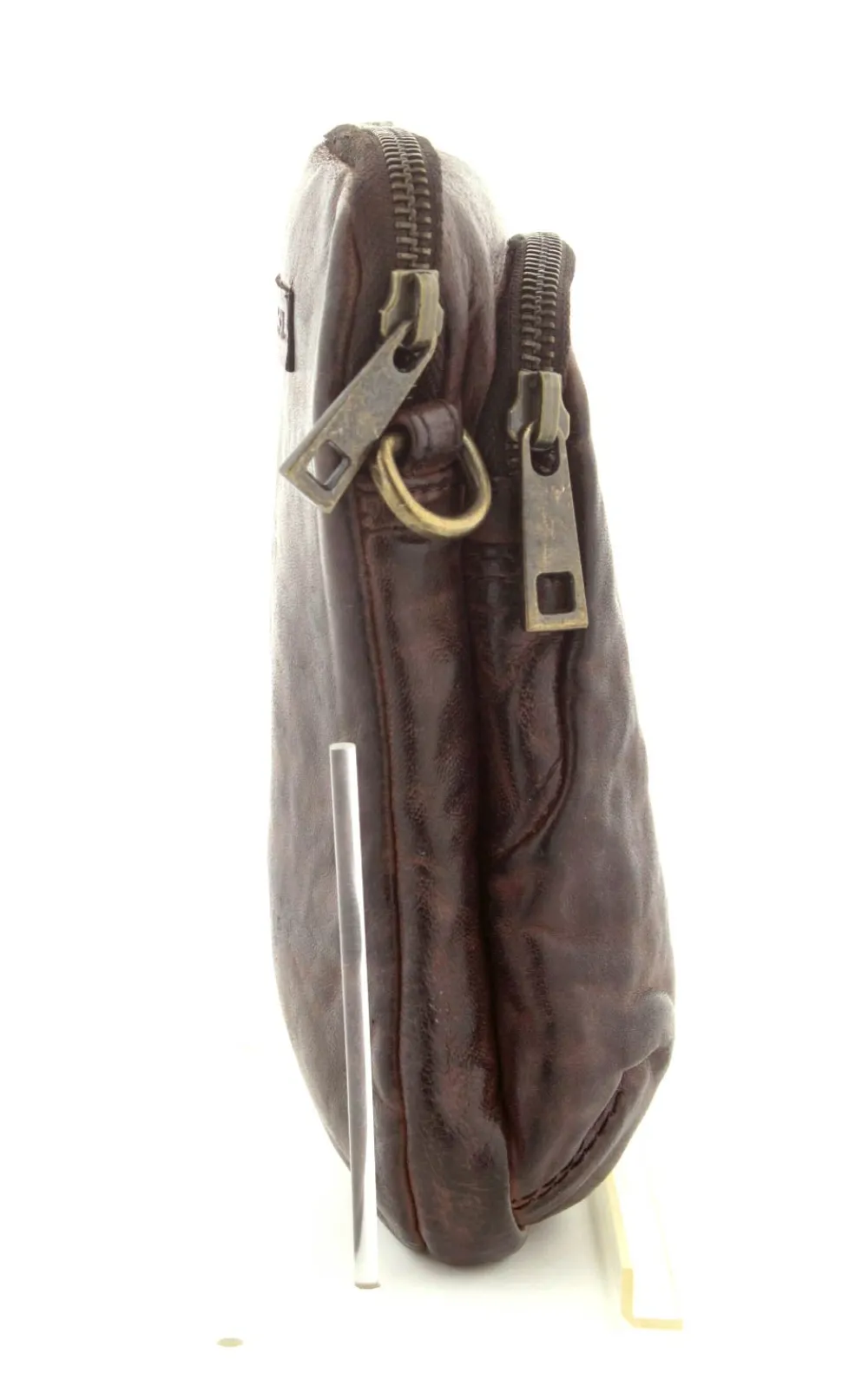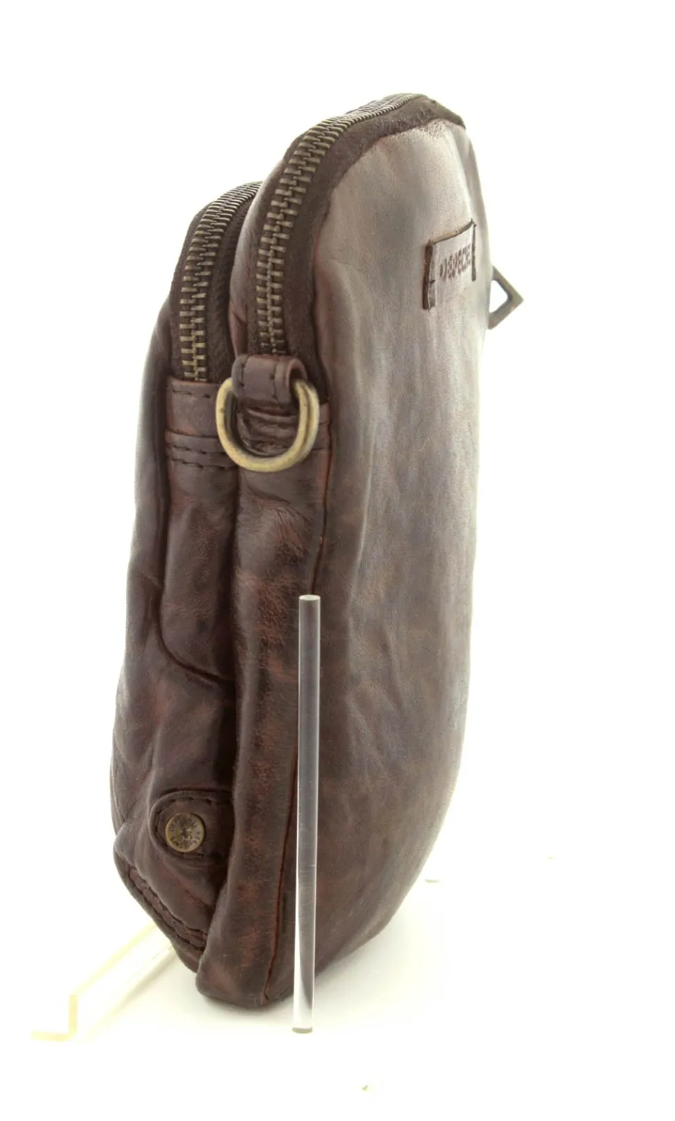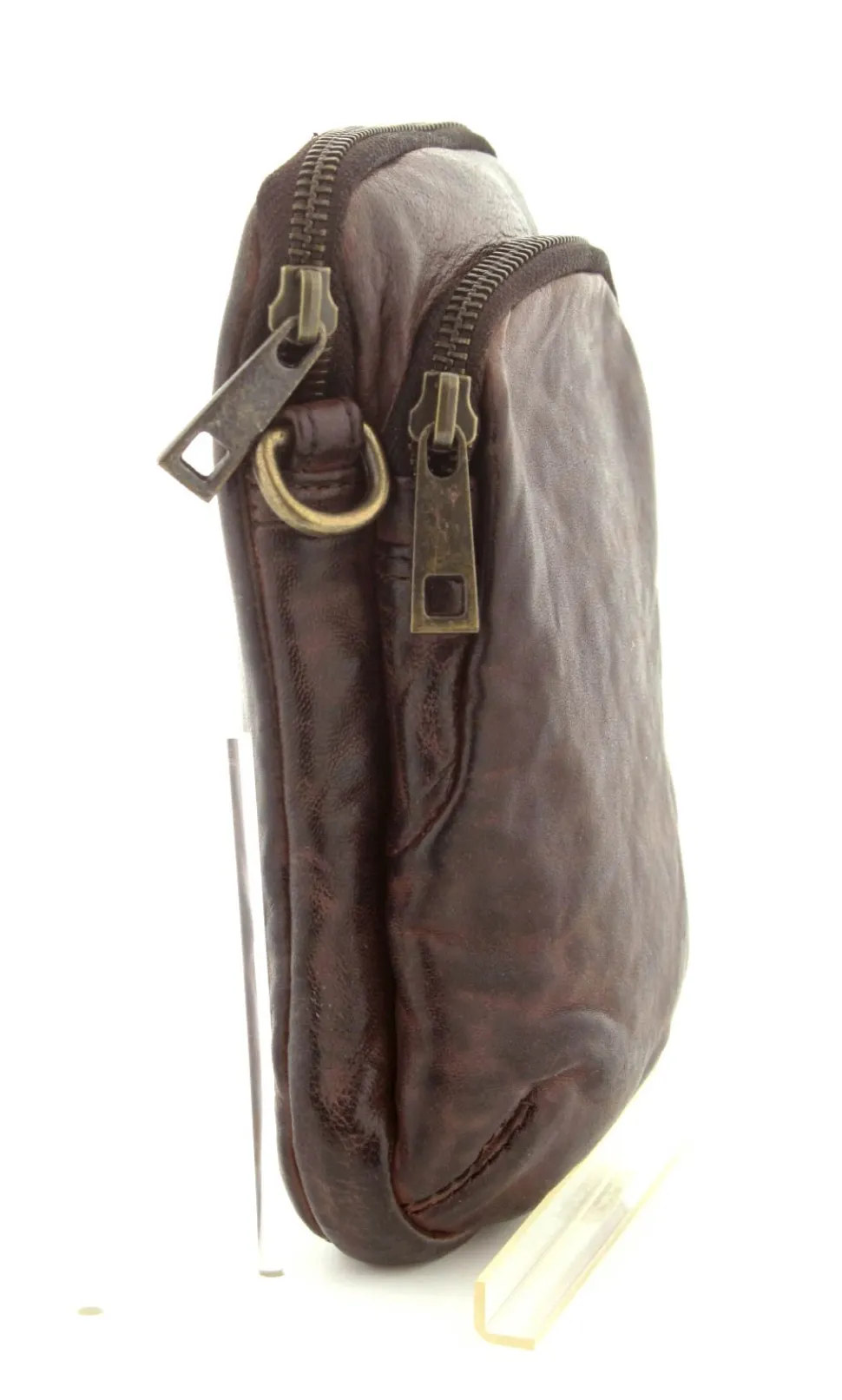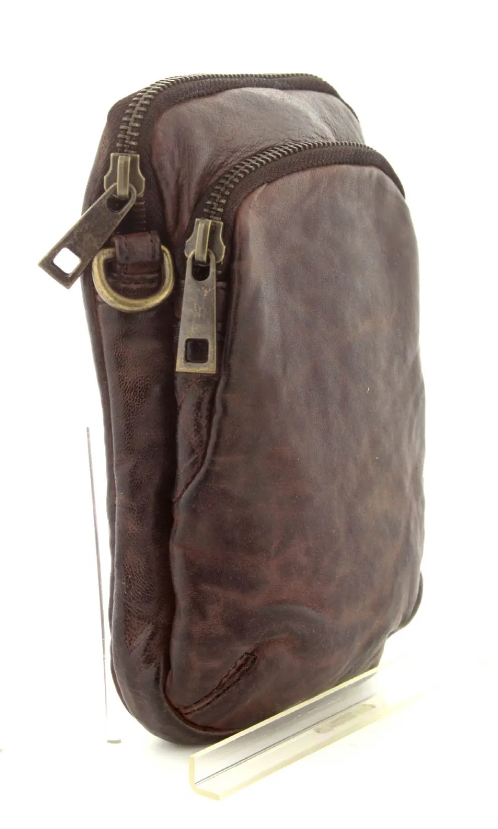 Smart lille mobiltaske fra Depeche i mørkebrunt vasket bøffelskind. Tasken er aflang i modellen, så der er plads til en stor smartphone. Der er to lynlåsrum og i det store rum er der også 4 små rum til kreditkort. Tasken fra Depeche har en lang regulerbar skulderrem.