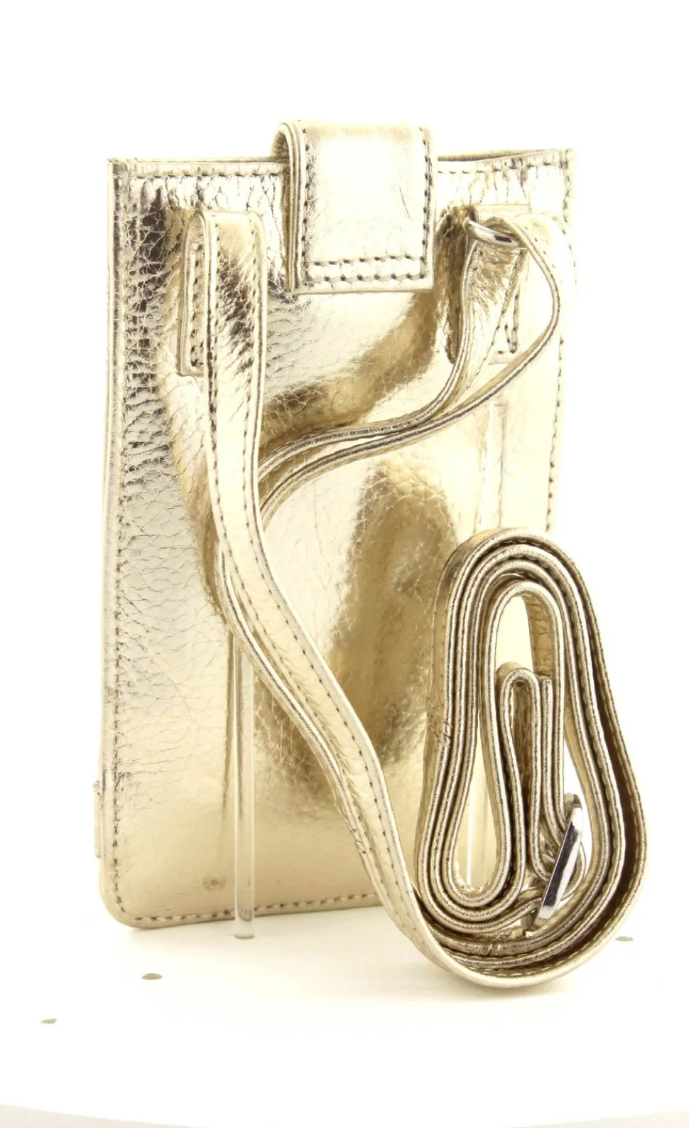 Smart skindtaske i guld til mobilen, der lukkes med magnetknap. Den lange skindrem er regulerbar.