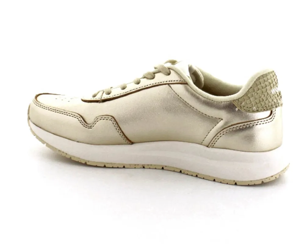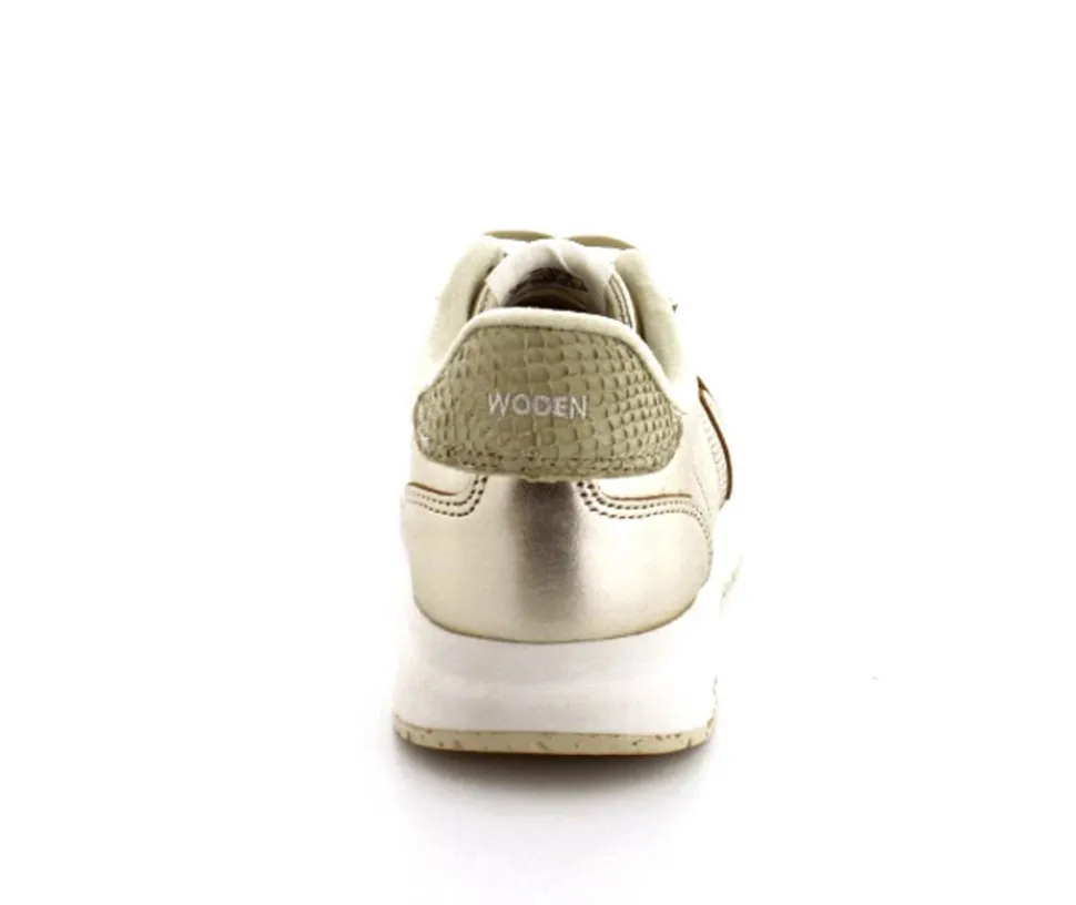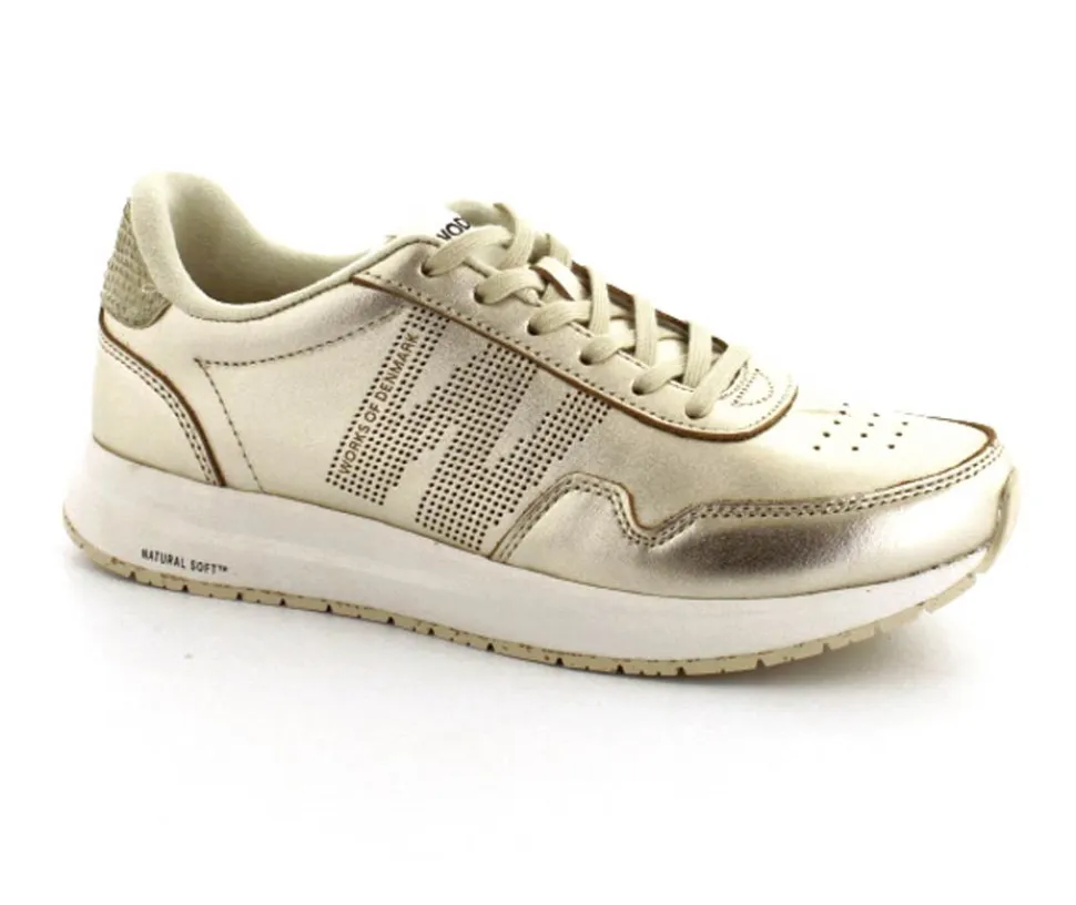 Super flotte guld sneakers i skind fra Woden model Nora. Skoen er en snøresko med Natural Soft såler, der er meget stødabsoberende. Aftagelige korksåler med ekstra svangstøtte. Gummisåler under hele bunden lavet med genbrugsgummi,