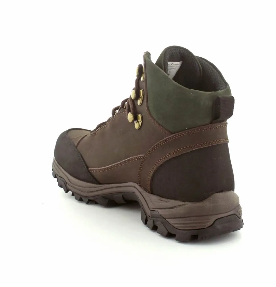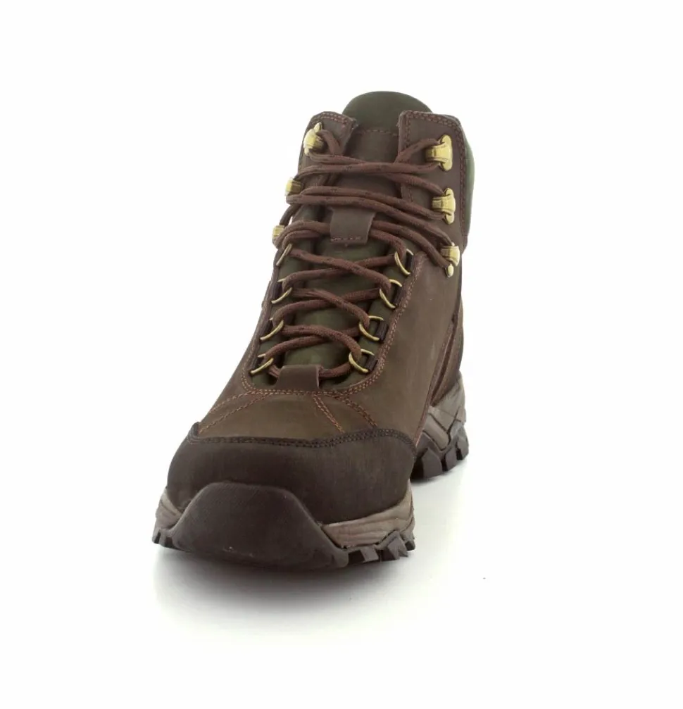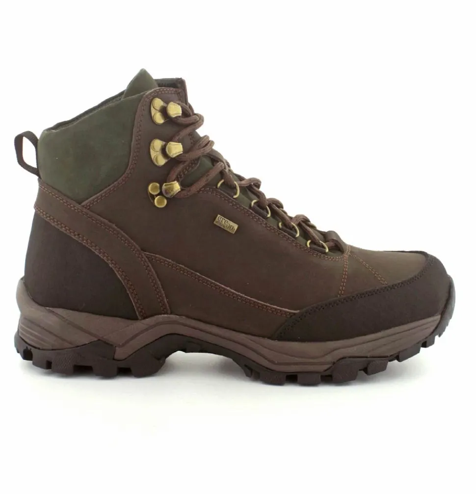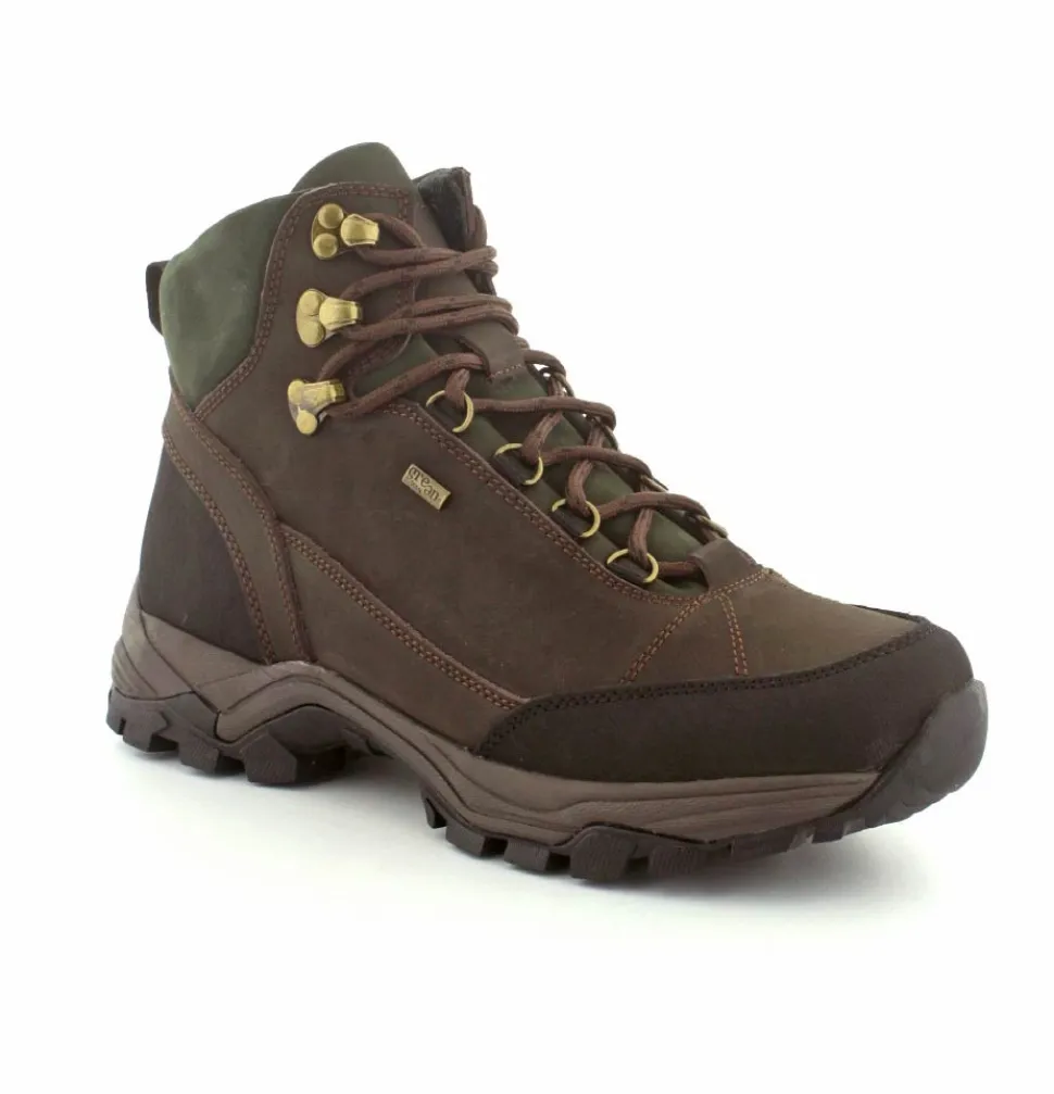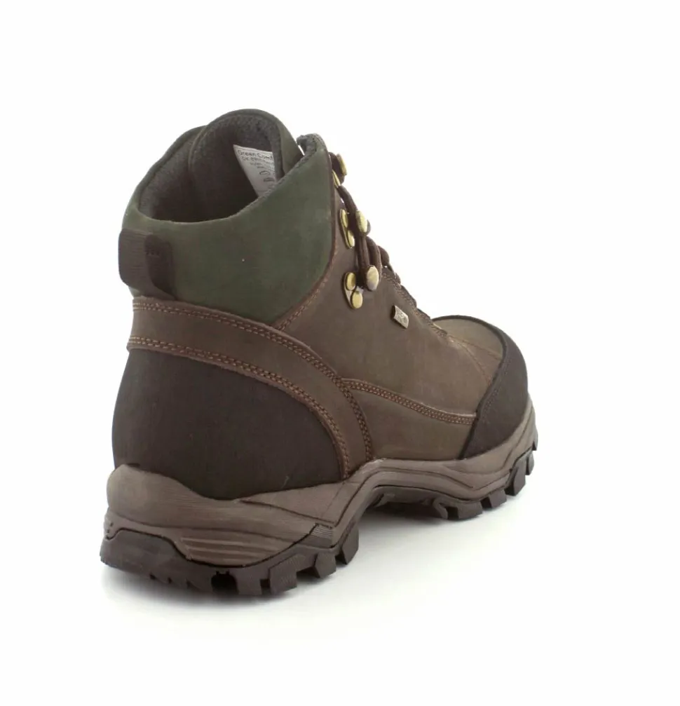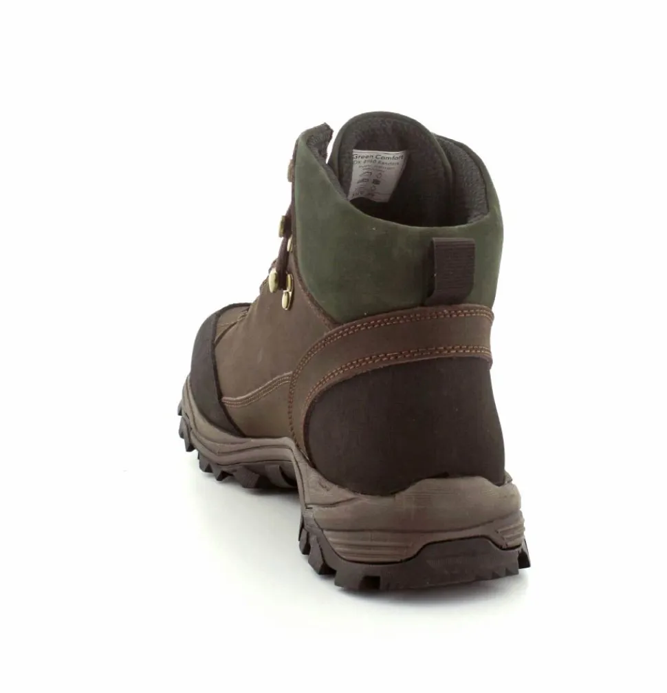 Super god vandrestøvle fra Green Comfort model North Outdoor. Støvlen er en snørestøvle i farven mørkebrun og mørk grøn. Den er lavet i skind og er med Tex-membran, så den også er vandtæt. Den aftagelig indlægssål er med ekstra svangstøtte. Gode solide gummisåler under hele bunden med god profil.