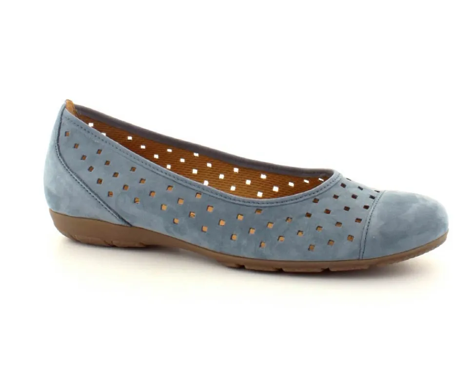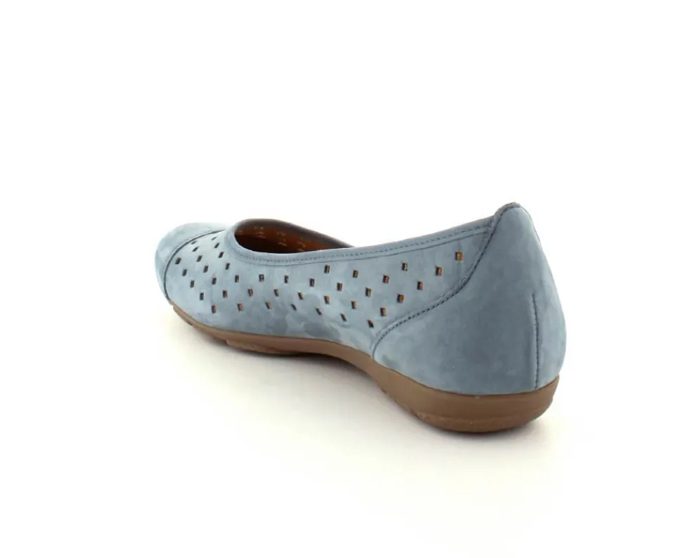 Flot og klassisk ballerina fra Gabor i flot lyseblå nubuck skind. Der er udskæringer i skindet, så den er dejlig luftig. Bløde skindsåler indeni og gummisåler under bunden.
