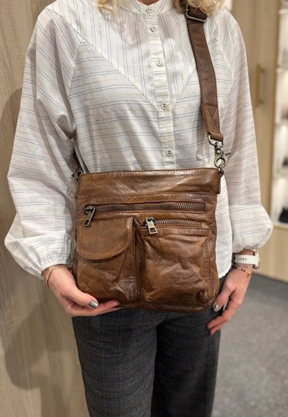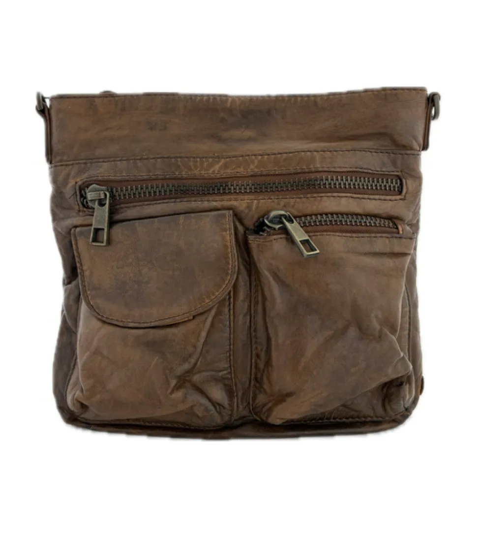 Super flot crossover i en flot brun farve i vasket bøffel skind. Tasken er med lommer og rum på fronten, og åbnes i toppen med lynlås. Indeni er der et stort rum med små rum og lynlåsrum. Det er en god mellemstørrelse og hænger flot til på hoften, da det er en aflang model. Der medfølger en lang regulerbar skulderrem.