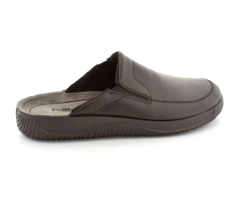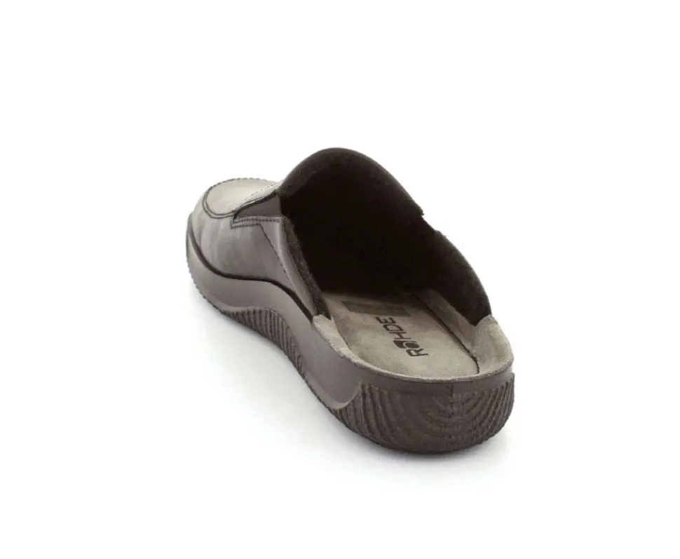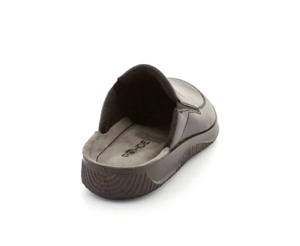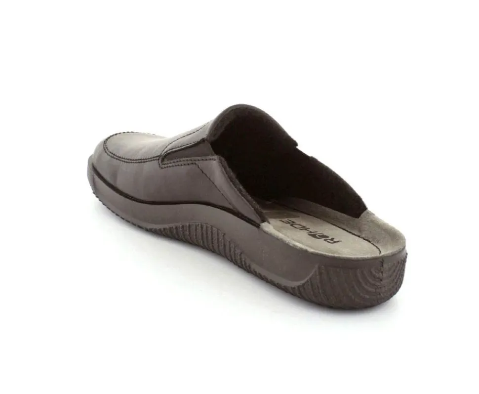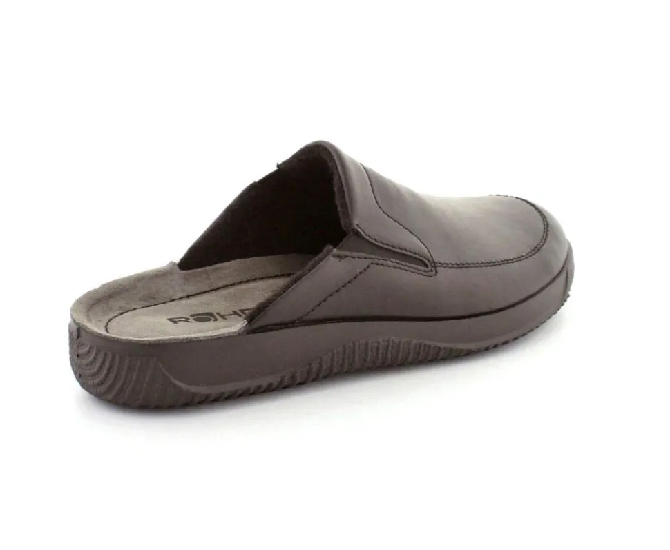 Rigtig god hjemmesko fra Rohde i sort skind. Modellen er en slippers model, så den er lige til at smutte i. Den rummer godt i bredden og har elastik på begge sider af vristen, så den kan give sig efter behov. Hjemmeskoen fra Rohde er varmt foeret indeni og har ruskindssåler i bunden. Blød og lækker at gå på. Der er gode solide gummisåler under hele bunden.