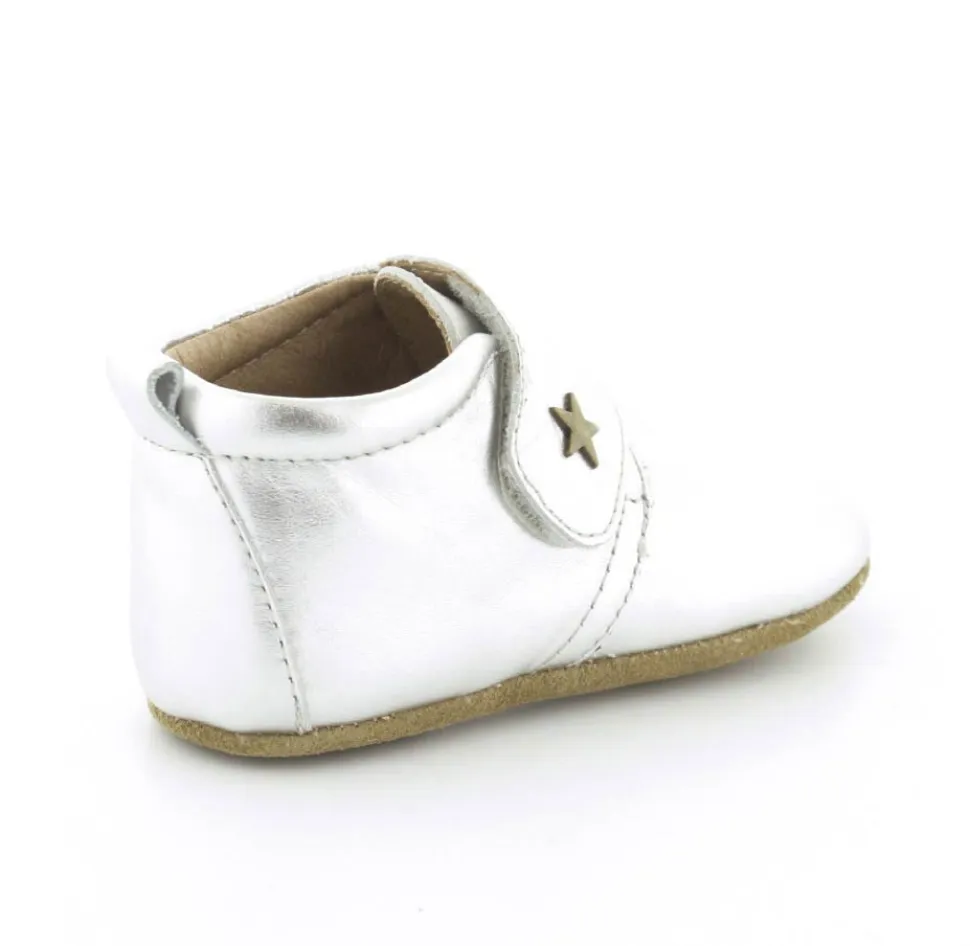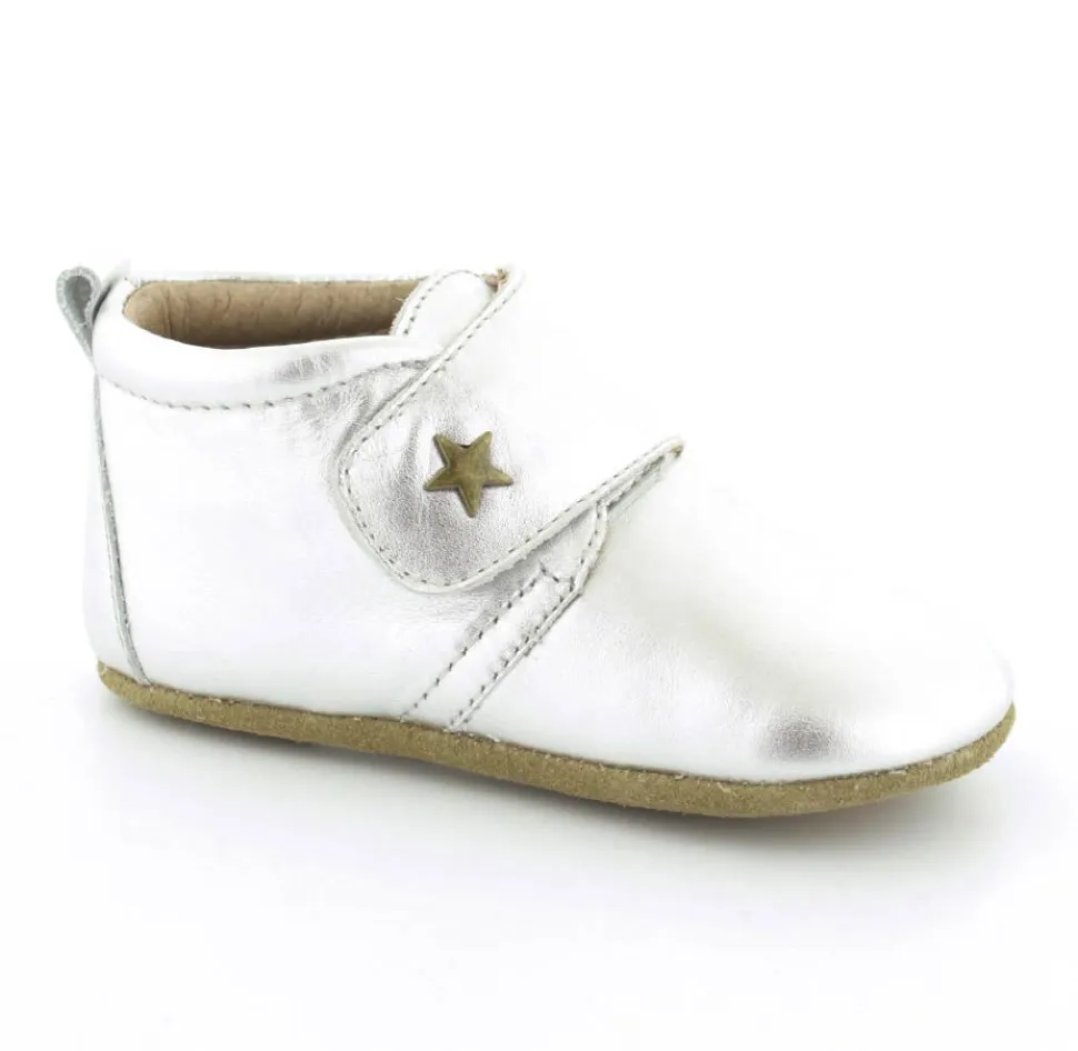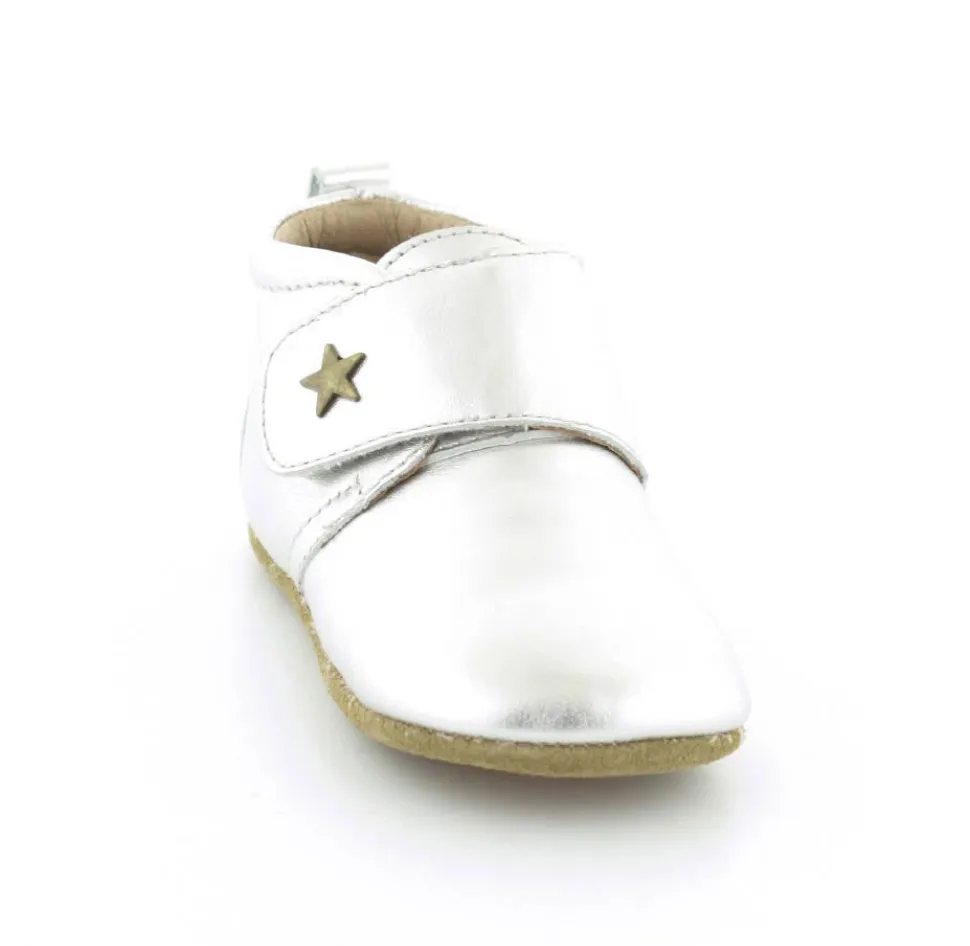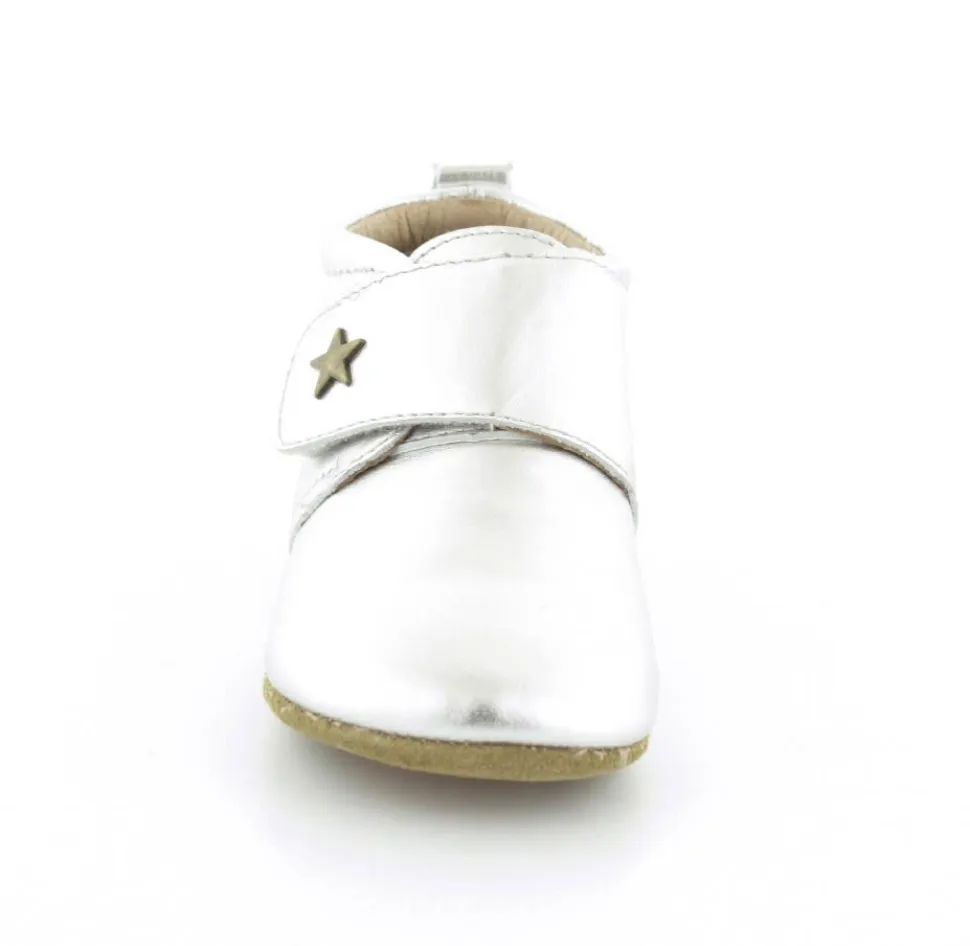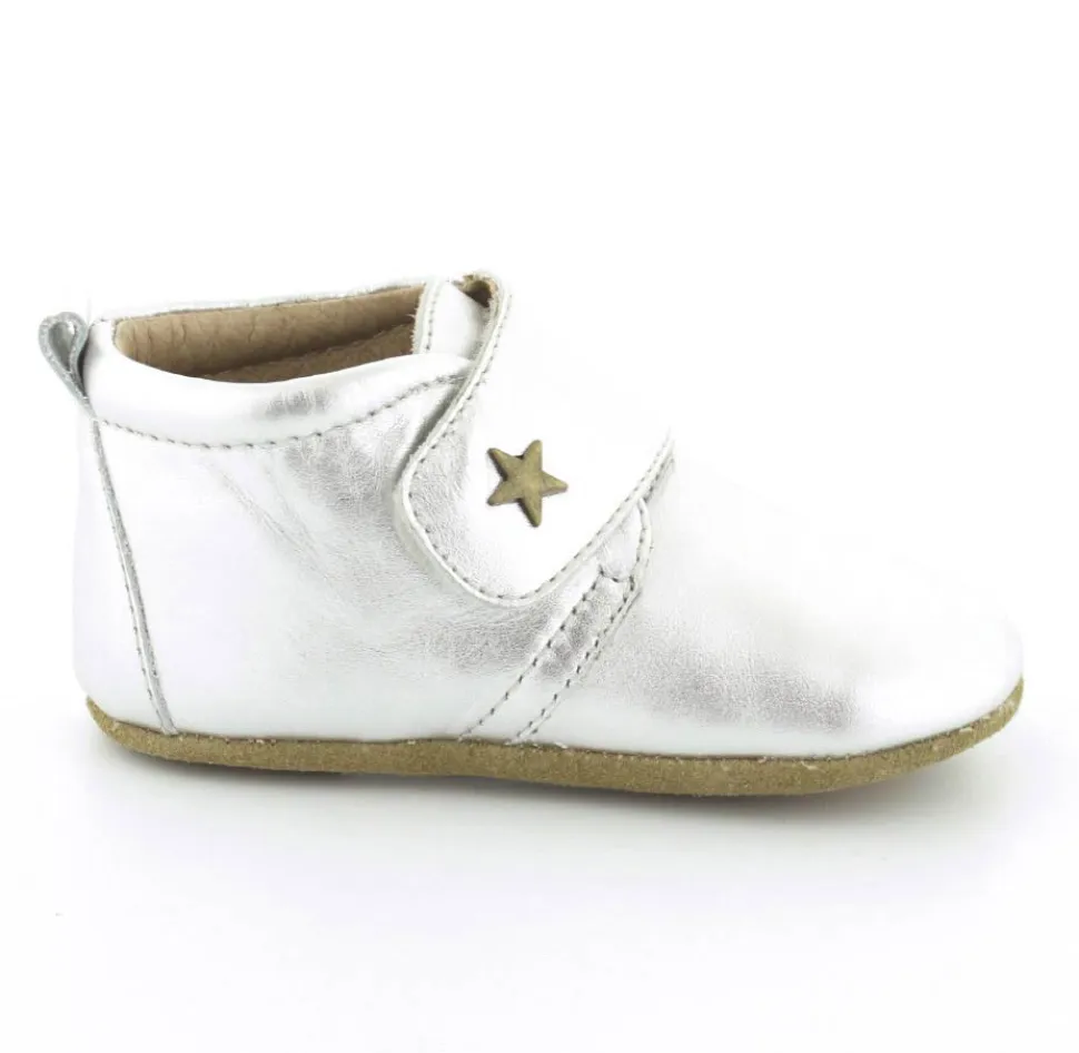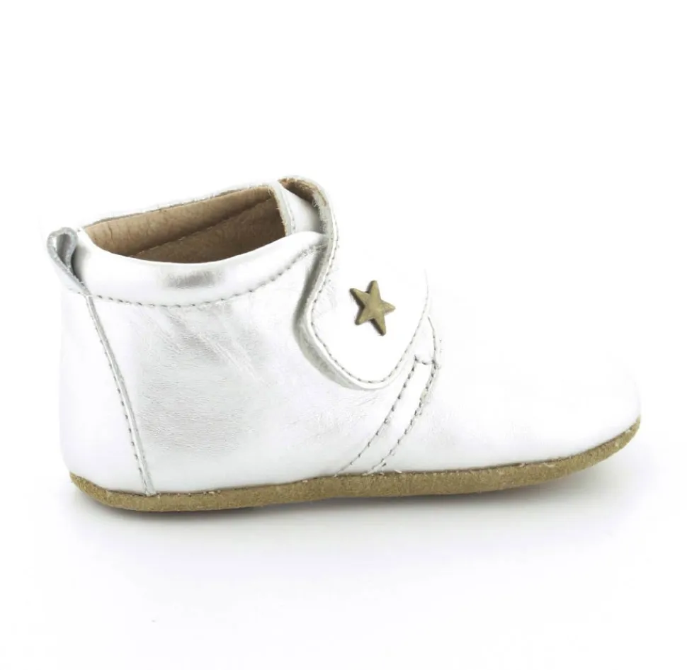Super fin hjemmesko fra Bisgaard i sølvfarvet skind. Skoen har en god fast hælkappe og velcrorem med stjerne på. Nem at komme i og stramme til på barnets fod. Skoen støtter godt og kan fint bruges som den første kravle/gå sko til indendørs brug. Skoen fra Bisgaard er foeret inden i med skind og har ruskindsbund med gummifelter under, så barnet står godt fast.