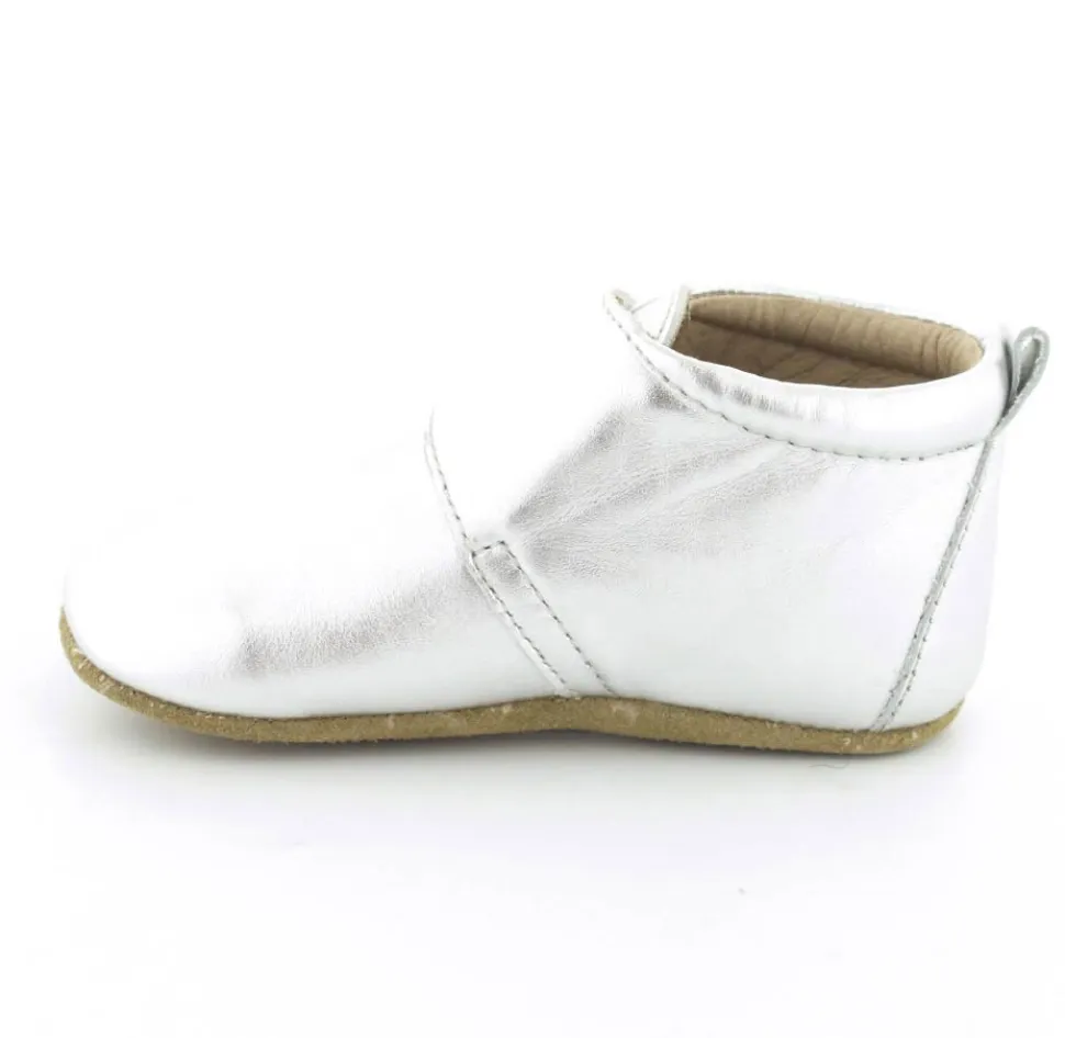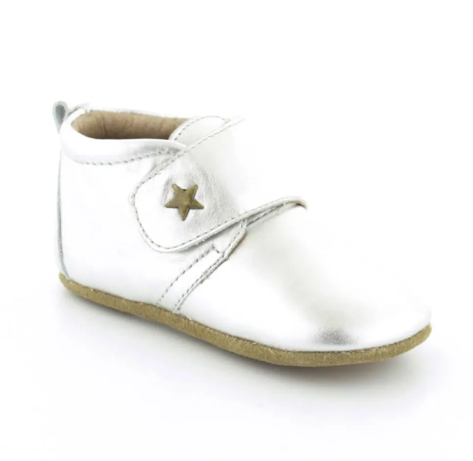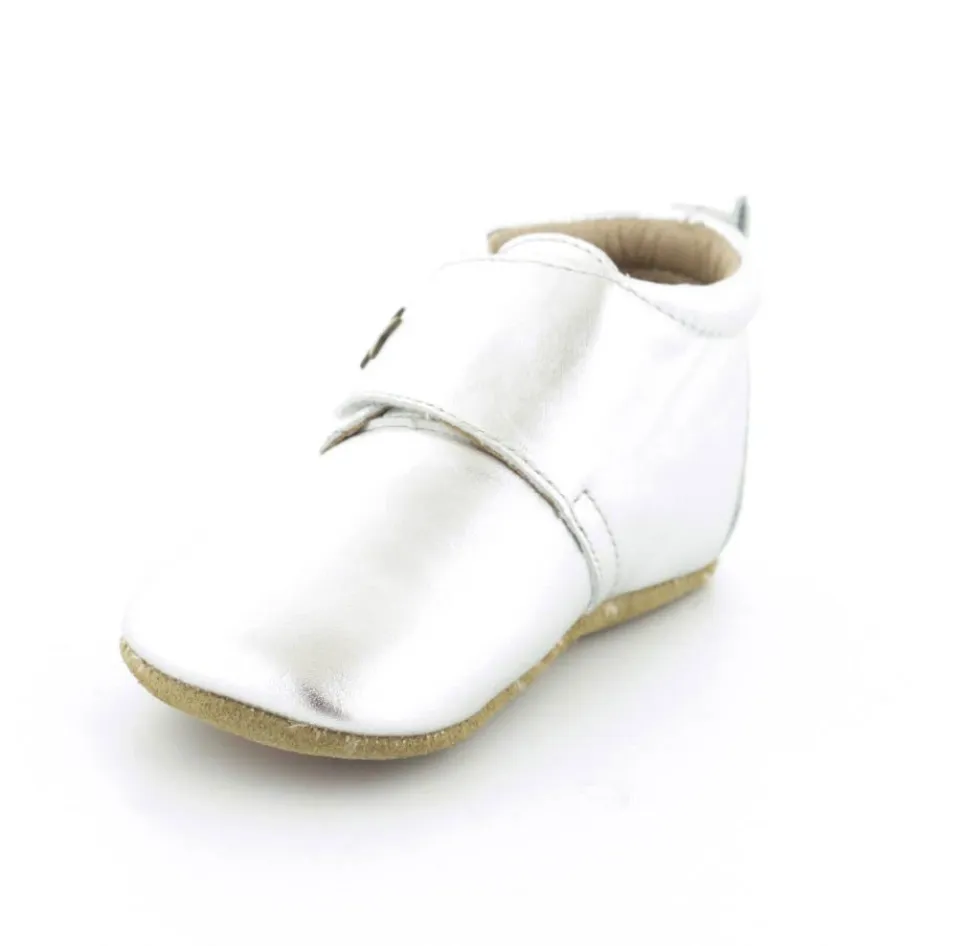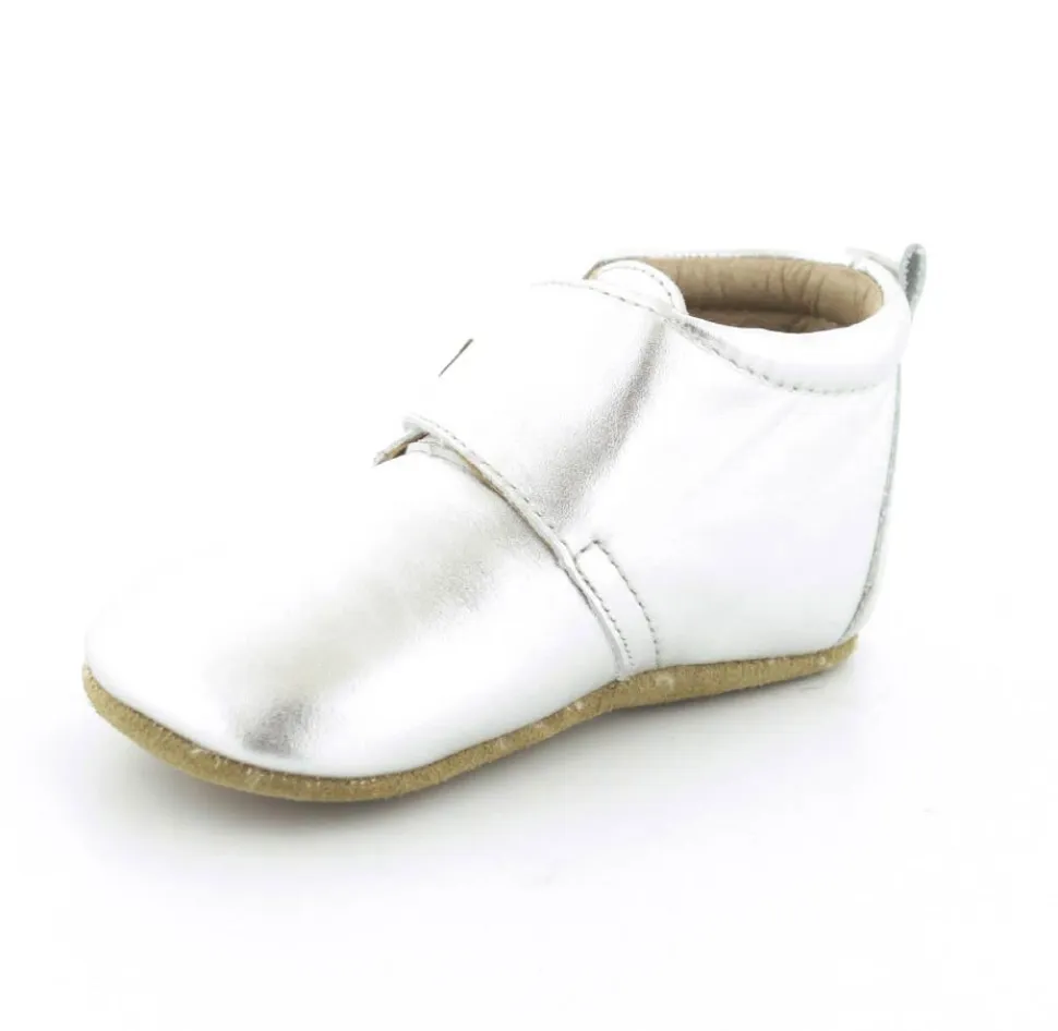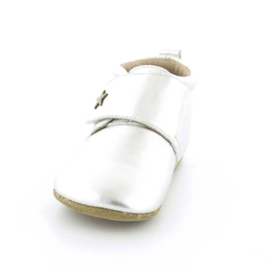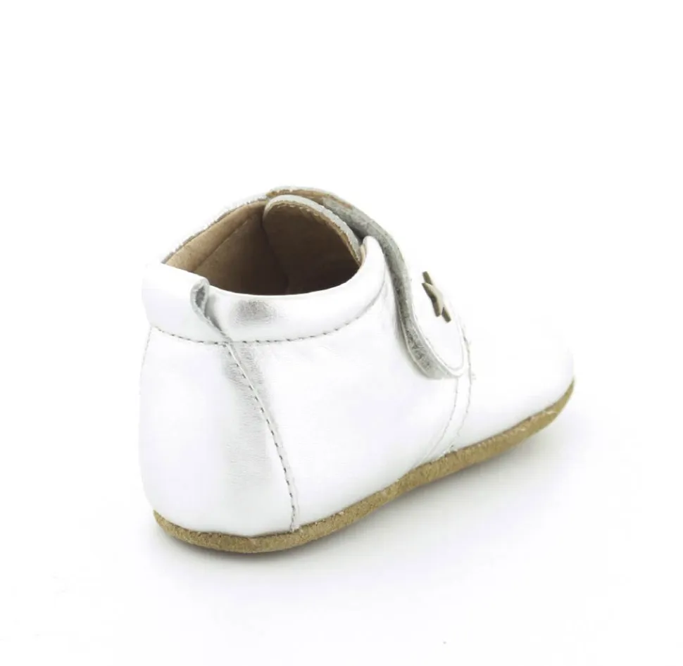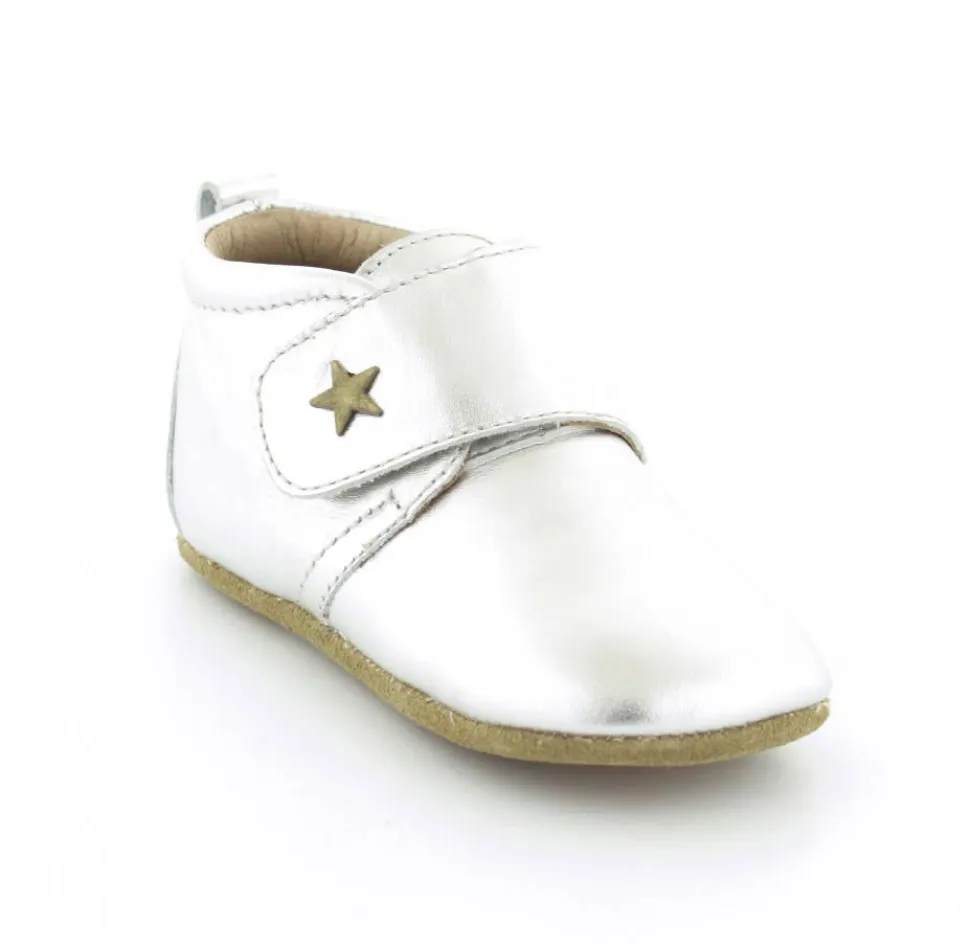 Super fin hjemmesko fra Bisgaard i sølvfarvet skind. Skoen har en god fast hælkappe og velcrorem med stjerne på. Nem at komme i og stramme til på barnets fod. Skoen støtter godt og kan fint bruges som den første kravle/gå sko til indendørs brug. Skoen fra Bisgaard er foeret inden i med skind og har ruskindsbund med gummifelter under, så barnet står godt fast.