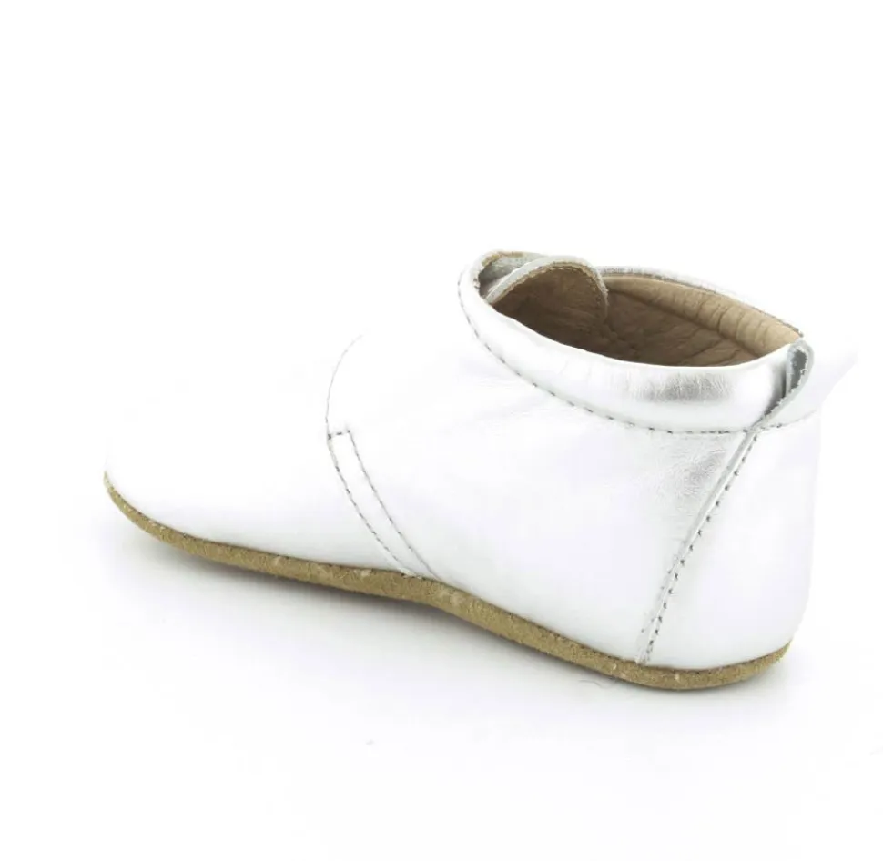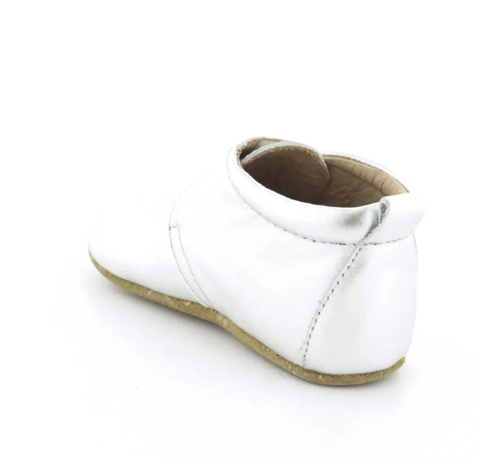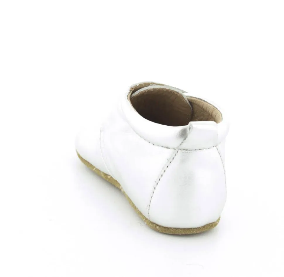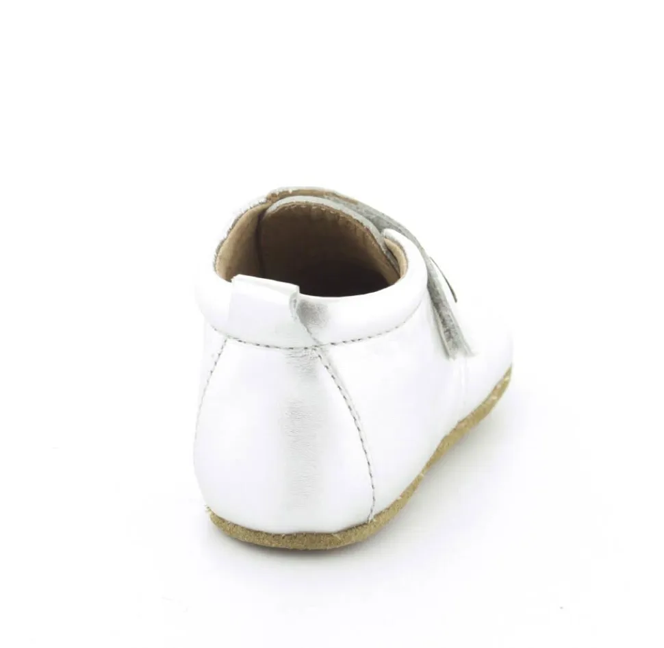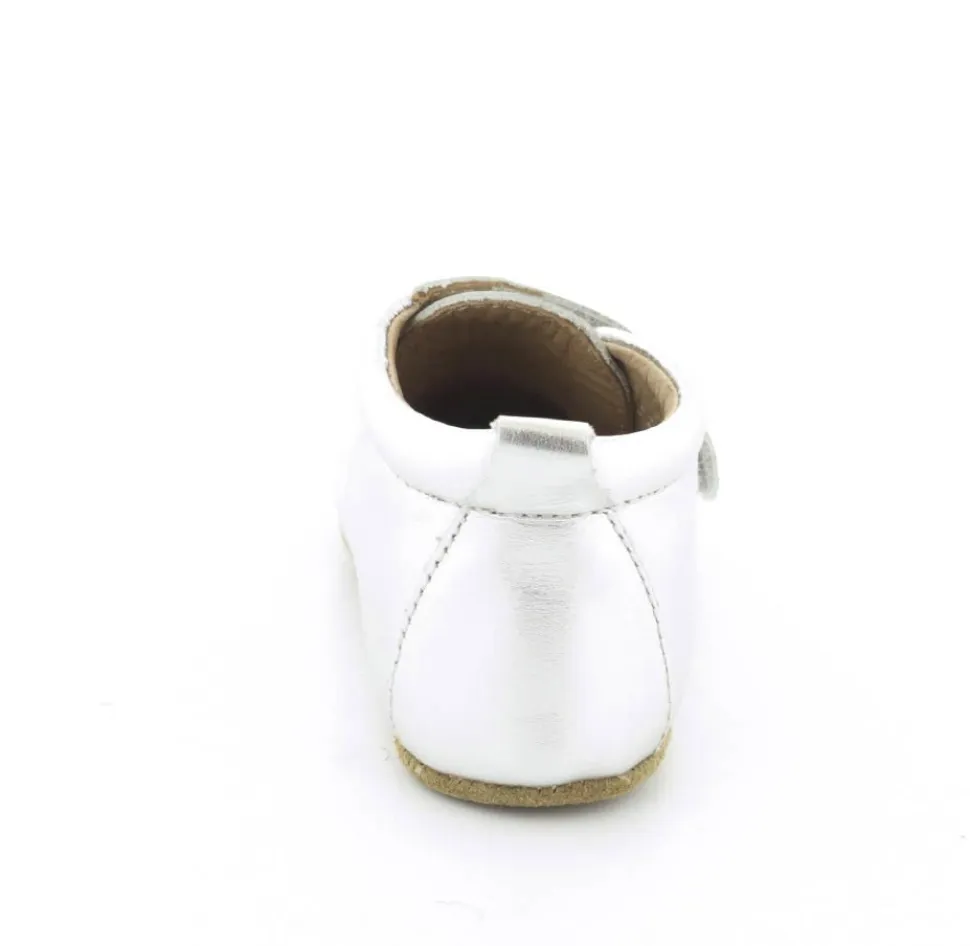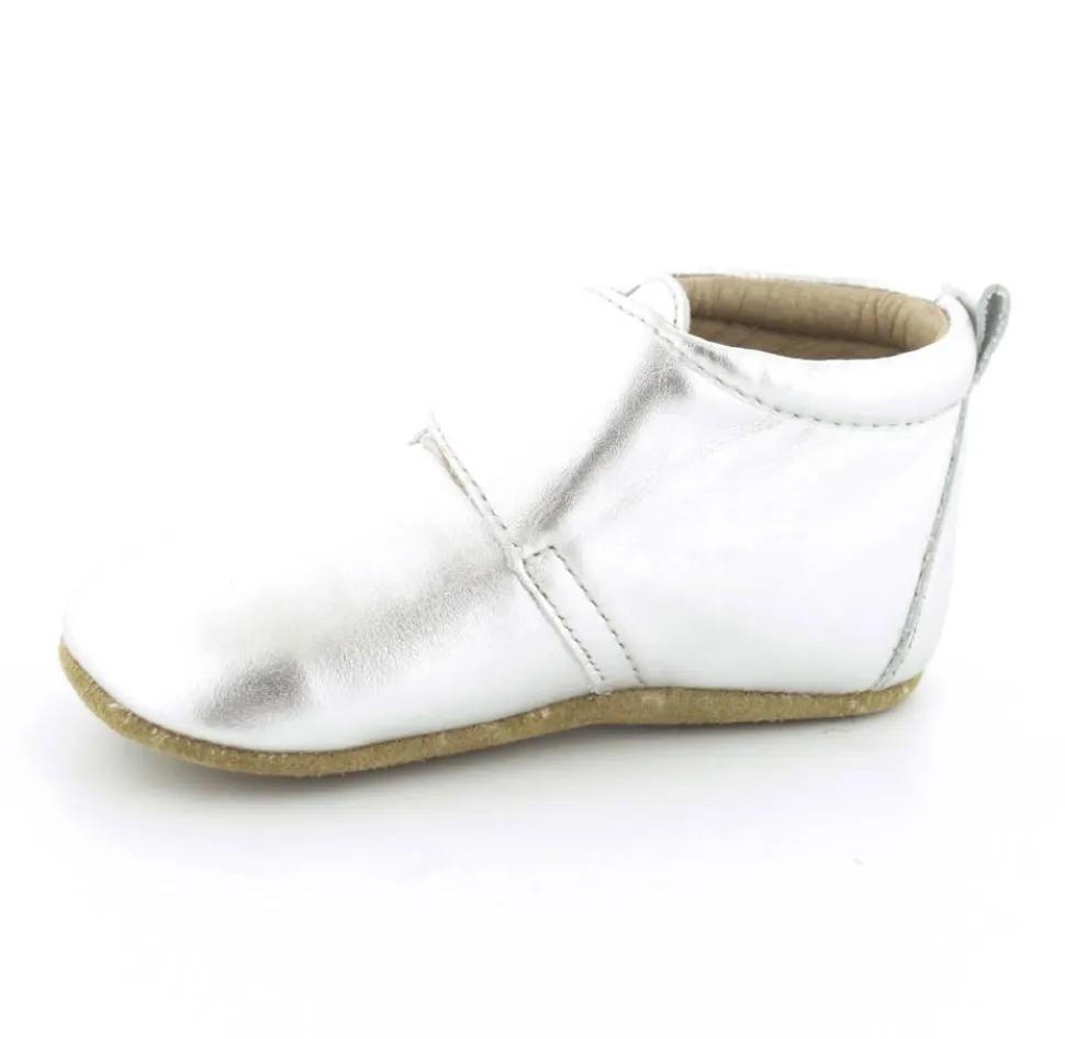 Super fin hjemmesko fra Bisgaard i sølvfarvet skind. Skoen har en god fast hælkappe og velcrorem med stjerne på. Nem at komme i og stramme til på barnets fod. Skoen støtter godt og kan fint bruges som den første kravle/gå sko til indendørs brug. Skoen fra Bisgaard er foeret inden i med skind og har ruskindsbund med gummifelter under, så barnet står godt fast.