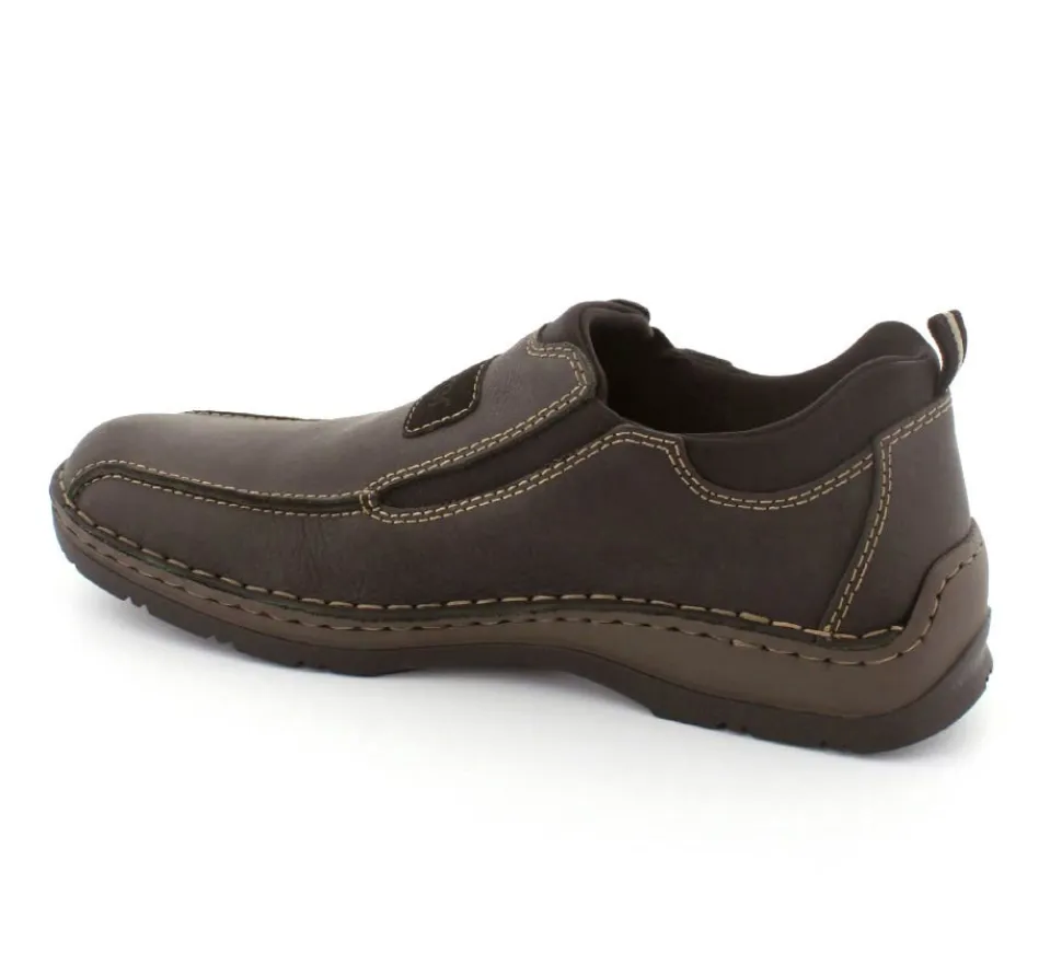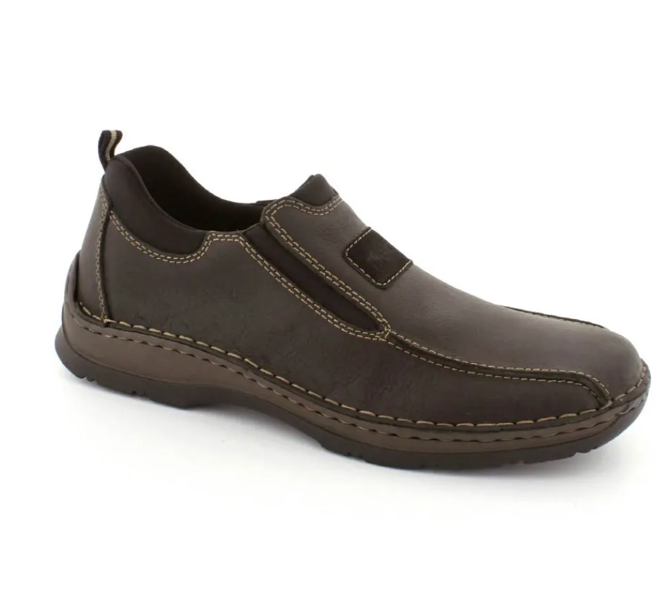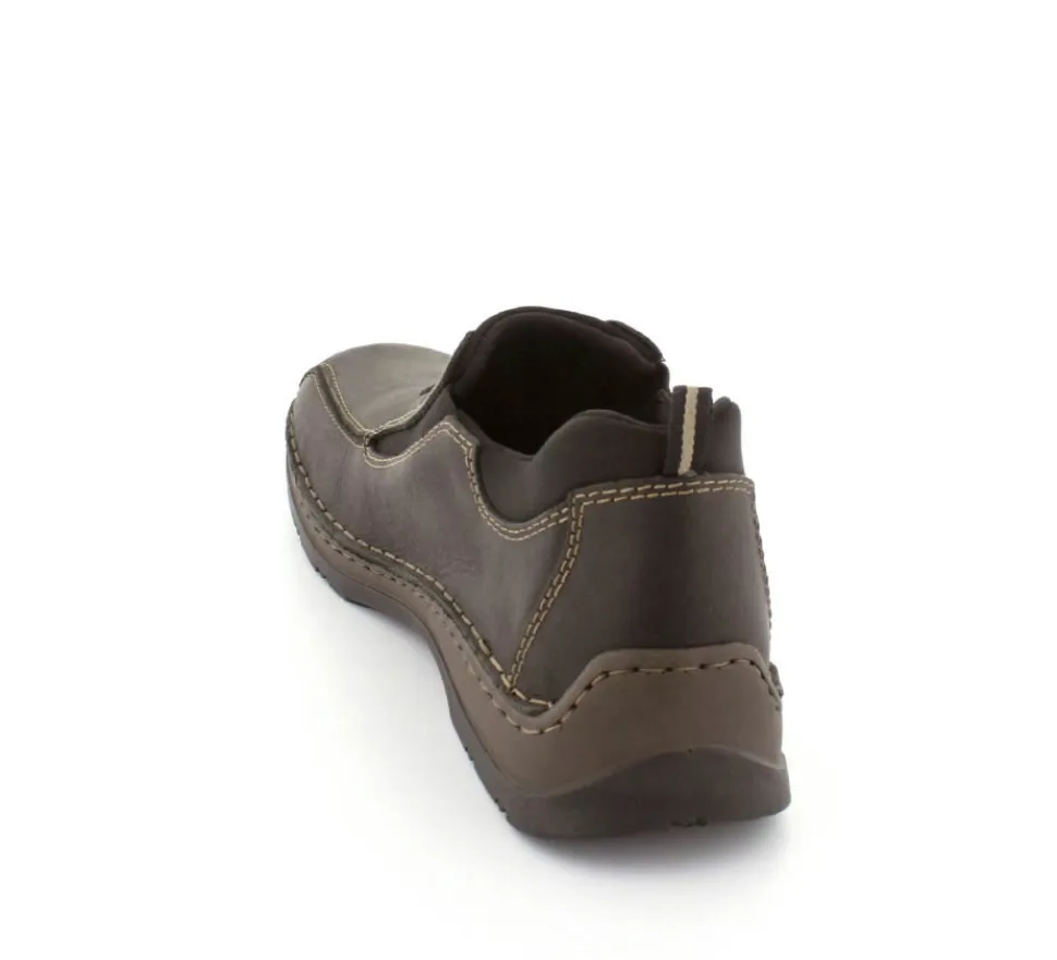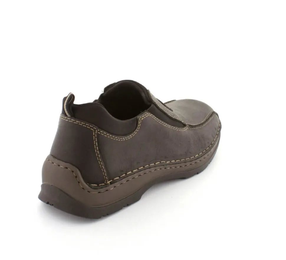 Klassiske hyttesko fra Rieker i sort oilieret skind med lyse stikninger. Skoen er lige til at smutte i, da der er elastik på begge sider af vristen. Skoen rummer godt i bredden da den er med extra vidde. Skinddækssål indeni og bløde, fleksible, og stødabsoberende såler under hele bunden.