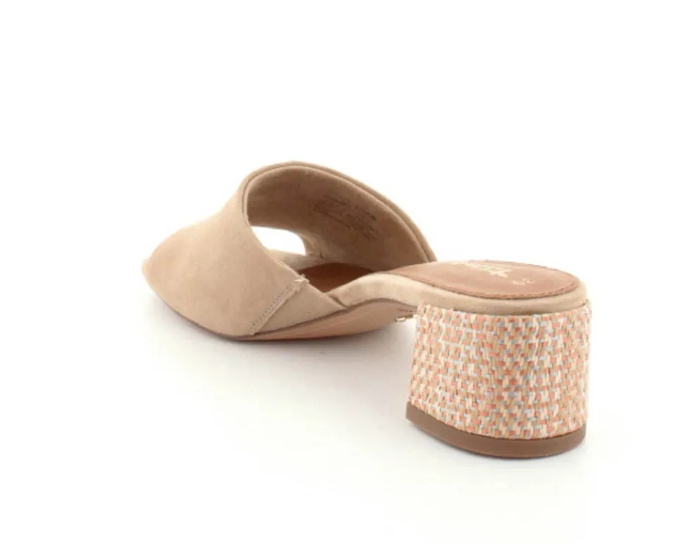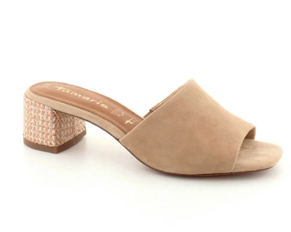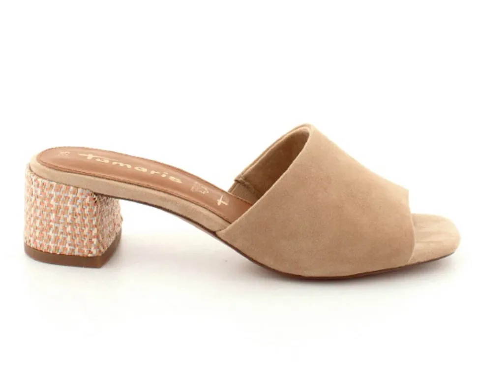 Smuk slippers med hæl fra Tamaris i ruskind og i en flot lys farve. Sandalen har en god bred rem ved forfoden, der dækker flot ind og som rummer godt. Bløde skindsåler indeni og en nem blokhæl at gå på. Den har både “AntiSlide” og “AntiShokk”