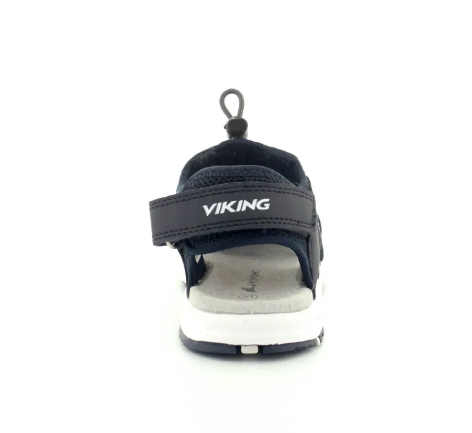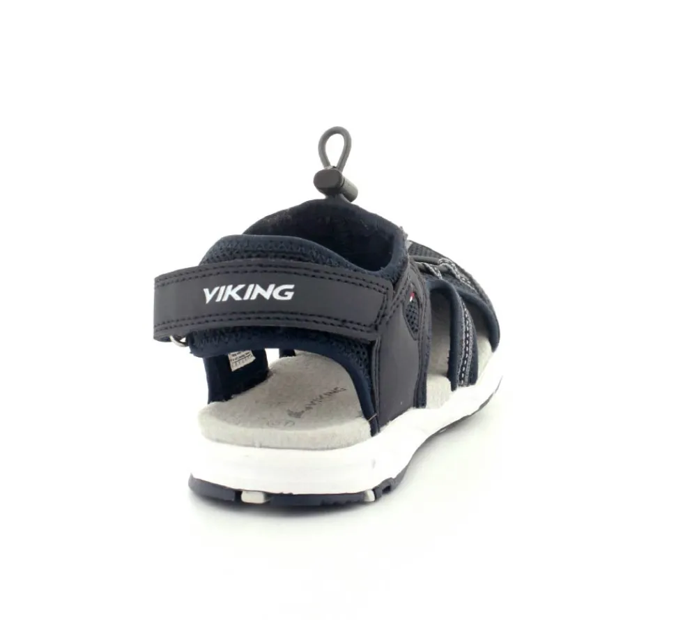 Sporty og gode sandaler fra Viking model Thrill i mørkeblå. Sandalen er med lukket snude og er perfekt til de drenge der gerne vil spille fodbold og ikke have en rigtig sandal på. Den rummer godt i bredden og kan strammes med elastiklukningen. Der er velcrorem bagpå. Bløde, fleksible og stødabsoberende såler. Sandalen kan vaskes.