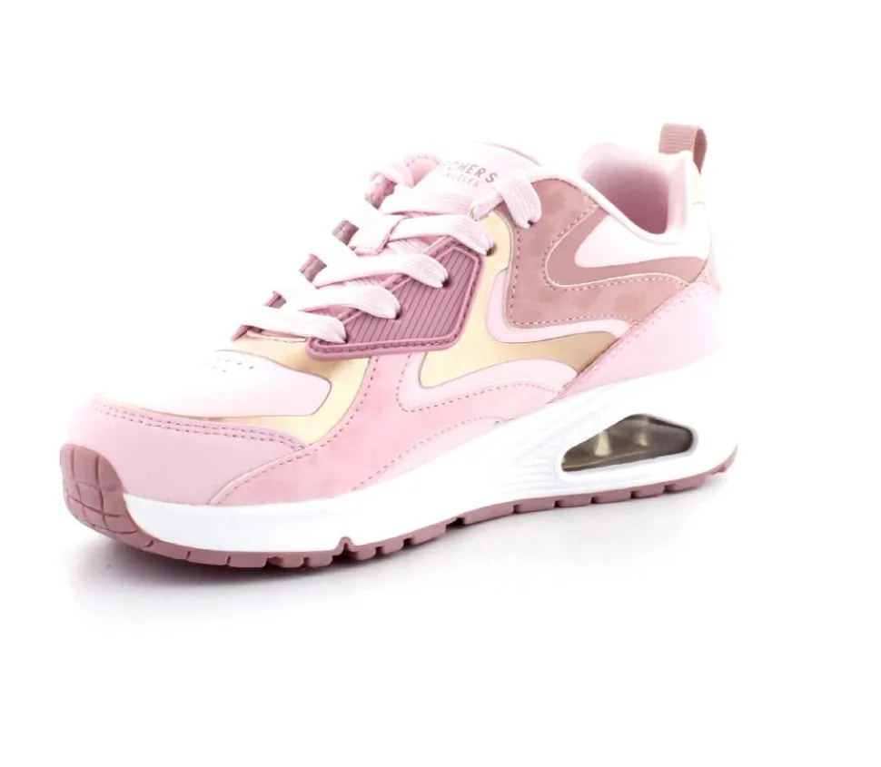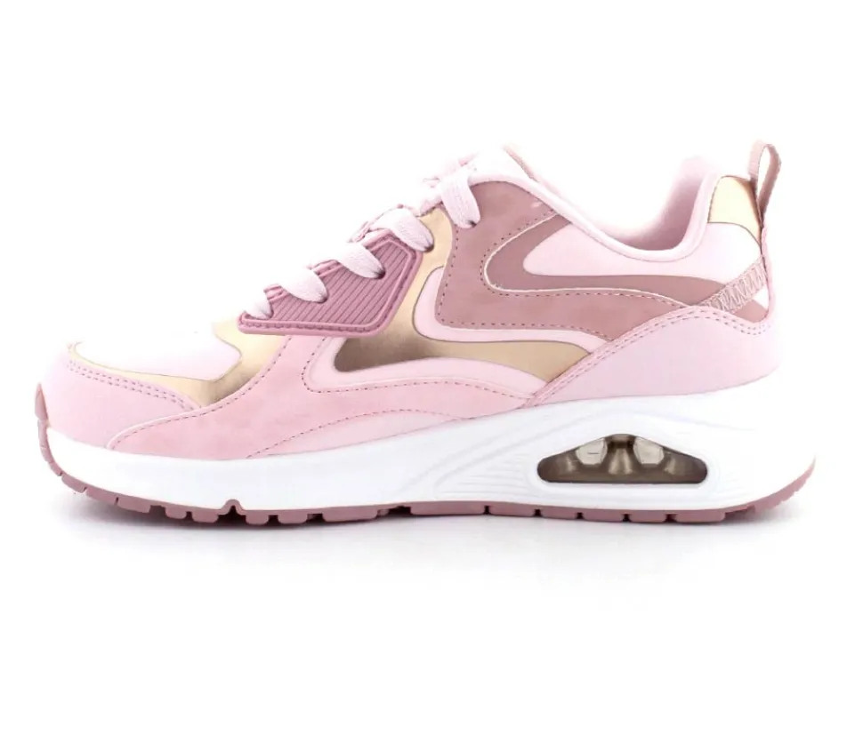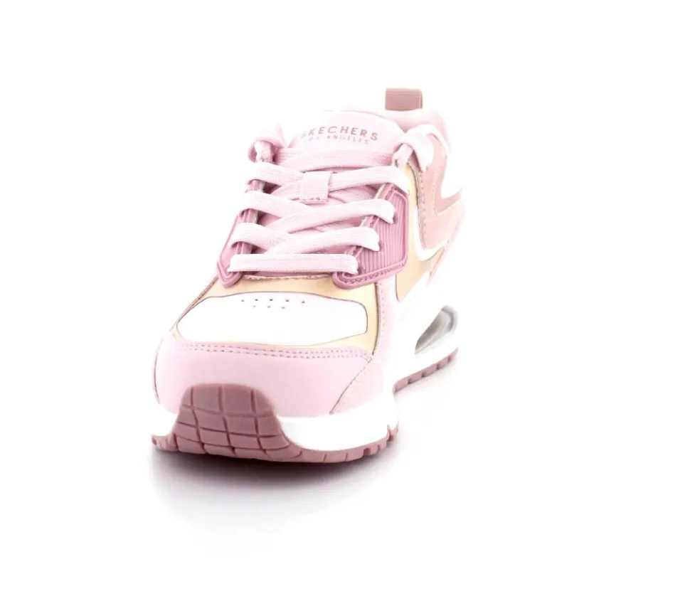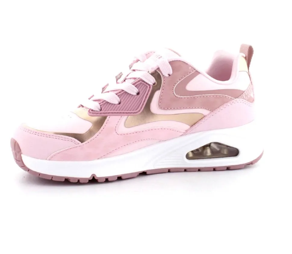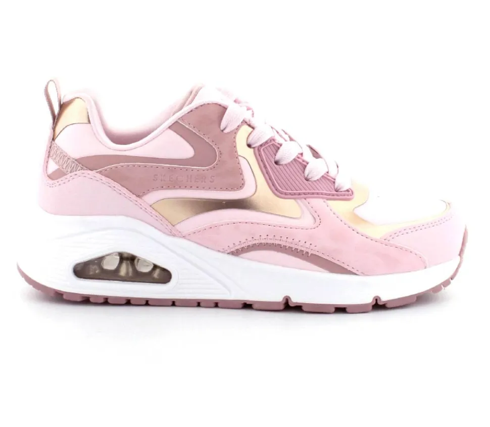 Super flotte lyserøde sneaks fra Skechers model Uno Gen med guld detaljer på. Skoen er en snøresko med ekstra tykke og stødabsoberende såler under.