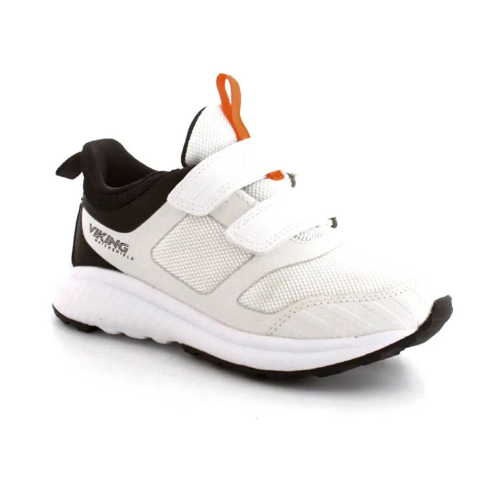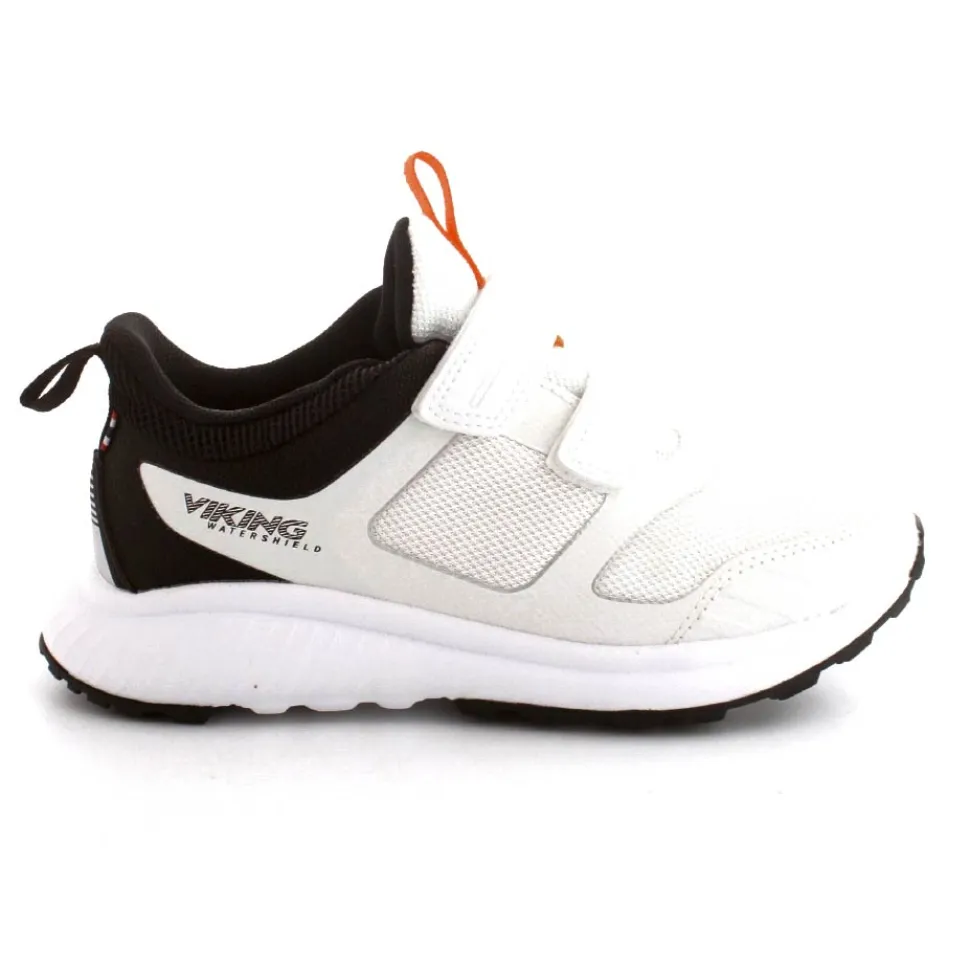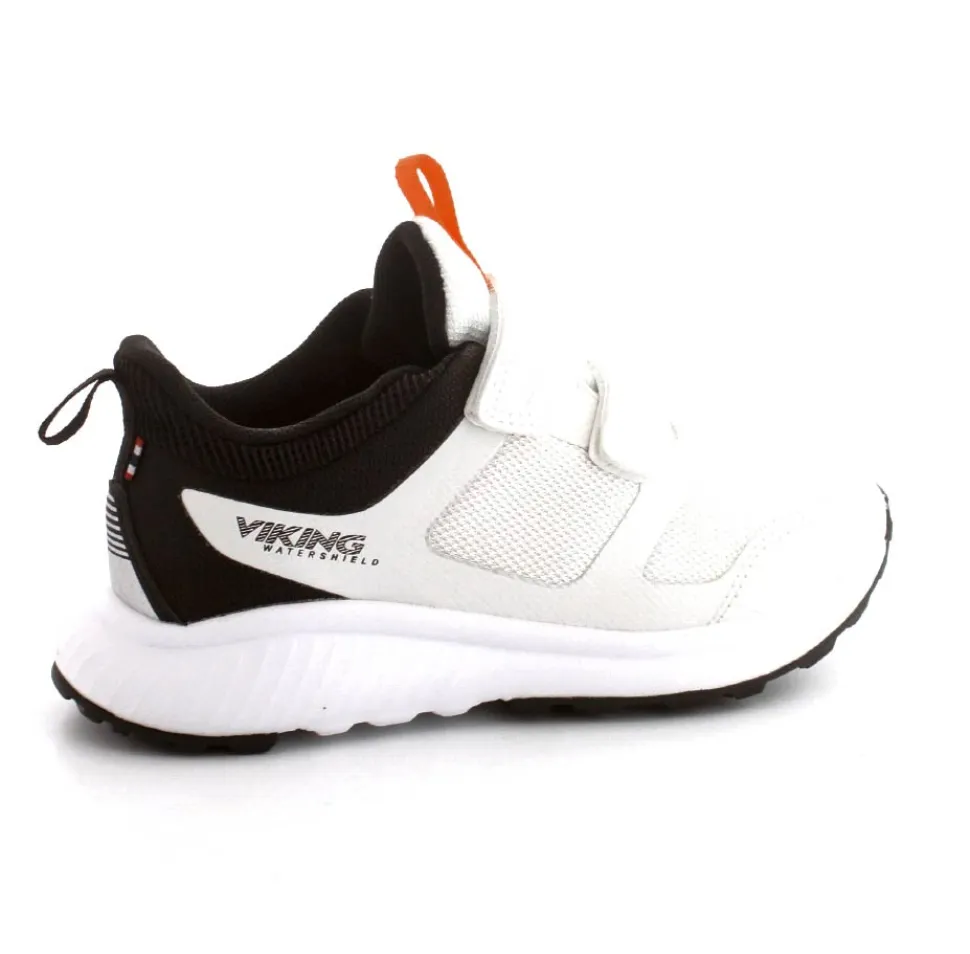 Super smart sneakers fra Viking model Aery Watershield i hvid med fede detaljer på. Skoen er vandtæt og med to regulerbare velcroremme. Den er let, god fast hælkappe og stødabsoberende såler under hele bunden. Og så kan den vaskes 30 grader skånevask.