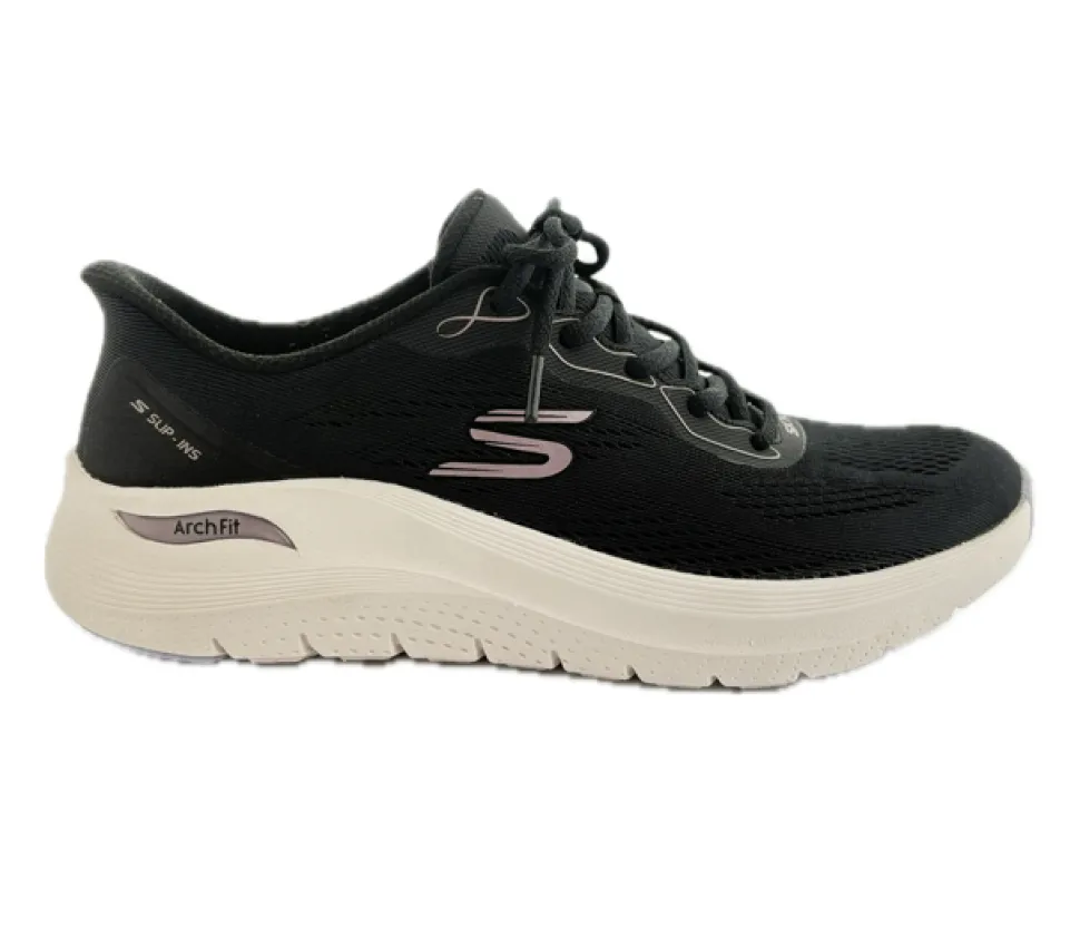 Super flotte sneakers fra Skechers med ekstra svangstøtte (Arch Fit). Flot i sort med lyse såler. Det er er en snøresko med slip-ins effekt, så man kan træde i den uden at bruge hænderne. Husk den er stor i størrelsen.