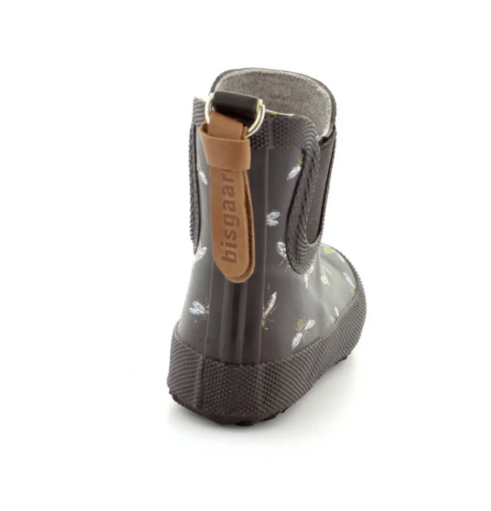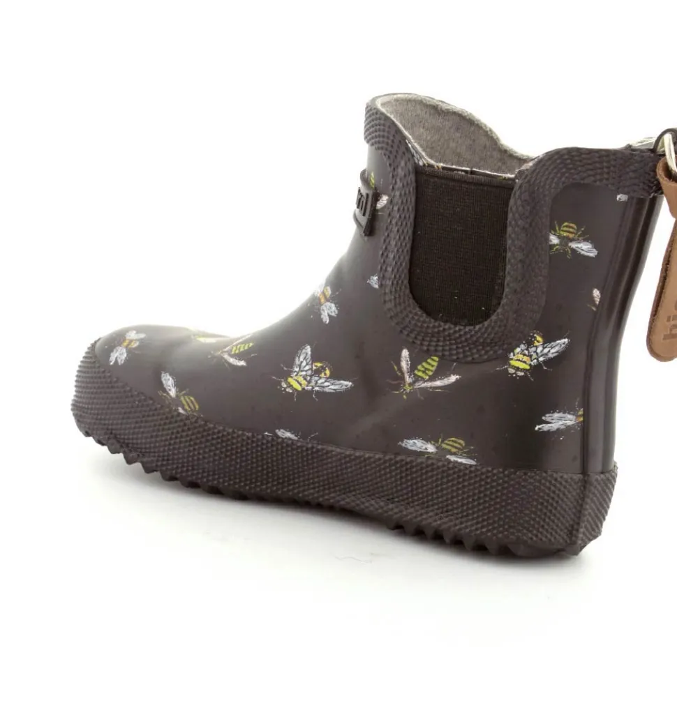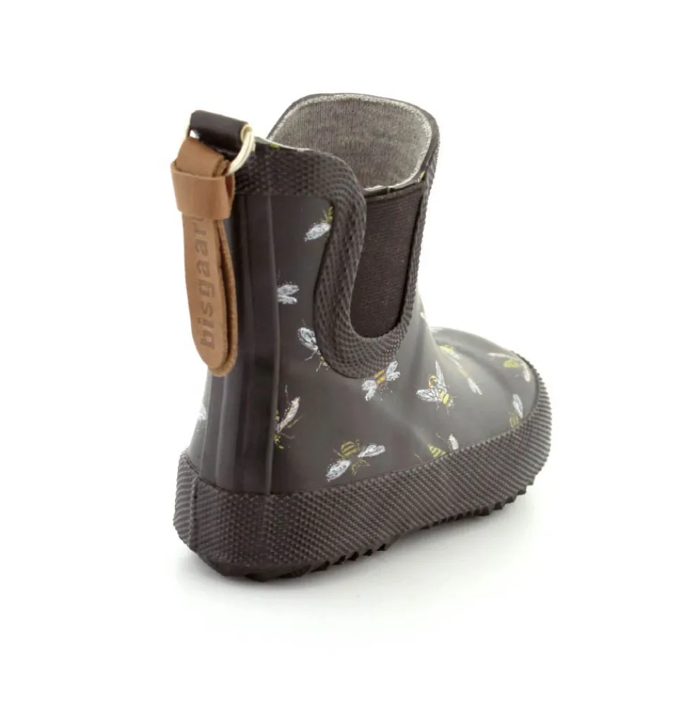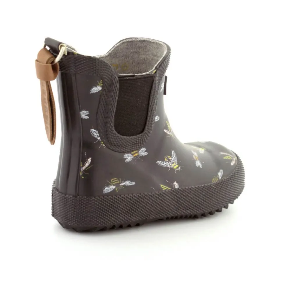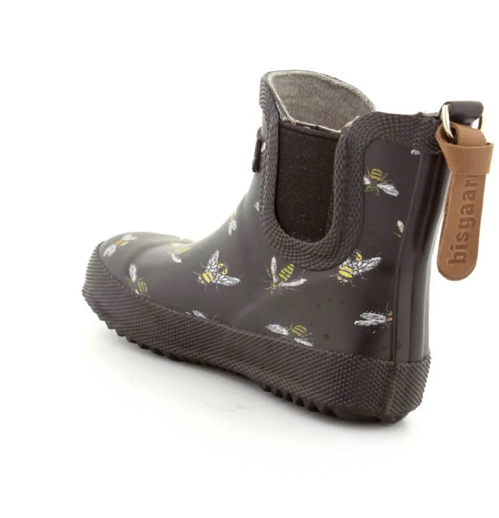 Super fine korte gummistøvler fra Bisgaard model Baby Bees, i sort naturgummi med små bier på. Støvlen er med elastik i siderne og er lige til at trække på. Blød og fleksibel med gummisåler og aftagelig indlægssål. Smart detalje med læderstroppen bagpå. Super god til de mindste.