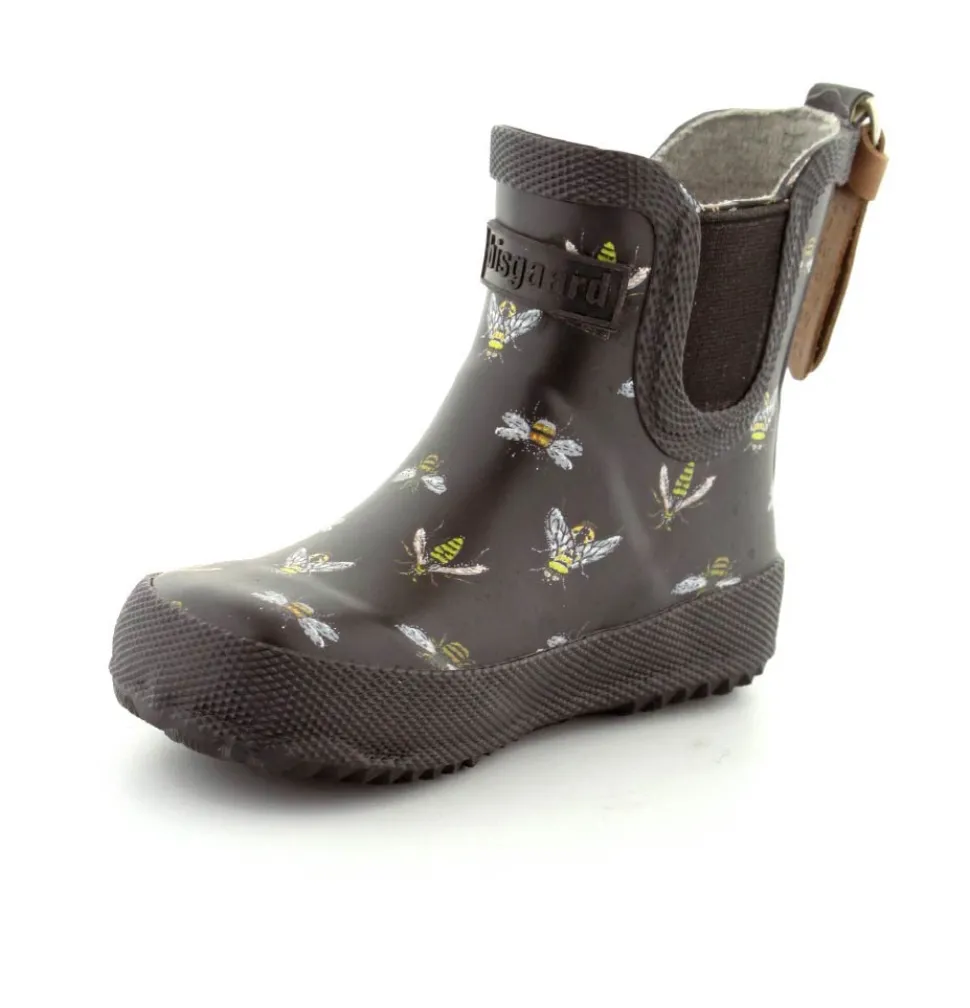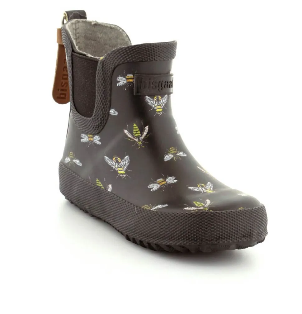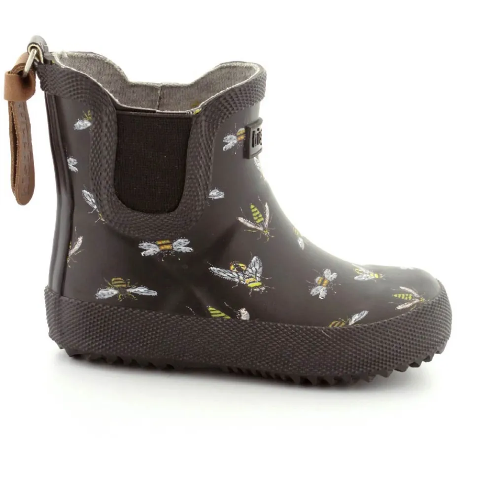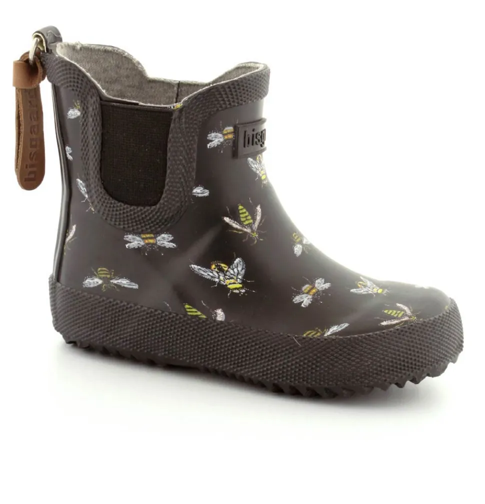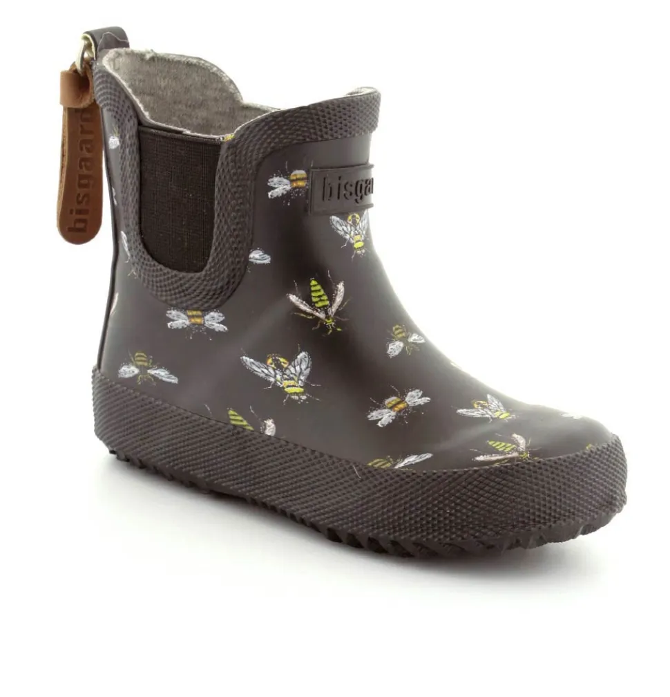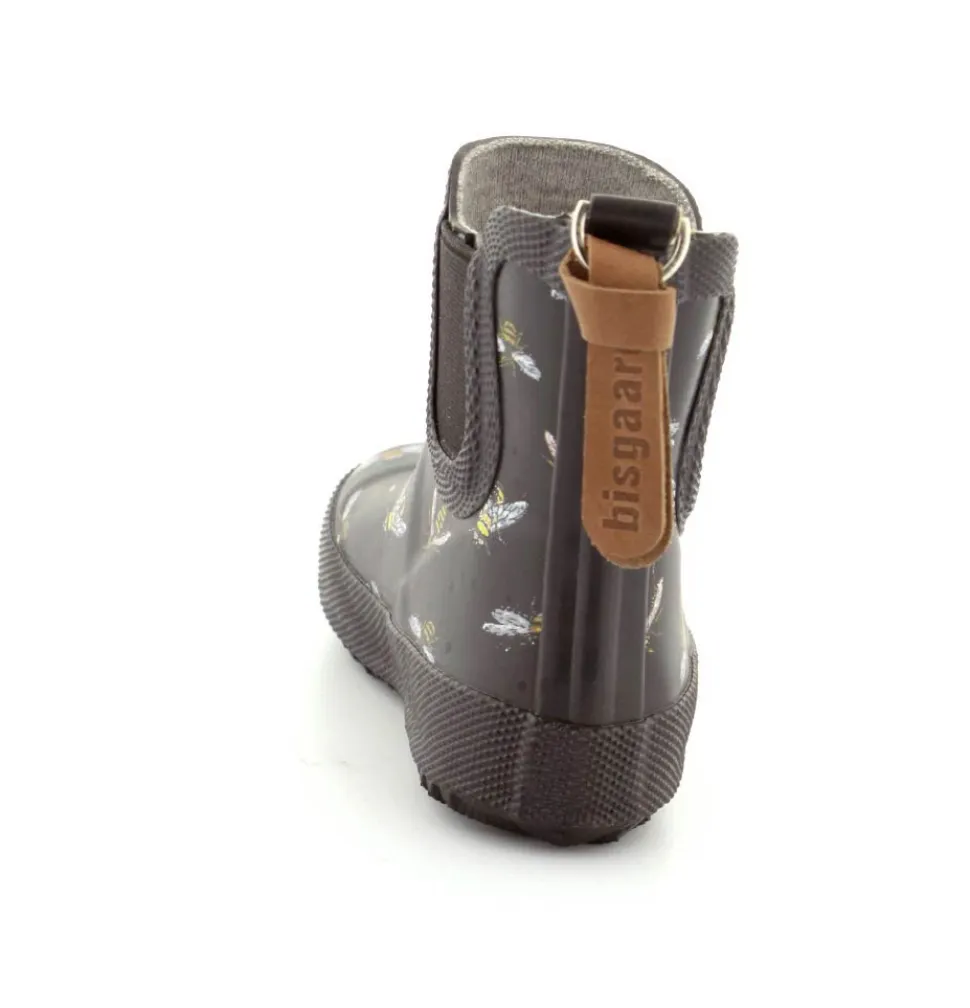 Super fine korte gummistøvler fra Bisgaard model Baby Bees, i sort naturgummi med små bier på. Støvlen er med elastik i siderne og er lige til at trække på. Blød og fleksibel med gummisåler og aftagelig indlægssål. Smart detalje med læderstroppen bagpå. Super god til de mindste.